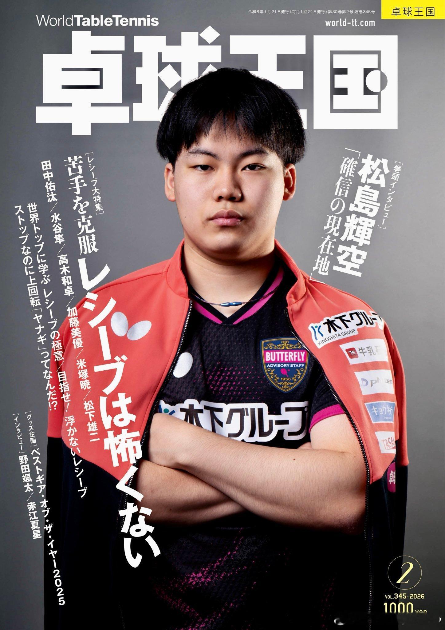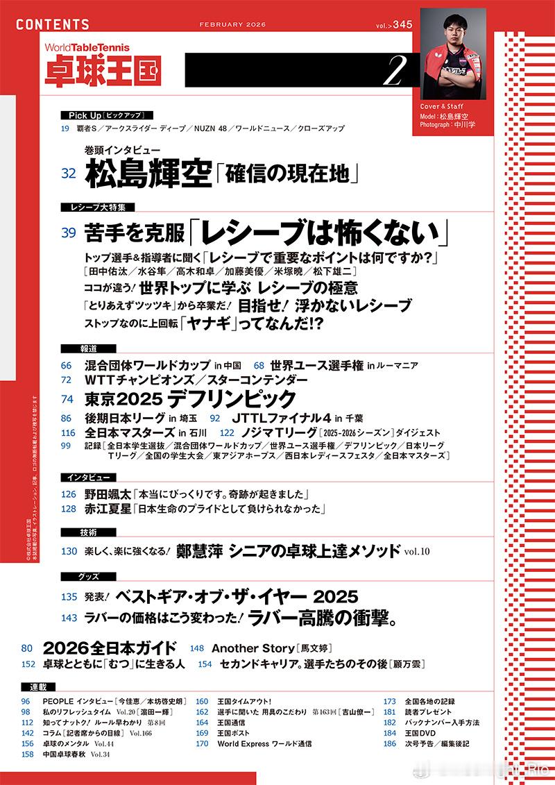 卓球王国2026年2月号于12月22日(星期一)发售。在封面及卷头采访中登场的是松岛辉空(木下集团)。包括WTT法兰克福冠军赛男子单打首次夺冠在内,在亚洲锦标赛与中国队的比赛中击败王楚钦等,最近一举跃升世界顶尖行列的18岁选手讲述了自己的现状。本期特辑的主题是“克服弱项 接发球并不可怕。”与上个月号的“挡球特辑”相同,分为几个板块深入探讨接发球技术,提升接发球水平。(机翻)