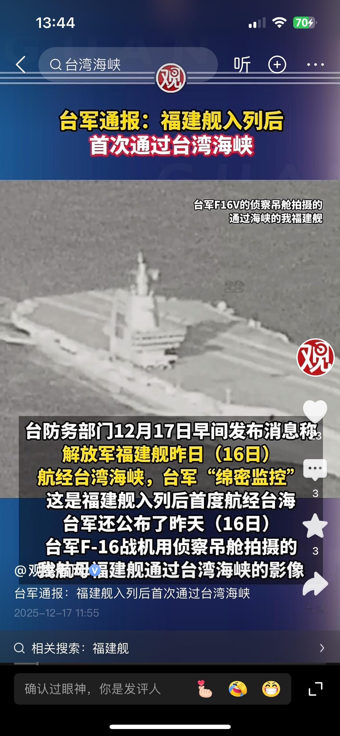 福建舰入列后首次通过台湾海峡,台防务部门称福建舰航经台湾海峡,台军“绵密监控”,怎么个“绵密监控法呢? 就是使用台军F-16V战机的悬挂侦察吊舱对福建舰进行拍照,拍摄通过台湾海峡的影像资料! 不过感觉这F-16V吊舱侦察设备拍照不够清晰,怎么还是黑白照片,给他打个差评!