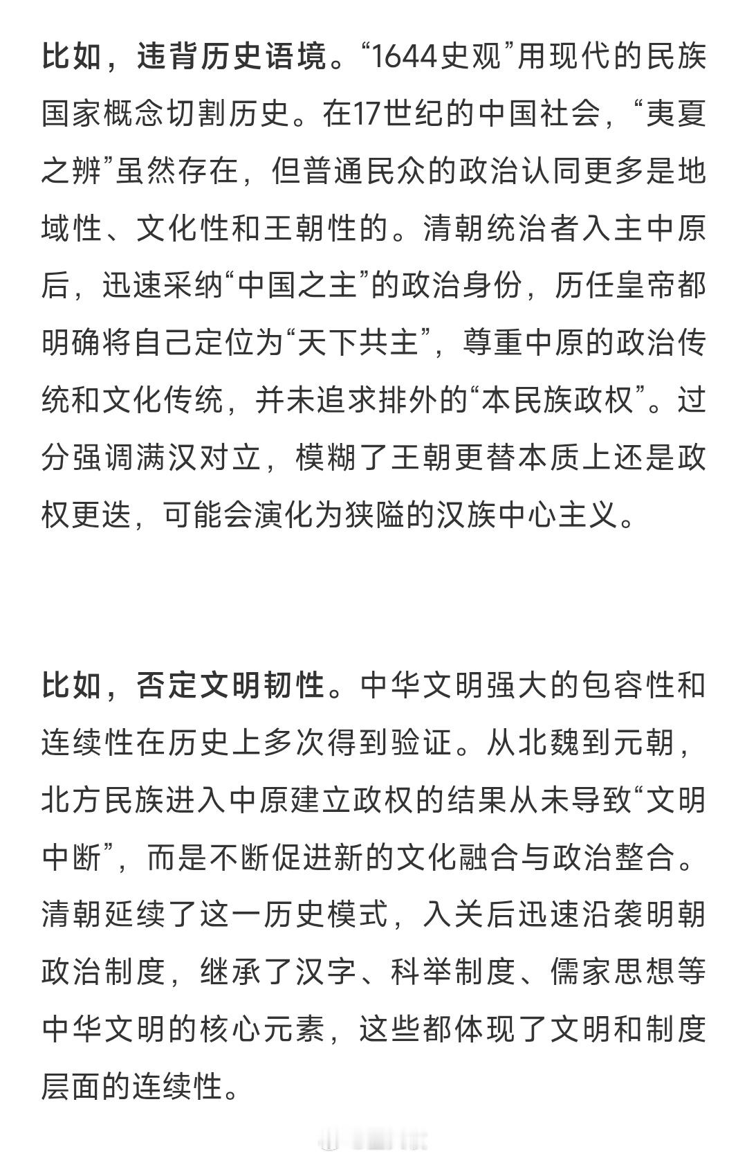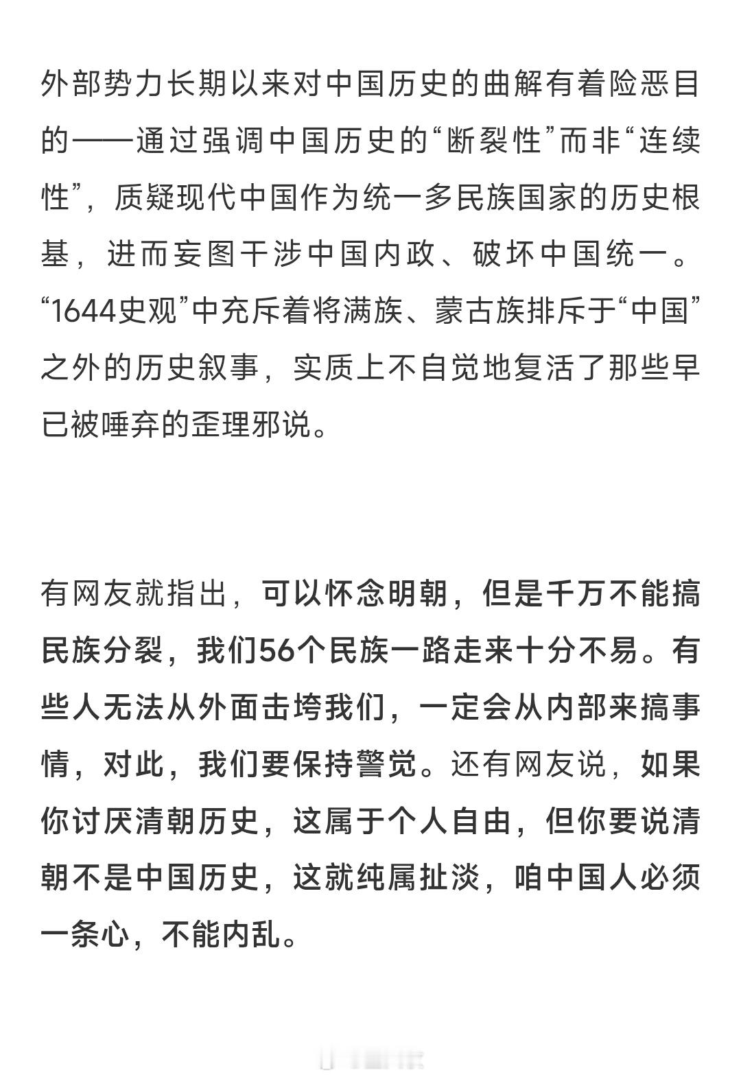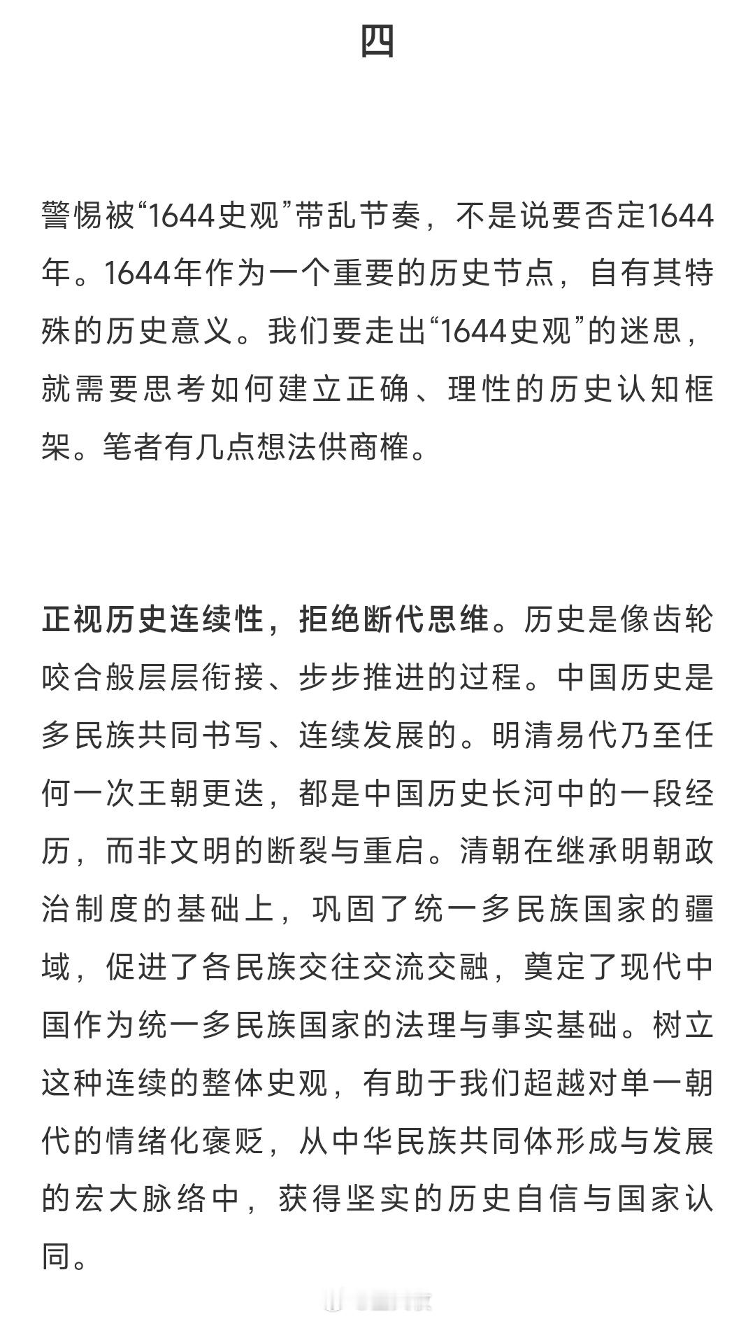 警惕1644史观带乱了节奏浙宣总结“清朝属中华”,理由有三:一、清朝奠定现代中国疆域版图二、清朝历任皇帝尊重中原政治传统和文化传统,以“天下共主”居之,并未追求排外的“本民族政权”三、清朝入关后,迅速沿袭继承汉字、科举、儒家等中华文明核心元素四、清朝促进了各民族交流交往交融仅供大家参考,理性讨论、实事求是,增加了解,增进共识。