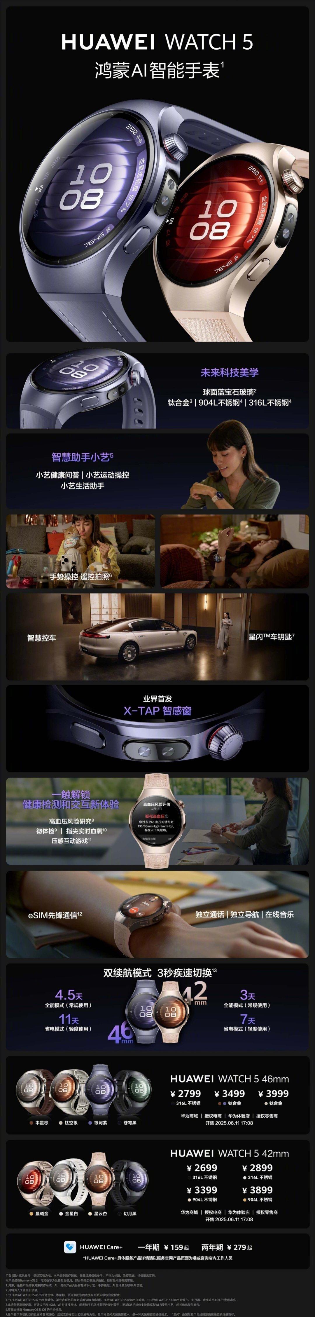 【华为 WATCH 十周年款智能手表官宣,12 月 22 日发布】华为终端官方公布了一款手表新品 —— 华为 WATCH 十周年款。据介绍,这款新表将在 12 月 22 日 14:30 举行的 nova 15 系列及全场景新品发布会上亮相,宣称“十年铸就经典,腕间再掀新篇”。华为 WATCH 十周年款预热海报小字如下:本产品非医疗器械,所提供的健康数据、结果、建议等仅供参考,不作为诊断和治疗的依据;部分数据来源于第三方健康研究项目,需单独激活,特定人群不适用,使用时请仔细阅读用户协议等提示信息了解详情。华为 WATCH 十周年款的外观与现款的 WATCH 5 十分相似,仅在配色和表带有所区分(十周年款的配色为浅蓝色,表带印有 10 周年的纪念字样)。作为参考,在今年 6 月 11 日举行的华为 Pura80 系列及全场景新品发布会上,华为 WATCH 5 系列智能手表正式发布,该款手表也是首款星闪 / 鸿蒙 AI 智能手表,售价 2699 元起。