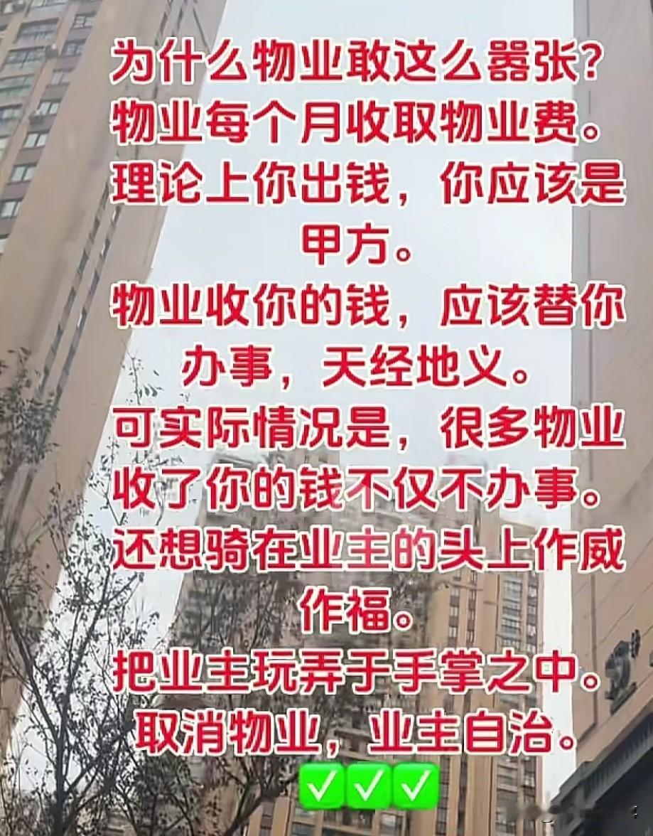 又到了一年一度的催缴物业费的时候了!看看网络上到处都是关于围绕物业费缴与不缴的口水战。干物业的是有一万条理由说自己收物业费合理合法,你不缴物业费不合理不合法!业主也是有一万条理由说自己不缴物业费合情合理合法!可谓是公说公有理,婆说婆有理。我就在想了!你说家庭雇一个保姆吧!用于不用,都没有那么多秧子,那物业不就是业主花钱雇来的保姆吗?为啥就消停不了呢?回头又一想,不对,不一样!家里雇保姆要是感觉不合适,可以随时换,而物业则不成,一旦入住了,想再换不可能!大有请神容易送神难的味道。为啥会这样?这个问题值得反思。昨天晚上一个以前在郑州干物业的,现在调去了外地干物业的熟人,说到关于物业费物业和业主打官司方面,他说,如今他们那里把渠道都理顺了!该买通的都买通了,他们和业主的官司,物业从来没输过!让我听的是脊梁沟发凉!可以这样说,目前,物业和业主的矛盾应该是最底层社会最普遍的矛盾,矛盾的焦点就是物业费。一方要收,一方不缴!不缴的原因也几乎相同,就是业主说物业服务不到位,物业说我该干的都干了,你不缴就不行!衡量标准不唯一。民生无小事儿,物业与业主的矛盾问题应该也必须引起官方的高度重视,尽快规范化物业管理,尽快出台强有力的管理条例,尽快落实推进各个小区业委会的成立应该是解决诸问题的关键。