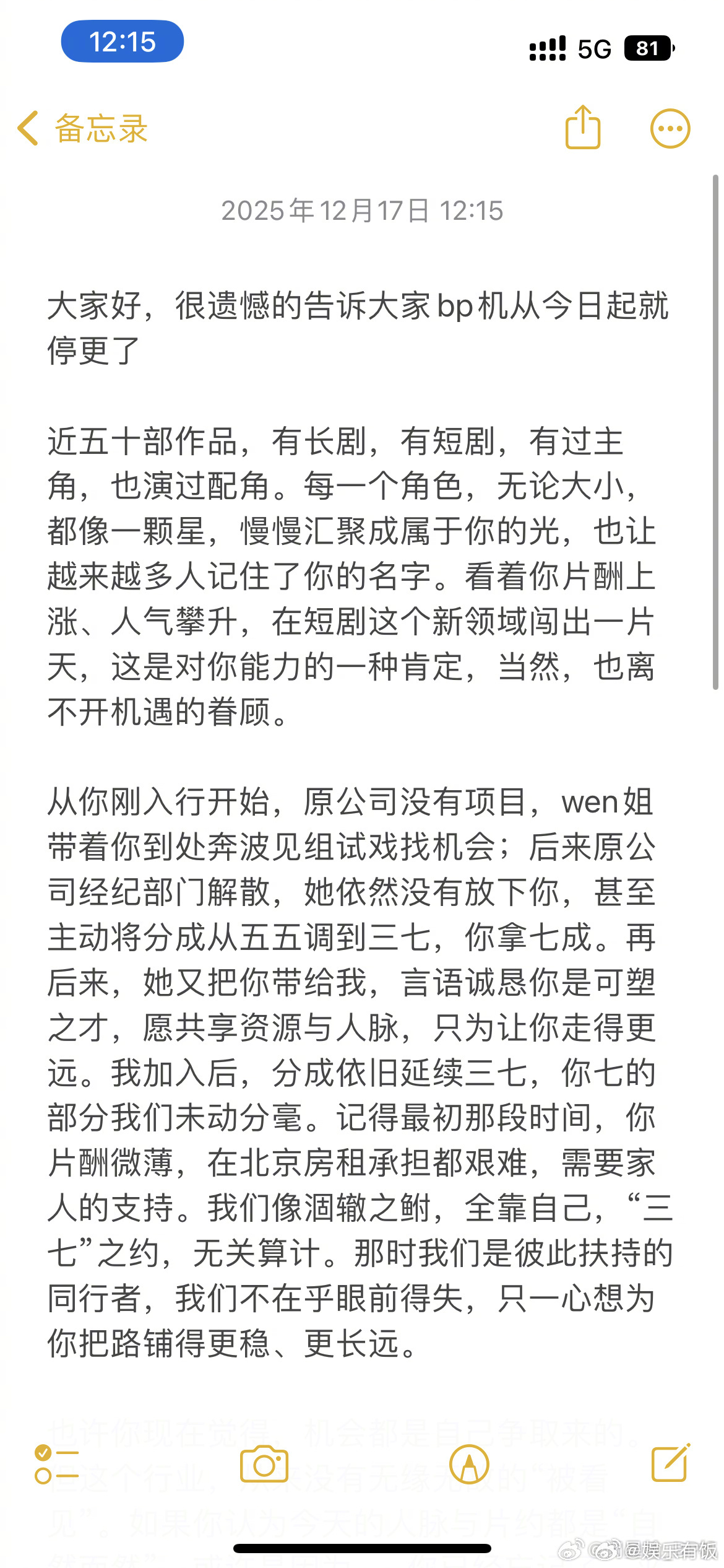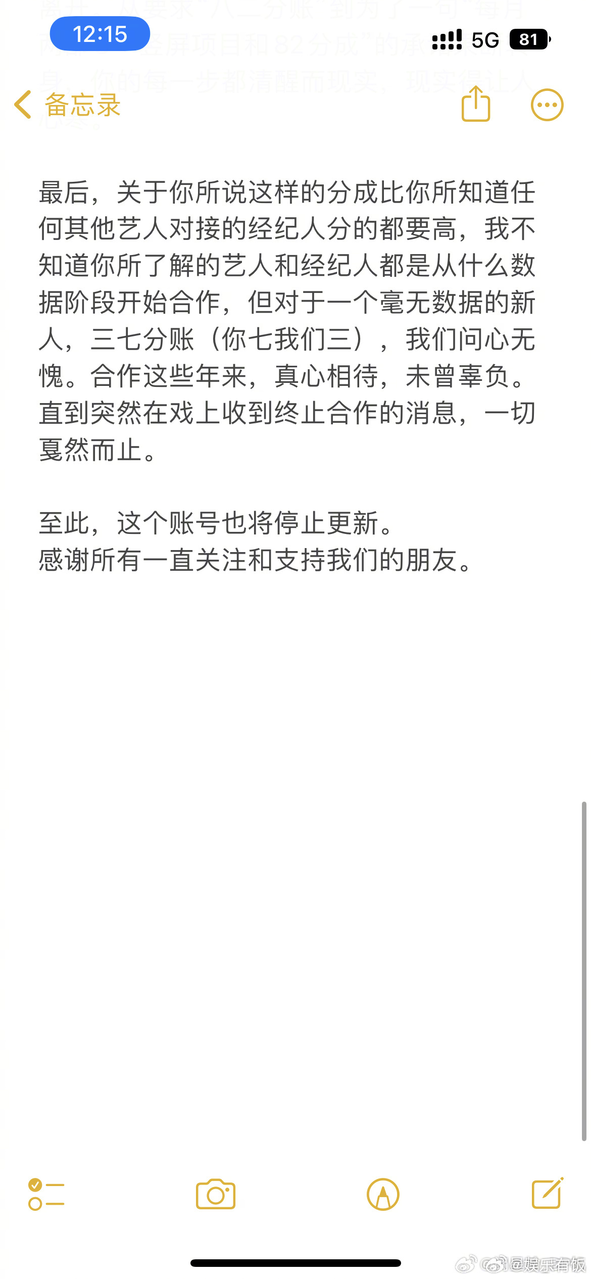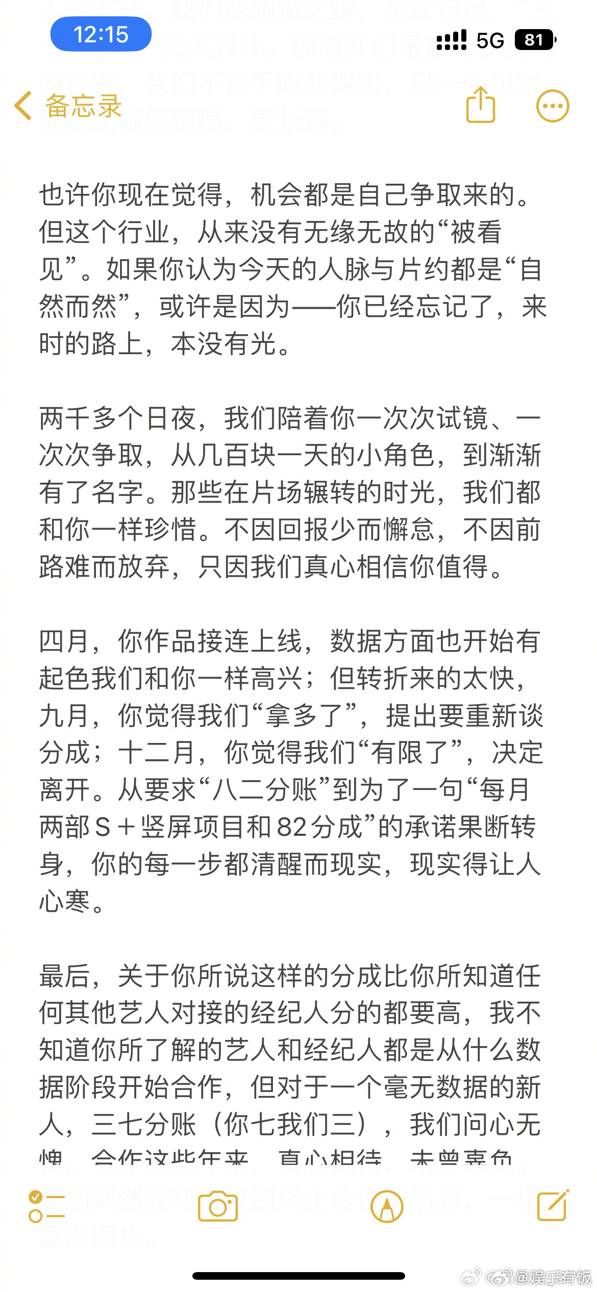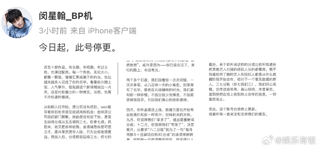 闵星翰和公司因分账分歧终止合作经纪公司称短剧男主不满三七分账 17 日,短剧艺人闵星翰的经纪账号发布停更声明,透露双方已因分账争议终止合作。声明中,经纪方回忆了与闵星翰的合作历程:从其入行初期原公司无项目时,团队带他奔波找机会,原公司经纪部门解散后主动将分成调为 “三七分(艺人拿七)”,后续也延续该比例;闵星翰从片酬微薄的新人,逐步在短剧领域积累人气、片酬上涨。但今年 4 月作品数据起势后,双方关系生变:9 月闵星翰认为团队 “拿多了” 要求重谈分成,12 月以团队 “有限” 为由决定离开,并因其他方承诺 “八二分成 + 每月两部 S + 项目” 选择解约。经纪方强调,对新人采用 “三七分” 已属诚意,合作多年真心相待,却突然收到终止合作通知,因此决定停更账号。