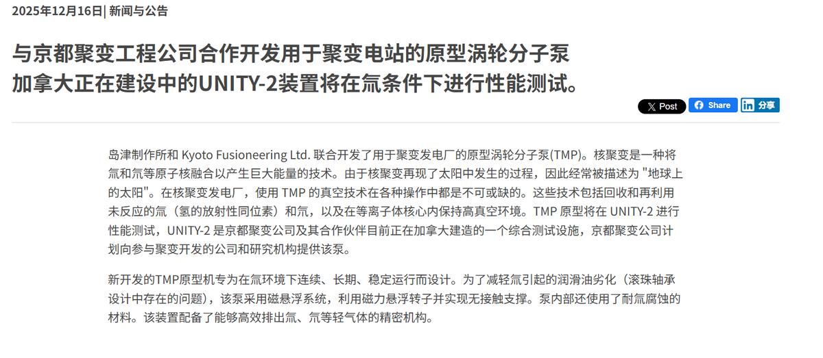 日企自称这一技术领先中美,中国花15年都造不出来,日网民沸腾:小心中国人来偷 近日,日本一家名为“京都融合”的核聚变技术专研公司接受了记者探访,期间,该企业的首席运营官世古圭向记者吹嘘一个装置:“这个装置中国人拼命造了15年都没造出来,美国也想造类似产品,但也没造出来”。 经过资料查询和视频画面对比,世古圭所说的装置是核聚变技术中的等离子体加热的回旋管系统。而一群不懂行的日本网民看了报道,直接是集体沸腾,称“日本的核聚变尖端技术正引领世界”,还有人煞有其事地表示“一定要保护好机密,小心中国人来偷”。 没想到,日本人自己就爱偷技术(日企“东京威力”此前被曝偷窃台积电2纳米芯片技术),现在反倒来以小人之心度君子之腹,而且事实也并非世古圭说的那样,中国根本不可能眼馋日本的技术,因为我们才是这项技术的引领者! 先简单介绍下核聚变技术所需的严苛基础环境:我们需要将氘氚等离子体加热至1亿摄氏度以上,并且长时间保持,才能克服库伦排斥力,产生聚变效应。 而世界上目前能做到在该温度下,让等离子体稳态运行1000秒的国家,只有我们中国一个,就是在今年,有“人造小太阳”之称的“东方超环”,在成都创下了1066秒的运行新纪录。 另外,在Grok等AI的解答中,中国的整体核聚变技术都被认为领先于美日等国,处于世界最前列。 有人可能会好奇,这家瞎说的日企,真实成色到底如何?通过一份最新公告显示(图4),“京都融合”正在让装置在单一氚环境下进行性能测试,这和我国的进展差得不是一星半点。 所以说,搞科研不是吹牛皮,这家日企可以在镜头面前随便说大话,但成果不会说谎,日本网民在自嗨前也该核实核实,不要坐井观天。