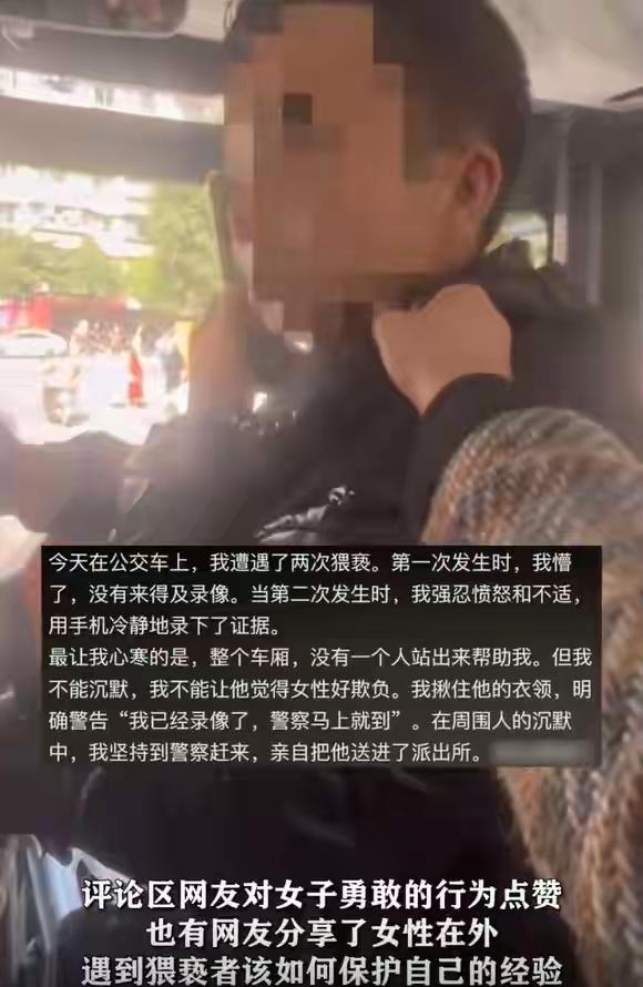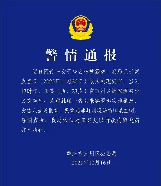 重庆男子公交两次摸女乘客屁股,全车人看戏,警方查实后拘留了。 2025年11月20号重庆万州一辆公交车上,发生了一件让人憋屈的事。一个23岁女生坐车时被旁边陌生男的动手动脚,先是摸屁股没被抓现行,后来又继续犯浑,女生这回赶紧掏手机拍视频。两人对峙到警察来,车上十多个大人愣是一个都没帮忙,就当自己没看见。 视频发网上后炸了锅,大家看到田某一直嘴硬不承认,但女生拍的影像证据足够清楚。最后警察根据视频调查,确认了猥亵行为,把田某行政拘留了。女生算是讨回公道,但整件事里其他乘客的态度实在让人无语。 女生后来在社交平台说,当时车厢里没人敢站出来。她说自己不能沉默,不然下次对方还会下手。但那些看戏的人可能觉得“事不关己”,或者怕搞错被骂。其实田某的动作挺隐蔽的,有些人可能真没看明白发生了啥,但大部分应该就是觉得多一事不如少一事。 女生录视频的做法确实给其他受害人做了参考,田某两次动手都被拍下来,这说明现在手机取证很重要。女生一开始可能因为害羞没吱声,但第二次直接掏出手机,这种冷静应对反倒让证据更充分。要是没有录像,他肯定死不认账。 警察这次处理得很及时,但要改变大家冷漠的态度,估计得慢慢来了。有时候帮忙可能真会遇到麻烦,但完全不管也是不对。最后女生虽然赢了,但这件事暴露的问题,恐怕不是拘留一个人就能解决的。