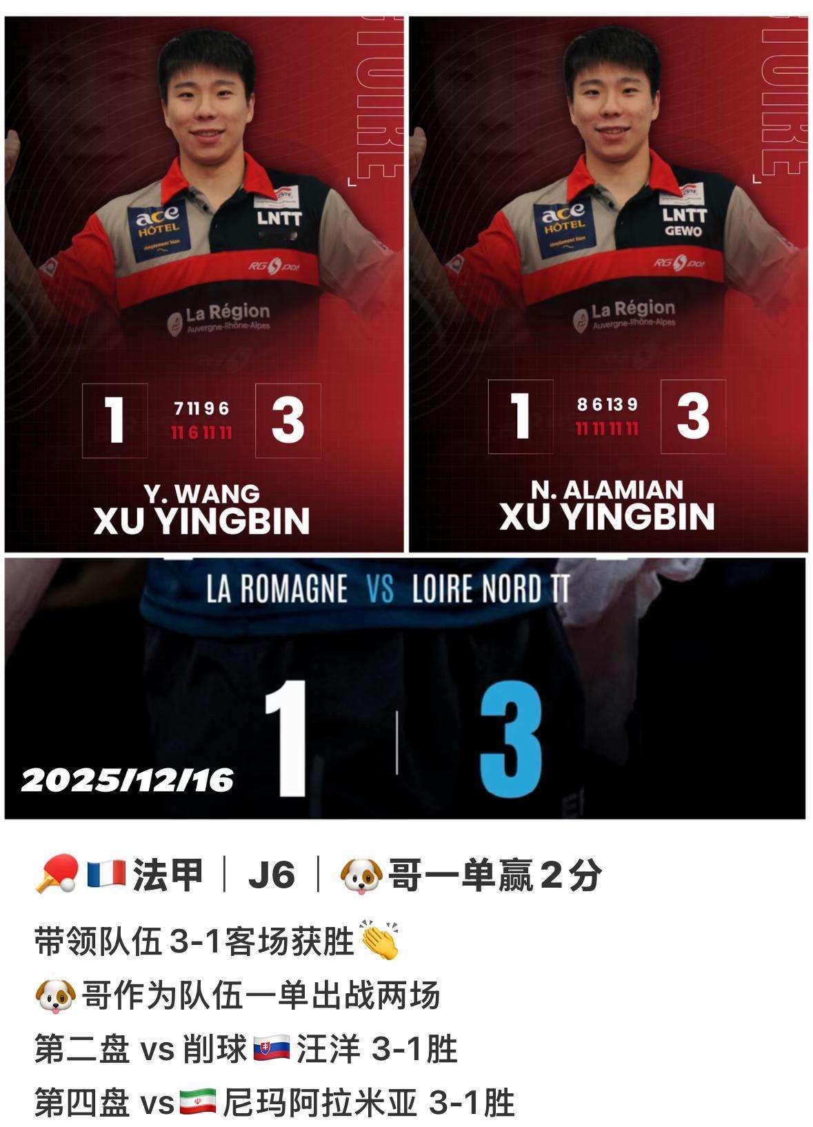 徐瑛彬法甲首胜——带领队伍3:1客场获胜 新科世界冠军果然大补, 徐瑛彬打法甲一单二分, 带领队伍客场挑战获胜! 徐瑛彬上次打法甲成绩也不错, 还赢了小布, 陈垣宇,温瑞博,周启豪在同一个俱乐部打法甲, 两天前,陈垣宇打一次主场 赢了就走了,温瑞博这几天 正在打,而且还赢了阿鲁纳…… 国内新生力量都出去打法甲了, 非常正常, 法乒小将出现在国际赛场上都非常 年轻,未来一定会是国乒的劲敌, 国乒小将多出去锻炼一下也好!