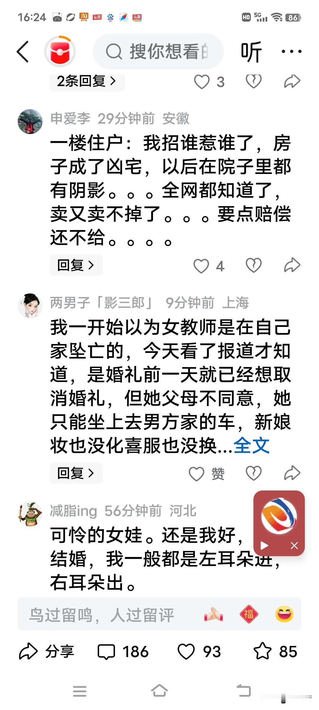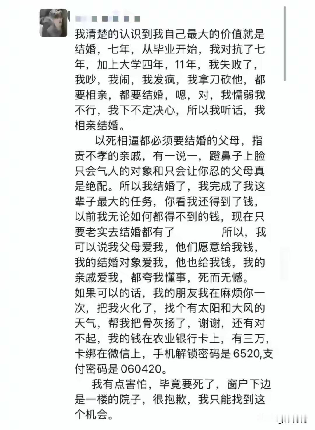 女教师结婚当天跳楼坠亡,这是承受多大的心理压力?非要选择这条不归路?男的也算倒了八辈子霉,陪了夫人又折兵,还要用一生消化阴影。 28岁女教师真的不应该!对婚姻不满意可以说不,父母逼婚可逃婚,也可这个耳朵听,那个耳朵出,就当耳旁风。因为什么事情能逼出人命? 你是一跳“走”了,从此再无烦心事。可怜的你想过没有,谁家的父母不是盼着儿女成家立业?“小棉袄”说没有没有了,父母的心不痛吗?他们怎么面对未来的生活? 男的够倒霉的,20万彩礼打了水漂。结婚,喜事变成白事。这心里阴影要用一生去消化,你说他亏不亏? 还有楼下人家新买的房子,人还没入住,她纵身一跳变成了凶宅。找女方索赔,说是女儿结婚了,找婆家要。找男方索赔,男方说还没结婚到家,不算男方人,叫找她娘家。又是一个难题。 有网友说,“死都不怕,还怕逃婚吗?所有事情都不算事,你应该珍惜自己的生命。” “说一千到道万,都是女孩父母逼婚逼死了女孩!奉劝所有的父母,不要说为了孩子好再去逼婚了,这是血的教训。” “她的性格叠加她的环境,造成一场人生悲剧。如果她遇上理解她的人或者干脆不理他们,就不会发生这种事情。” “如果领结婚证了,她就算婆家的人,法律认的是证据,不是人情世事。男方赔钱少不了的。” 你说这事情怪谁呢?