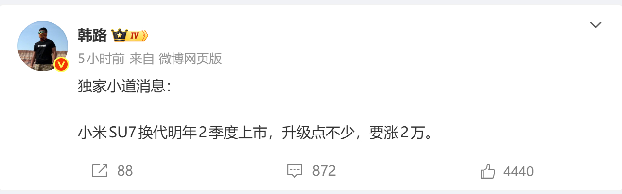 曝小米su7新款明年2季度上市 韩路说小米SU7新款将将涨价两万,明年2季度上市,说是独家消息我的建议是,即便是真涨价,想入手现款的消费者完全可以等等,改款多数情况下会比现款要成熟,尤其是这么多争议的情况下我个人猜测:新款会改掉半隐藏式门把手,而改为传统的门把手;另外,标准版的算力,84TOPS那版,应该不会再出现了