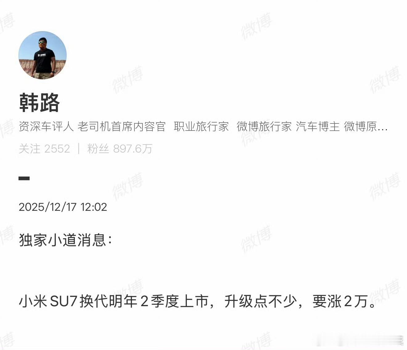 韩路说他有独家小道消息,小米SU7换代明年2季度上市,要涨价2万。大家信不信?小米SU7换代或涨价2万元