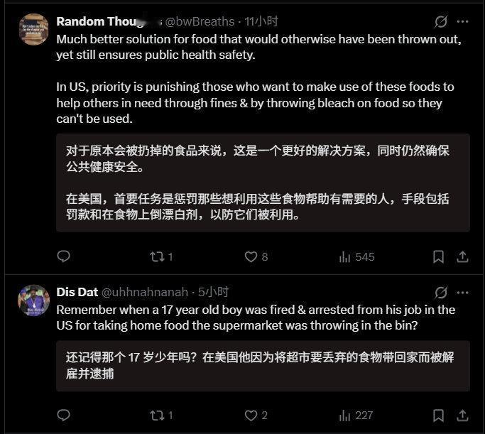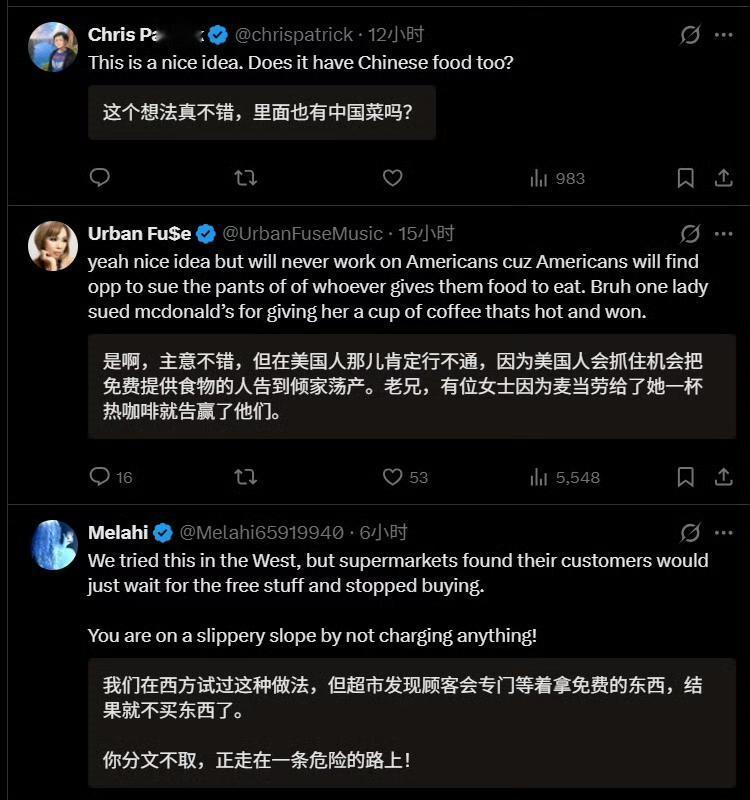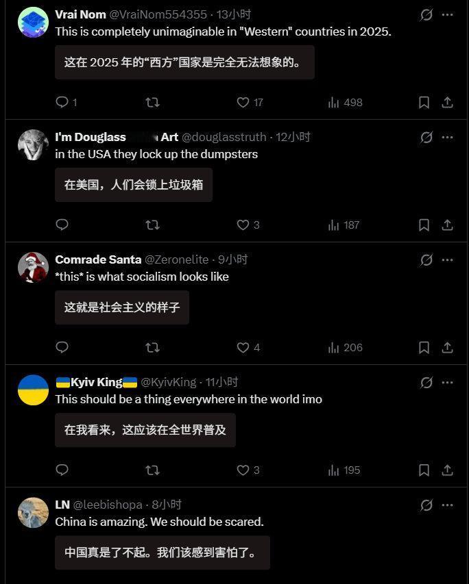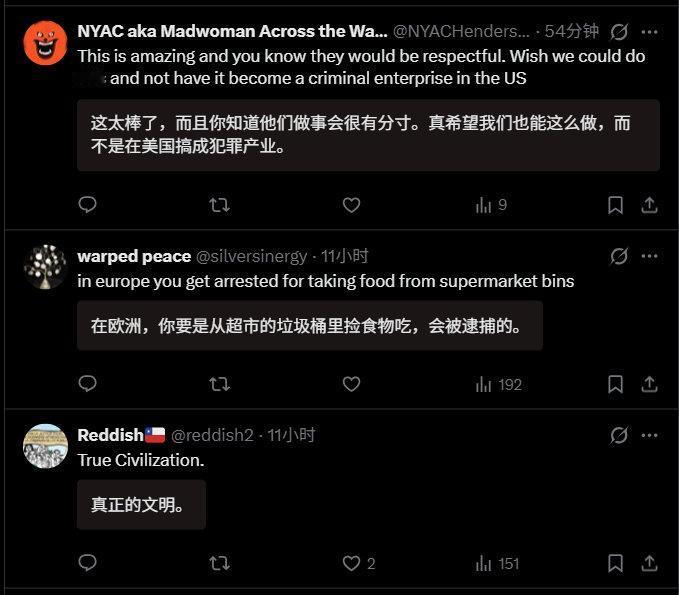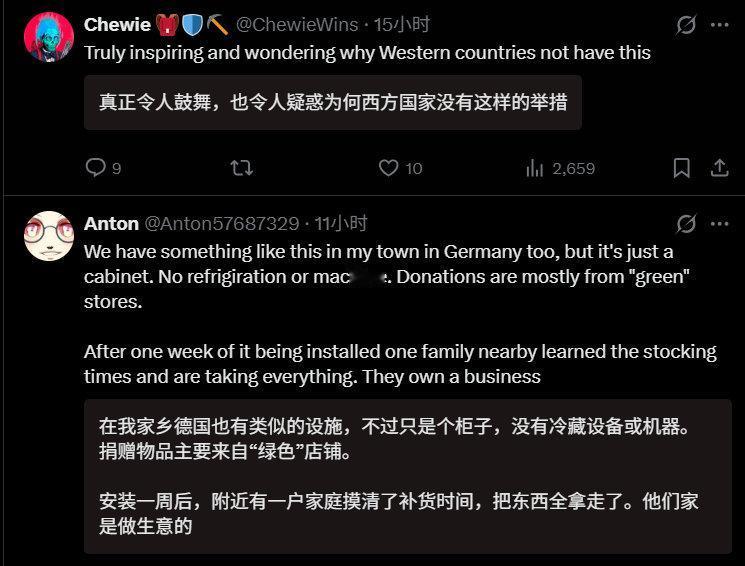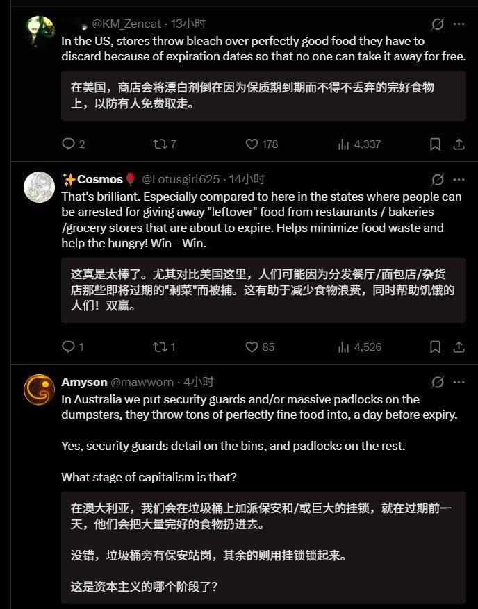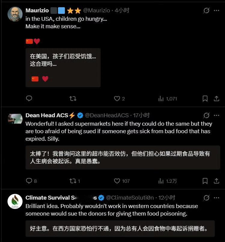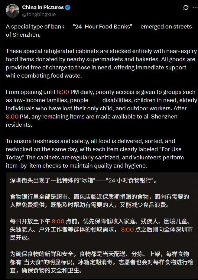 深圳食物银行在外网火了,真正的文明在东方。 外网网友:“你知道,这要是在美国或欧洲,天亮前一切都会被拆散偷光。” “好主意。在西方国家恐怕行不通,因为总有人会因食物中毒而起诉捐赠者。有人会趁机把免费提供食物的人告到倾家荡产。有位女士因为麦当劳给了她一杯热咖啡就告赢了他们。” 食物银行里全部是超市、面包店临近保质期捐赠的食物。临期食品,仅指临期,但食品质量没问题,每天换新。全天开放,晚上8点前供有需要的人,晚上8点后则向全体民众开放。 晚上8点,这个时间点很有讲究。晚上8点前,中坚打工人都在上班,不愁吃饭,也没时间来领取。确实适合弱势群体、有时间有需求的人领取。8点之后,还愿意去拿的,给了也就给了,腾空,反正第二天要换新的一批食物。 政府主导,志愿者志愿帮忙,管理成本有限,但却温暖了人心。
