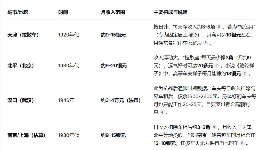 光看图五,乍一看,民国时期的黄包车夫们,一个月的收入还真不少,养活一家子完全足够了呀。 但是为啥一提起黄包车夫,就觉得他们很苦,养不活自己呢? 难道是骆驼祥子的影响力太大,给我们留下的固有的印象? 其实,光看收入数字可能没感觉,还需要对比当时的物价和开支,才能明白车夫生活的艰难。 就以30年代的北平作为参考。 当时,北平一个三口之家每天仅食物开销就需25-40枚铜元。而当时一碗馄饨加三个烧饼约11个铜子。车夫收入在支付车租和基本伙食后所剩无几,难以养家。 而且,很多车夫是没有钱买车子的。 祥子一辈子的梦想,就是拥有属于自己的一辆黄包车。 很多车夫都是从车行租车,每月都要给车行缴纳高昂的份子钱。 在1920年代的天津,新车日租约50多枚铜元,此外还要缴纳名目繁多的“捐税”。 到1946年的汉口,每日车租已涨到300-400元法币。 除此之外,拉车是极重的体力活,车夫们通常每日工作10-12小时。因劳累过度、生活条件恶劣,很多车夫甚至活不过40岁。