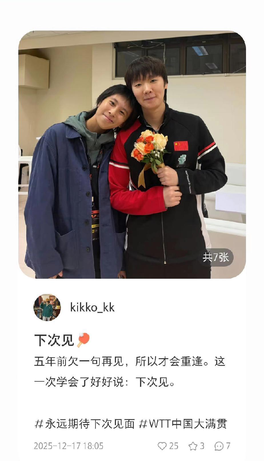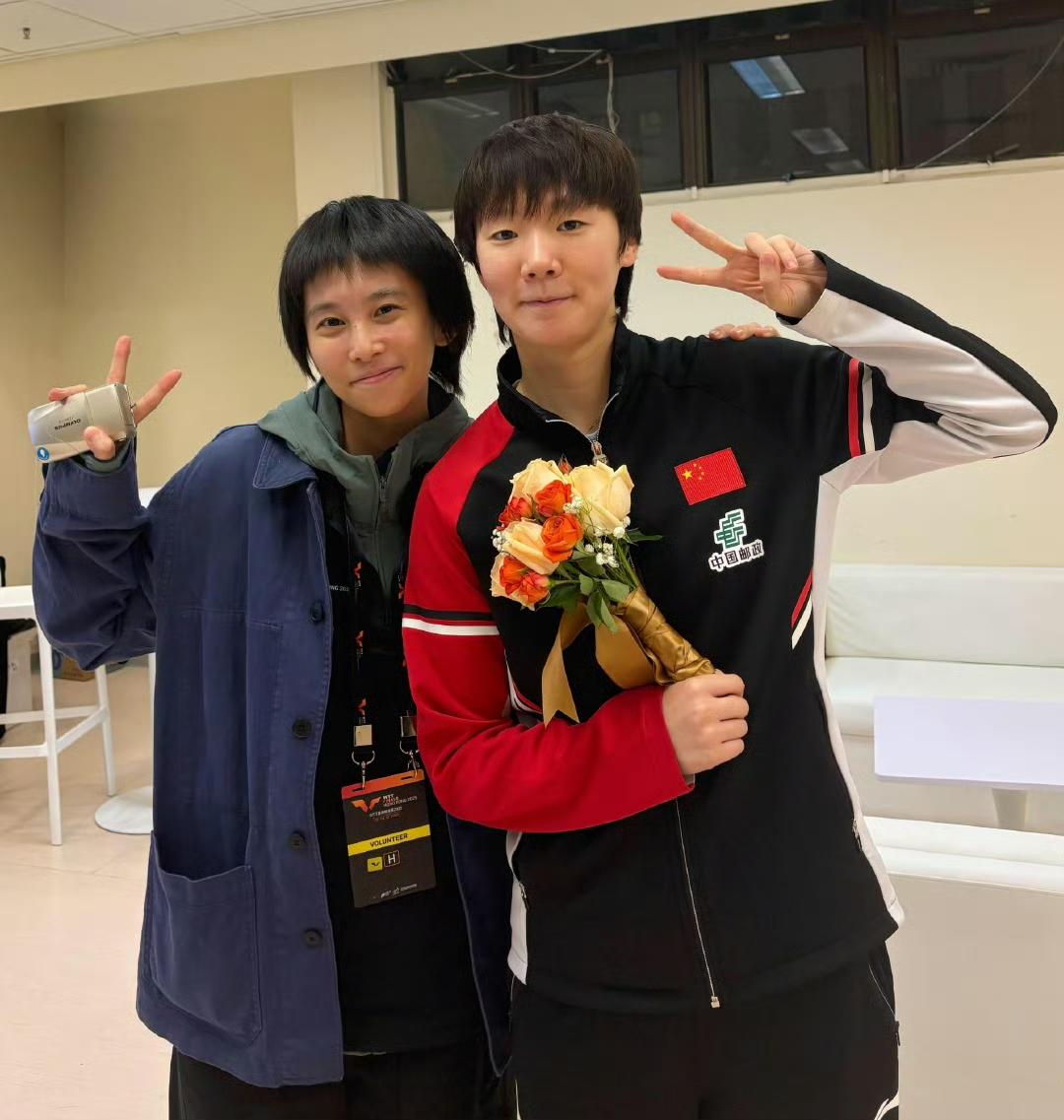 王曼昱与小青梅陈可再同框,WTT香港年终总决赛女单卫冕后台合影! 奥运冠军王曼昱早期在国家队的女双搭档陈可也去看了WTT香港年终总决赛的女单决赛。与最终卫冕女单冠军的王曼昱在后台合影! 看得出来,王曼昱和小青梅关系依旧亲密。两个人时隔很久同框,脸上都带着浅浅的微笑! 陈可曾在2017与王曼昱搭档,获得亚锦赛女双亚军。 陈可退役后,选择在香港进修。后长期生活在香港。 这次WTT年终总决赛在香港举办,陈可有机会来到现场观赛,为自己的小青梅奥运冠军王曼昱加油!最终王曼昱女单卫冕更是为两人的重逢创造美好时刻!