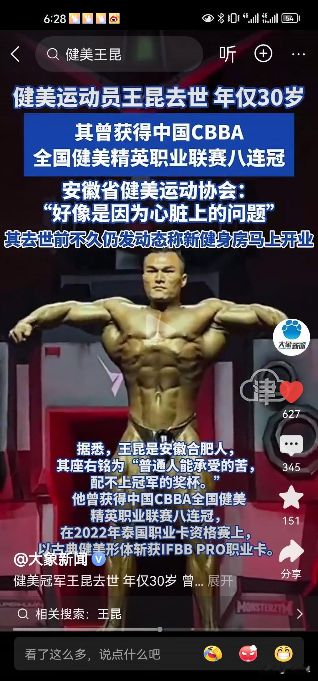 看到这个新闻确实不知怎么表达啊,90 后八连冠的健美冠军病逝,你看,你看他的身材美吗?我觉得不美,已经过分的健美了,他这种身材说不好听的,我觉得有点像那种僵尸的线条。其实健身房的人都知道,他想维持那种那种肌肉,都是靠蛋白粉,和一些外用药来增加的。已经过量了,所以我是不建议过量的运动啊,也许他为了健美是一种名利啊,为了得冠军,为了名利拿自己的健康来伤害,根本就得不偿失。