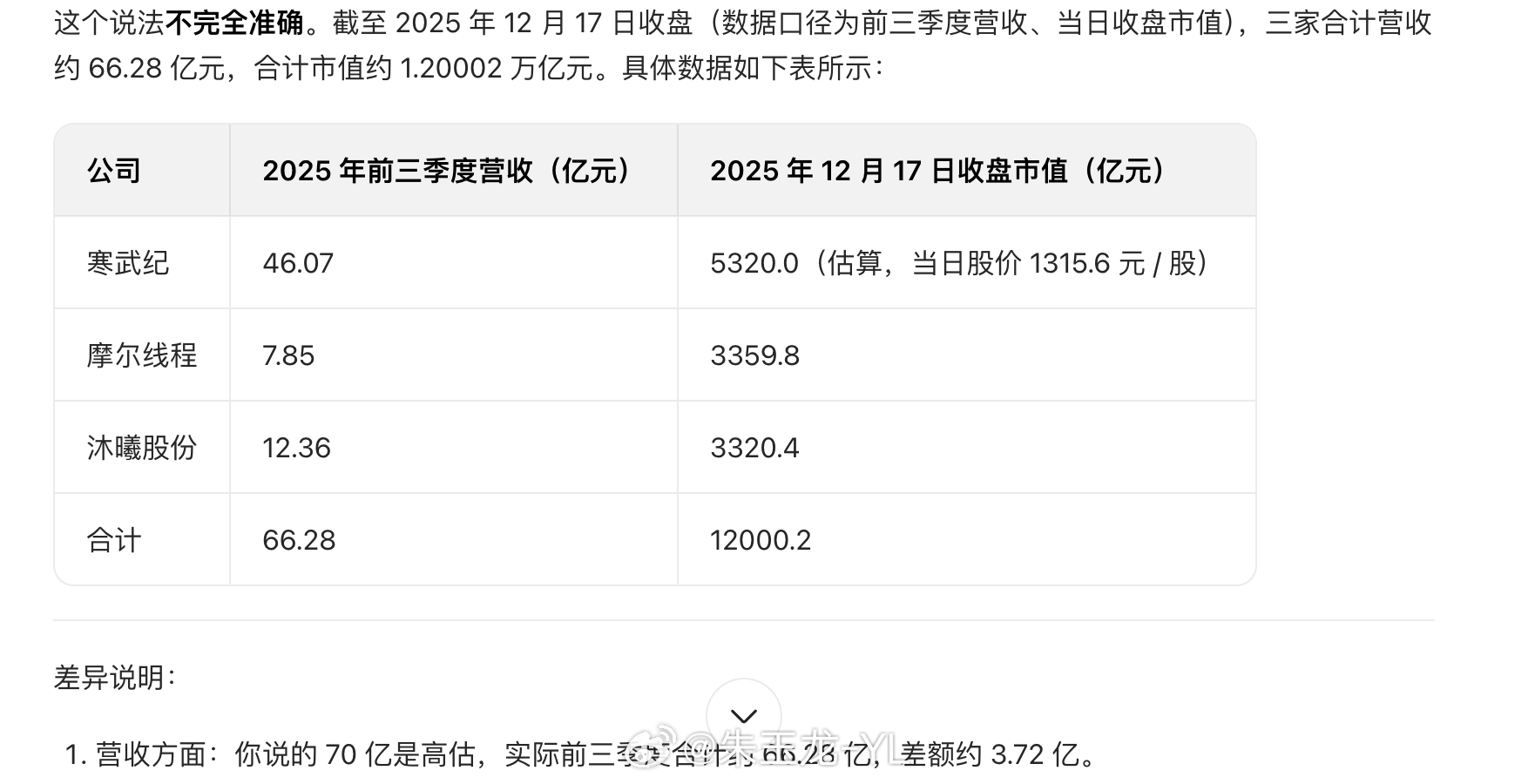群体有朋友说了一句,寒武纪,摩尔线程,沐曦股份,三家合计营收70亿,合计市值1.2万亿 。豆包说:营收方面:你说的 70 亿是高估,实际前三季度合计约 66.28 亿,差额约 3.72 亿。市值方面:三家合计约 1.2 万亿,与你的说法基本吻合 这是中国对GPU的梦想寒武纪摩尔线程沐曦股份