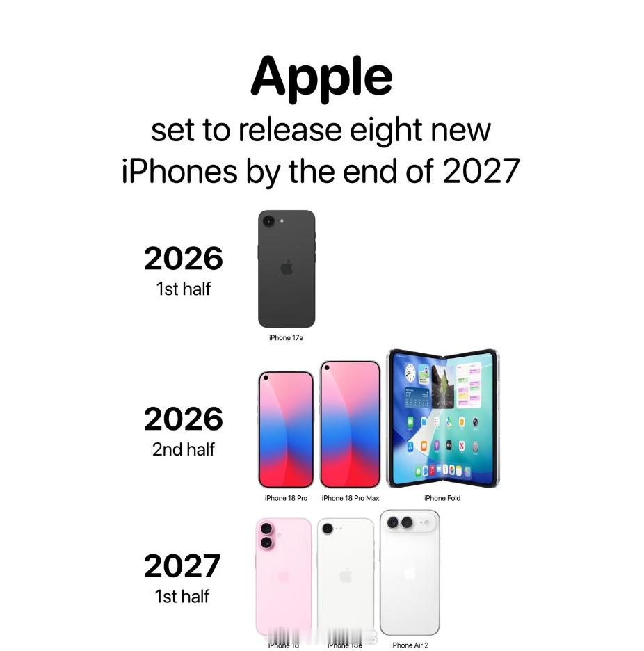 苹果计划发布至少7款iPhoneiPhone 17e(2026 春季)iPhone 18 Pro、iPhone 18 Pro Max、iPhone Fold(2026 秋季)iPhone 18e、iPhone 18、iPhone Air2(2027 春季)想买 iPhone 18 标准版的心要碎了,要多等几个月。
