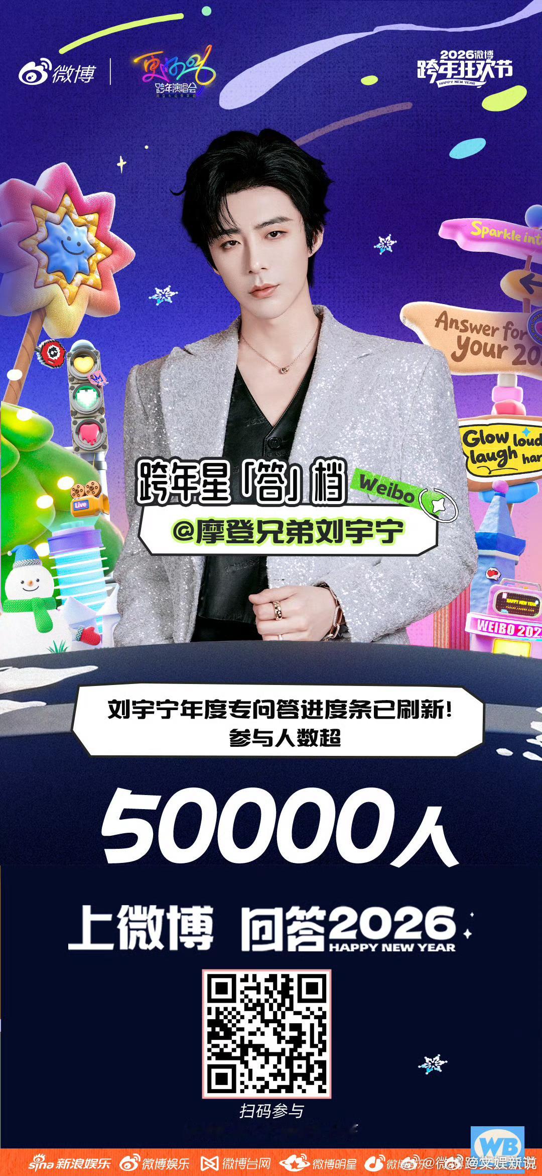 刘宇宁答题人数破5万请回答2026 恭喜突破五万!但福利不止于此——十万后的宁哥语音才是终极目标。你的参与,就是通往他声音的最短路径!👉参与【请回答2026】答人赛,攒跨年币解锁跨晚门票吧!微博跨年狂欢节