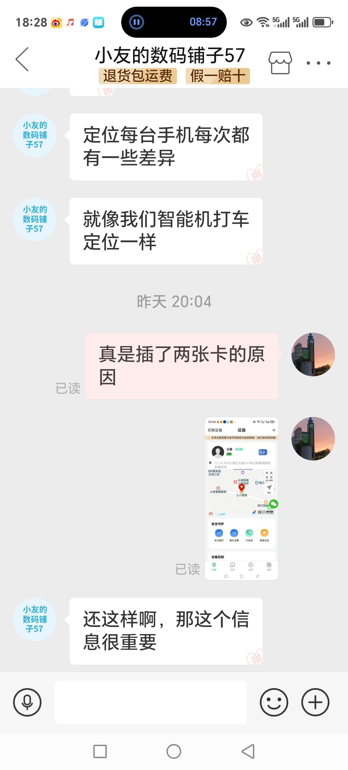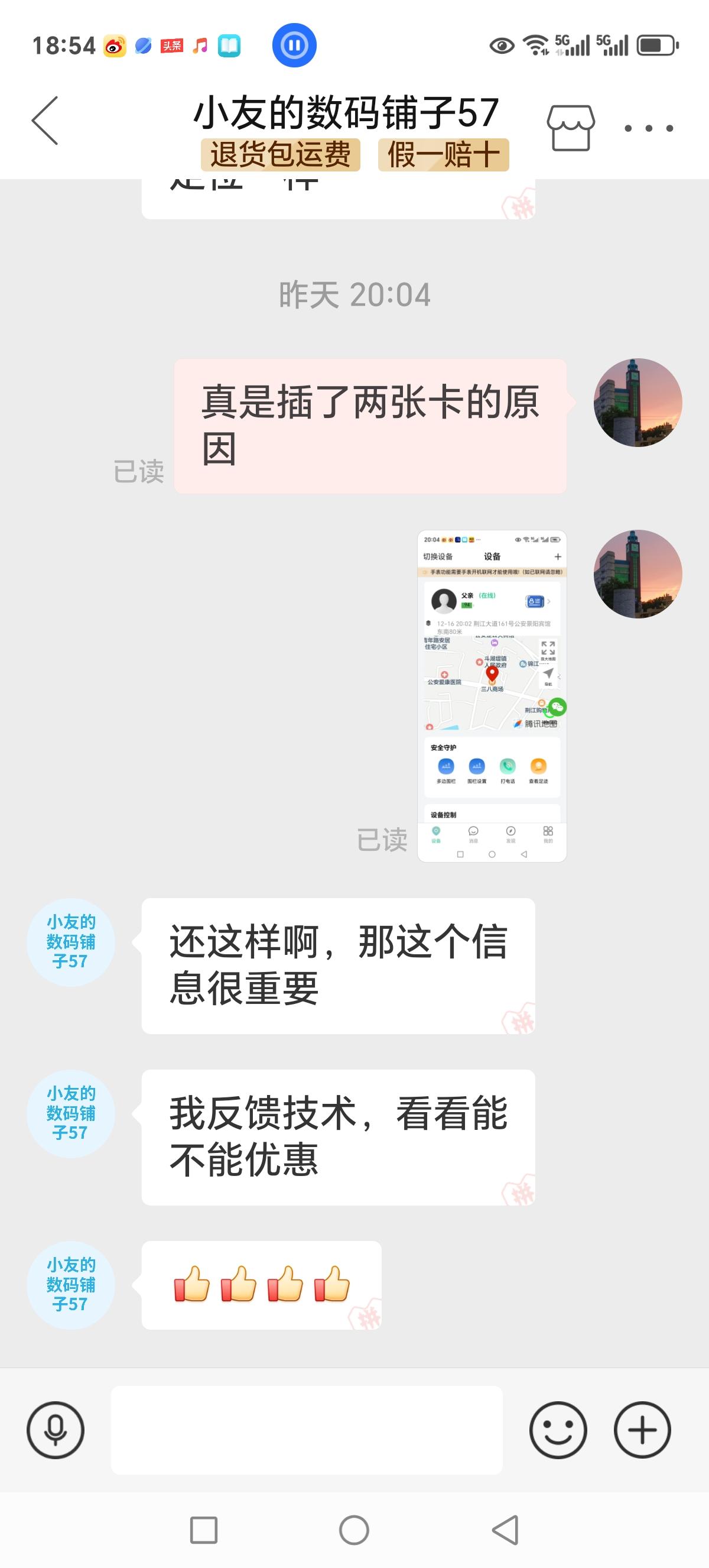 我家老年定位手机昨天出状况了。定位偏差向北200米,在同一个客厅坐着,智能手机显示要开车1分钟的路程。我肯定着急,询问拼多多客服,回答立即多次点定位。我照做了,没效果。我再次给客服提供线索:我昨天给老年机里又插了电话卡,准备换卡,会不会影响?客服不置可否,只答应请技术在后台看看。结果又向南偏差200米,我肯定是不答应的,客服几乎耍无赖了,说这个环境影响有偏差是正常的。昨天好好的,今天就有200米的偏差,这个定位机不就坏了吗?我不答应。客服没法,劝我明天再看,兴许就好了呢?我不死心,最后还是强忍着麻烦拆开手机,取下另一张卡,再装上电池。一看,手机定位正常了,又回到三八商场定位了。我赶紧告诉客服,客服也高兴了,说这个现象他们都不知道,一定要告诉技术,并为我竖起了大拇指。