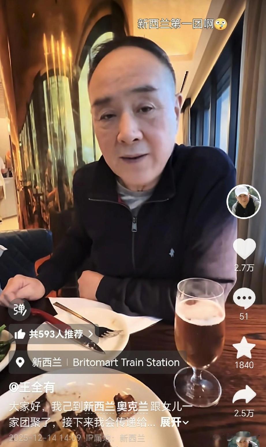《亮剑》电视剧中,“丁伟”的扮演者王全有移居新西兰了?这不,12月17号,本人亲自发声说:完全就是造谣呀,虽然坐在西餐厅,喝红酒,吃牛排,但是为了陪伴外孙女,谁不想和家人一起团聚呀,自己的根始终在中国,会回去的,请各位网友放心。 其实,仔细分析,王全有这个时间点飞去新西兰,正好赶上那边中小学生放圣诞假期,12月中旬开始,持续3-4周,没说谎,完全符合正常逻辑。 另外,了解王全有的网友都知道,还有95岁的丈母娘健在,一个女婿半个儿,时不时要去看望,否则不放心。从这点来说,也不可能定居新西兰,要是真有什么突发疾病,回来一切都晚了。