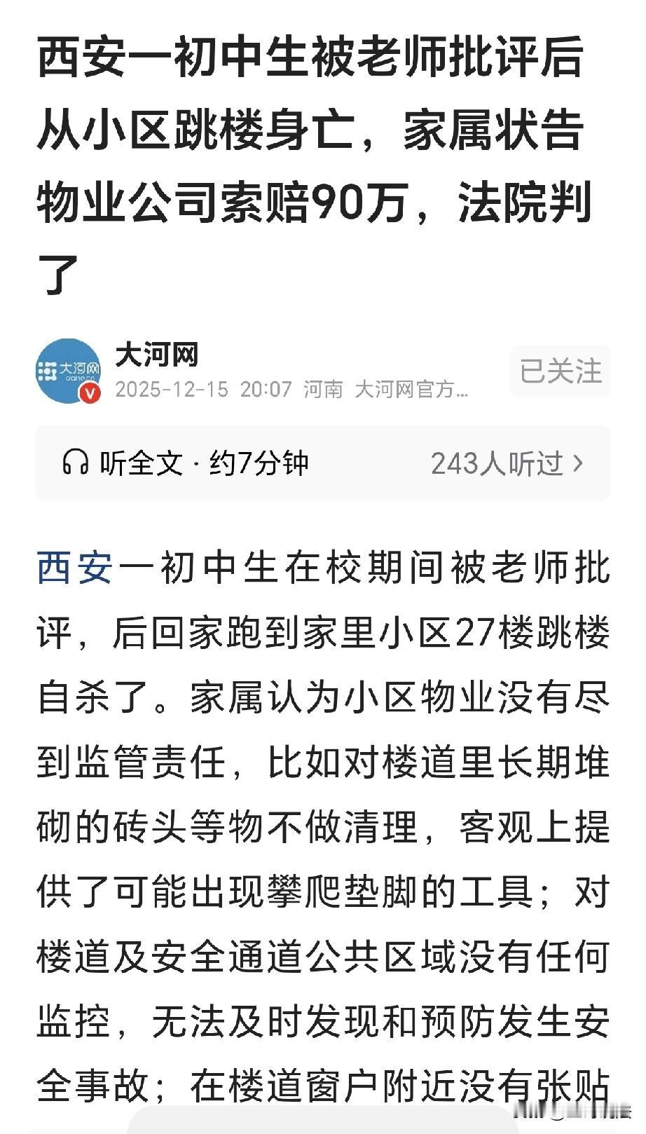 陕西西安,一初中生读课外书玩手机,被老师批评,他骑车回家,直奔27层,然后一跃而下,当场去世,家长悲痛欲绝,老师被开除,校长被免职,家长发现,楼道窗户下有四块砖,如果不是这四块砖垫脚,孩子也跳不下去,家长告到法院,向物业索赔90多万,法院判了! 小军是一名初一的学生,一家人租住在莲湖区某个小区。 2023年12月7日,晚上7:20分左右,夜幕已经降临,小军依旧没有回来。 小军家长有些着急,按照以往的惯例,这个时间,孩子早该回到了家里。 家长赶紧联系到了老师,询问老师小军是否还在学校?是不是没写完作业?还是因为其他事耽搁了时间? 尽管家长还在猜测孩子的情况,可是老师的回答还是将他们拉回了现实。 老师说学校早放学了,他们以为小军早就回到了家里。 家长一听顿时急了,小军既不在学校也没回家里,他还能去哪?家长急急忙忙就到周围寻找起来。 他们询问小军的同学,询问他平时要好的朋友,可没人知道小军的去向,家长心急火燎,他们拨打了报警电话。 谁知这时,物业工作人员也在小区内四处巡查,他们突然发现,小军家单元门口右侧有个人躺在地面。 物业走到跟前,这一看大吃一惊,竟然是小军的尸体,已经冷冰冰的没了动静。 物业赶忙通知了家长,家长到了现场,顿时呆住,随后他们嚎啕大哭,小军才上初中一年级,他还是个孩子,他能有啥想不开的? 警方立刻调取了监控,监控里显示,小军放学后推着自行车进到了电梯里。 电梯在27层停了下来,之后小军走了出去,他走到27层的楼道窗户,攀爬上去,他一跃而下,当场去世。 警方展开调查,排除了刑事案件,可是又非常的奇怪,这么小的孩子能有啥心事,何至于想不开选择了跳楼? 之后经过询问,家长告诉警方,出事的当天,小军在学校被老师批评了。 被批评的原因,是小军在学校看课外书,玩手机,被老师发现后对他进行了训斥。 至于老师对小军到底是怎么批评的,说的话是不是难听,是不是伤害到他的自尊,不得而知。 老师大概没有想到,小军被批评之后,心里十分的难过,好不容易等到了放学,他立刻骑上自行车就往家赶去。 等他进入到了电梯,越想心里越不是滋味,因此他一口气坐到了27楼。 也许他还有过犹豫,也许他的委屈已经积攒了很久,也许老师批评时说的啥都已经不重要了。 总而言之,能做的如此的决绝,小军也是下了狠心,生命如此的珍贵,他小小的年纪就能如此轻易的放弃。 他是否想到了父母的不易,是否会想到父母会因此痛断肝肠,泪流如雨? 可是没有也许,他决绝的跳下,付出了生命的代价,也许他早就有了这样的想法。 因为小军的事情,那位训斥他的老师被学校开除,校长也被免职了,学校给家长进行了赔偿,但是具体金额,家长没有说明。 按理来说,学校已经赔了,可是家长没了孩子,怎么想怎么难过,他们不知道孩子当时到底是咋想的。 家长思来想去,这事不能就这么完了,他们在小军跳楼的楼道里久久徘徊,试图了解小军的心情。 突然之间,家长发现,那个窗口下面搁置着四块砖头,家长脑海里突然闪现出来一幕。 这一幕十分的可怕,孩子一定是踩住砖头作为垫脚,这才会慢慢的爬上了窗户。 这也就表面,如果没有这四块砖头,就没有垫脚的地方,那么孩子就爬不上去,至少会有所犹豫。 也许孩子就会在这爬不上去的片刻,就能有所缓冲,也许会放弃轻生的念头。 这一切都是因为物业疏于管理,不能及时清理楼道里的砖头,也就因此给孩子提供了垫脚的工具。 家长又朝四周看看,楼道里没有监控,也没有张贴警示标语,这样一来,物业就不能及时发现危险,也不能预防事故的发生。 家长越想越气,认为这是物业不作为引起的事故,家长告到法院,要求物业赔偿90万元。 《民法典》第1198条规定:宾馆、商场、银行、车站、机场、体育场馆、娱乐场所等经营场所、公共场所的经营者、管理者或者群众活动的组织者,未尽到安全保障义务,造成他人损害的,应当承担侵权责任。 小军因为看课外书玩手机,在学校时受到了老师的批评训斥,他独自回家,但是坐电梯时,并没有回到租住的5楼家里,而是直接来到了27楼。 事发时小军已经年满12周岁,对跳楼带来的后果已经具备基本的认知和辨别的能力。 窗户下面的砖块并不能导致他跳楼自杀,小军从27层跳下,是他自己的主观意志导致。 与物业公司是否清理楼道内的砖块,以及张贴警示标语,或者设置监控等并没有直接的因果关系。 法院通过审查物业服务合同内容及《住宅设计规范》等依据,认定物业公司未违反法定或约定义务。 因此法院判决,驳回了家属索赔请求。 可家长不服,提起上诉,二审维持原判,驳回了上诉。 生命如此短暂,小军12岁的年纪,匆匆而来,又匆匆而去,孩子生前那一刻到底在想什么?不得而知。 关注@王哥说法 多学法律少吃亏!