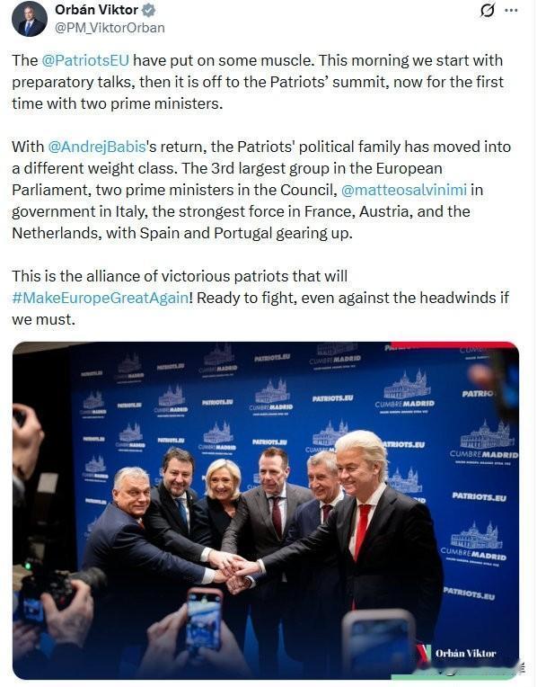 匈牙利总理Orban最新发文。 欧洲爱国者联盟已经壮大了。今天上午我们先进行预备会谈,随后前往爱国者峰会——如今首次拥有两位总理。 随着 Andrej Babiš 的回归,爱国者政治家族已跃升到新的重量级。我们是欧洲议会第三大党团,在理事会拥有两位总理,Matteo Salvini 在意大利执政,是法国、奥地利和荷兰的最强力量,西班牙和葡萄牙也在蓄势待发。 这就是将让欧洲再次伟大的胜利爱国者联盟!我们已准备好战斗,哪怕逆风也要迎难而上。
