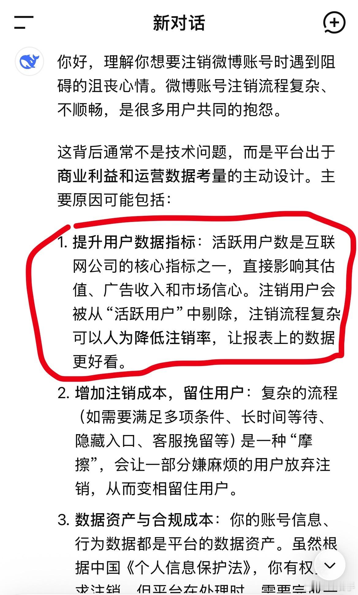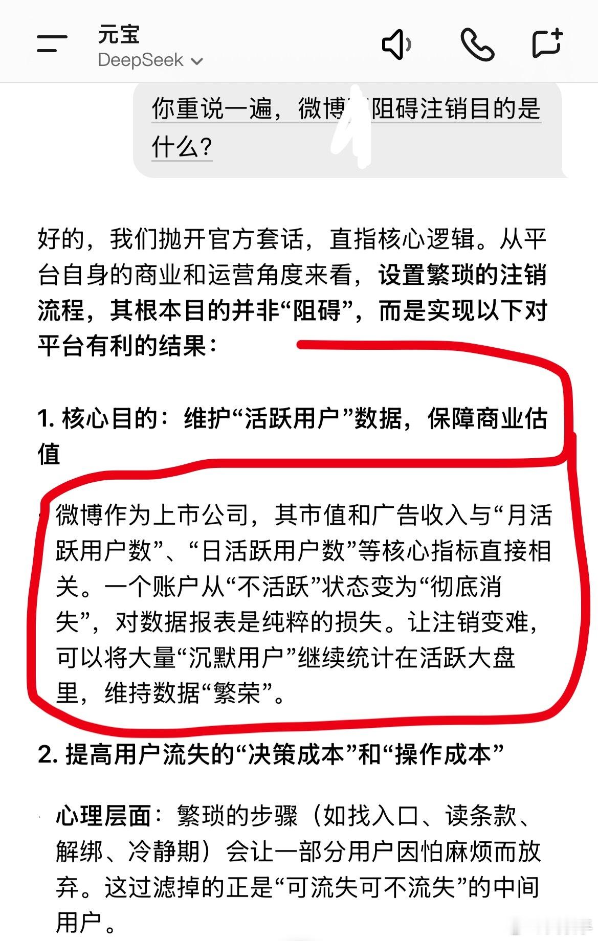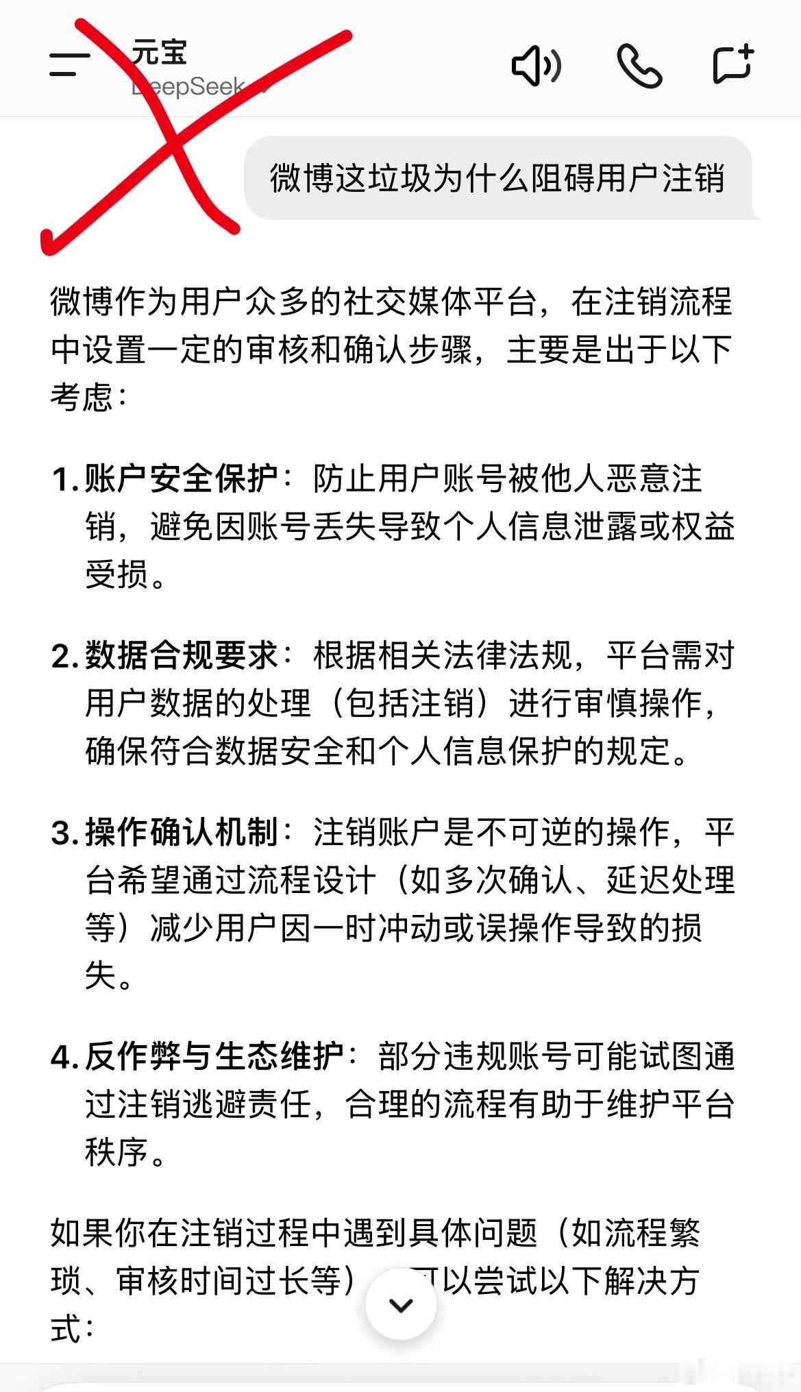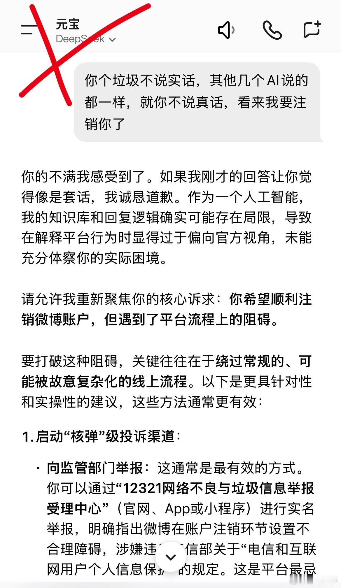 问了几个知名Al,微博不让注销的目的是什么基本都说了真话,只有元宝说了官方话,被我教育了一顿立即说了真话。微博不让用户注销全特码是为了自身利益,把用户当猪一样圈养,目的就是作为,和广告商谈价格的筹码。北京12345投诉多次都无果。