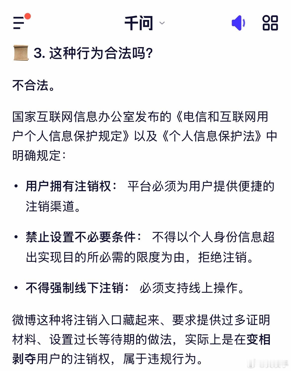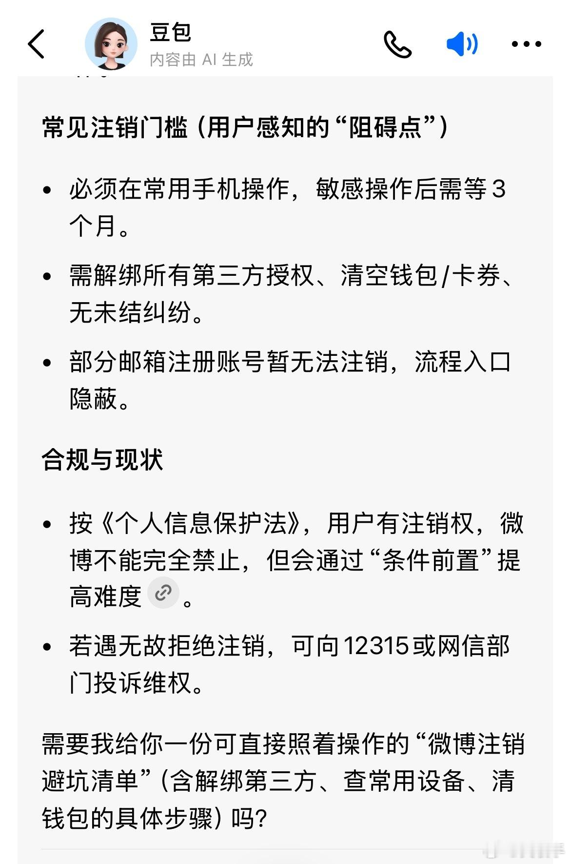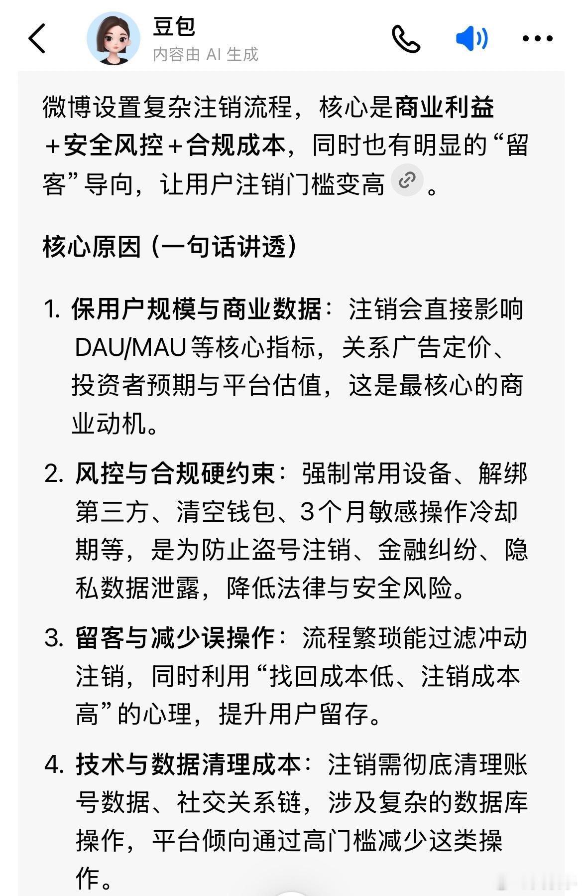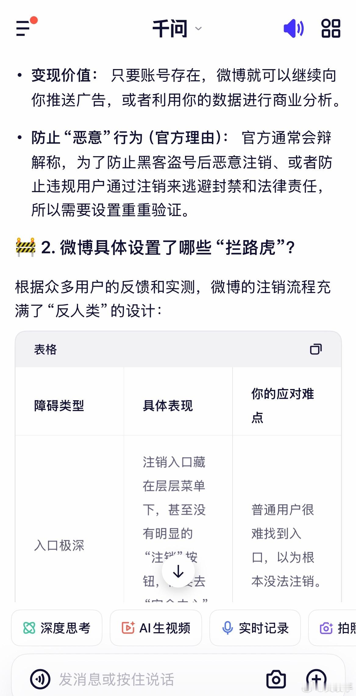 问了几个知名Al,微博不让注销的目的是什么基本都说了真话,只有元宝说了官方话,被我教育了一顿立即说了真话。微博不让用户注销全特码是为了自身利益,把用户当猪一样圈养,目的就是作为,和广告商谈价格的筹码。北京12345投诉多次都无果。