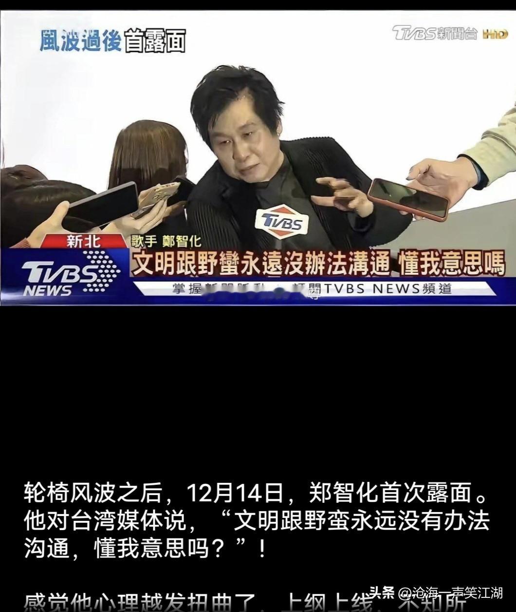 郑智化说“文明跟野蛮永远没办法沟通,懂我意思吗?” 轮椅风波过后,这位过气歌手又开始作妖博眼球了,这不典型的“吃你家饭砸你家锅”的表现吗?几十年积累起来的好人缘,两下子就给败光了。 我估计,他以后应该不敢再厚着脸皮过来搞商演赚钱了吧?或者说,他应该也知道这边没有人会再主动邀请他来搞活动了。