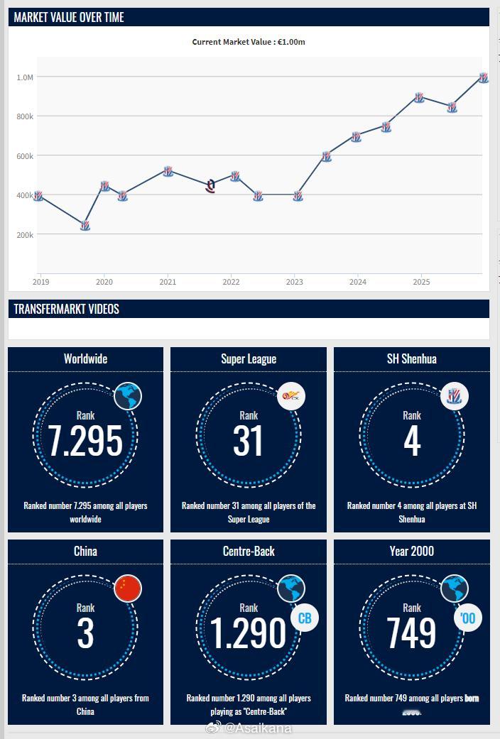 上海申花球员蒋圣龙成为历史上第25个身价达到100万欧元的中国球员。