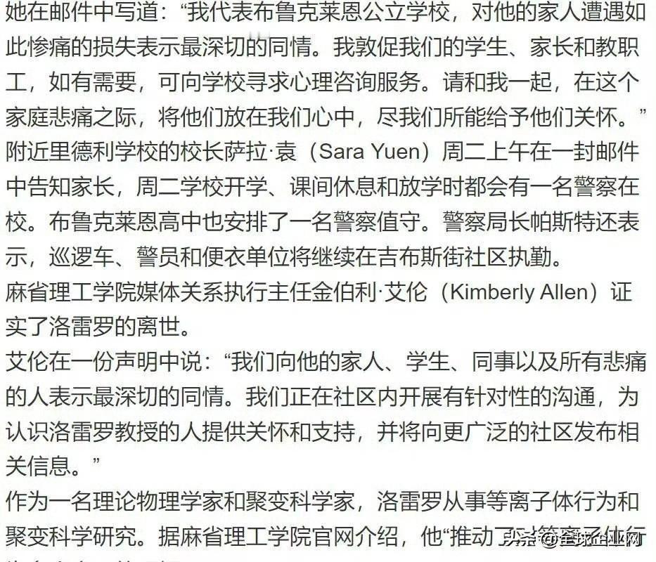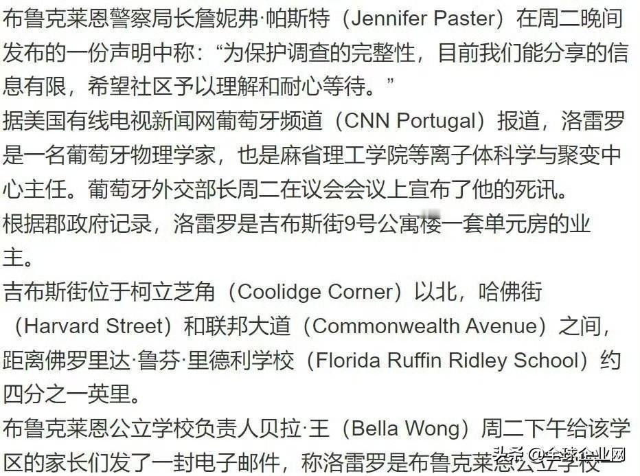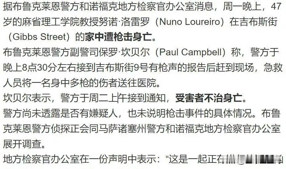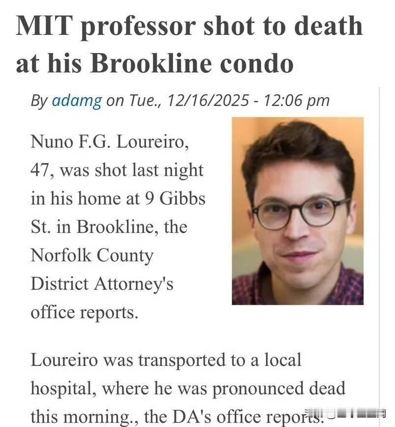 麻省理工一位核聚变专家被暗杀。 麻省理工学院等离子体科学与聚变中心主任47岁的努诺·F·G·卢雷罗(Nuno F.G. Loureiro)15日在家中遭枪击身亡。 卢雷罗是一位功勋卓著的工程师,也是核聚变领域顶尖的科学家之一,所以这起案件意义重大。 美国保守派媒体人劳拉·卢默发文声称,这可能是一场针对“亲以色列犹太裔教授”的连环谋杀行动。