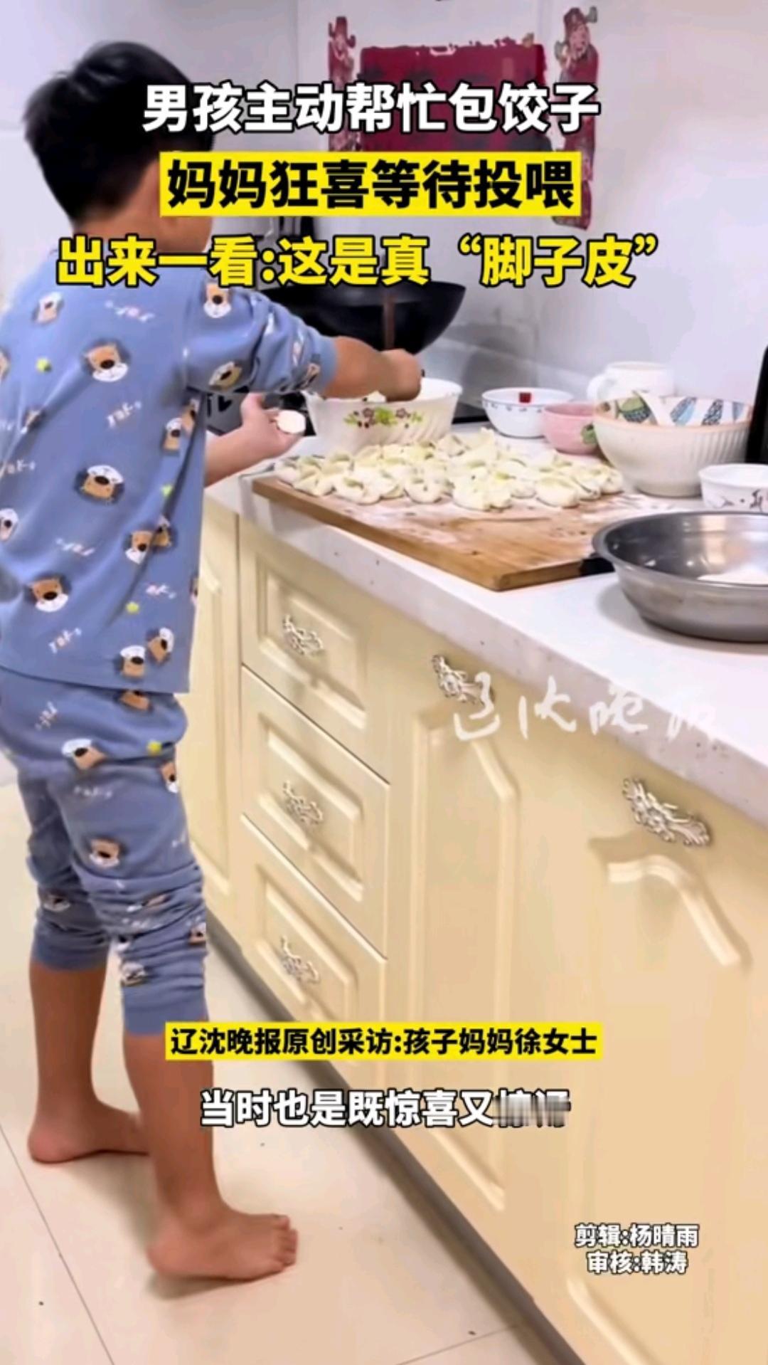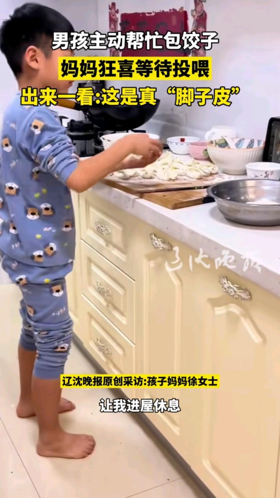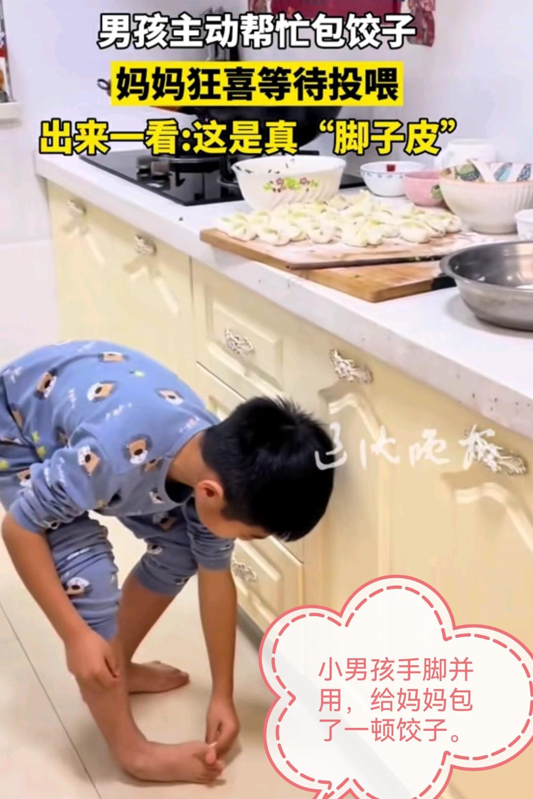 原来包饺子还可以手脚并用! 辽沈晚报消息,东北一名叫王艺霖的小男孩,看到妈妈在厨房包饺子,就主动提出他来包饺子,艺霖妈妈也非常乐意的接受了儿子的要求。 过了一会艺霖妈妈进厨房一看,原来小艺霖手脚并用在包饺子,原来他的饺子皮不需要手擀的,每一张饺子皮放在脚下,扭动脚前掌,转动几下一张饺子皮就出来了,上面的手在包饺子,下面的脚在压饺子皮,真的是手脚并用,艺霖妈妈说了,看到儿子手脚并用包出来的饺子妈妈也吃了没有嫌弃,真的是惊讶也惊喜!