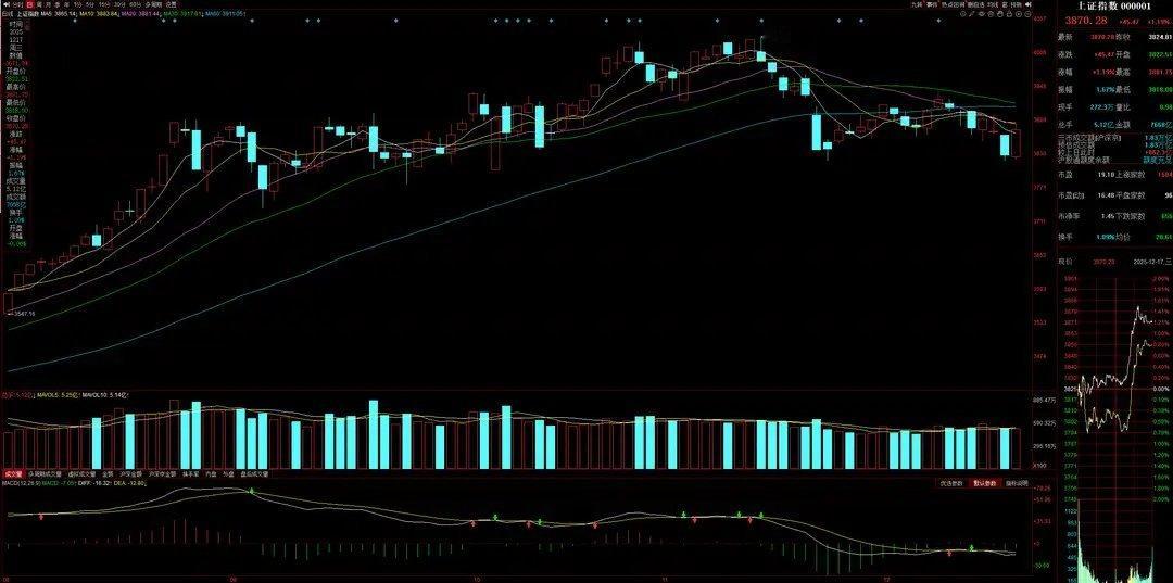 12月18日A股策略:交易数据释放关键信号!主力抄底重仓两类核心股专注A股每日实战操盘,帮散户找准方向不迷路!若你并非长线投资者,想在A股站稳脚跟务必牢记:周密布局只是盈利起点,严守操盘纪律才能收获最终红利!大势研判周三A股放量强势反弹,成交量激增860亿,全天达1.83万亿。技术面来看,大盘周二确认向下变盘后,周三上演绝地反击,结合午后盘面推演,这正是国家队进场护盘的明确信号。盘中大盘高点一度冲击20日均线关键压力位,最终收于5日均线附近,整体已显现止跌迹象,但未站上20日均线,企稳信号尚未完全确立。当前指数紧贴5日均线上沿运行,仍需警惕再度回落至均线下方的风险。叠加国家队护盘导致短期盘面失真,市场运行趋势暂不明朗,后续需持续跟踪量价及均线突破情况。盘面跟踪周三沪深两市个股涨多跌少,3600家飘红、1600家走跌,市场赚钱效应显著回暖。板块层面,锂电池细分领域的能源金属领涨全场,板块指数劲涨4.7%,为当日唯一涨幅超4%的板块;AI算力主线表现亮眼,CPO、铜缆、液冷等细分方向涨幅居前。跌幅端,海南本地股领跌两市,商业航天、军工、农业板块走势疲软。主线热点方面,仅商业航天逆势下挫,其余主线均随盘走强且涨幅跑赢大盘,整体市场格局趋于健康。消息面解读1. 国家发改委等多部门印发《煤炭清洁高效利用重点领域标杆水平和基准水平》,明确鼓励行业企业结合实际推进项目改造升级;要求新建煤炭开发利用项目及有条件的存量项目,推动清洁高效利用水平应提尽提,力争达标杆水平,利好煤炭产业链优质升级标的。2. 据市场监管总局相关消息,平台强制要求商家标注“全网最低价”,或构成滥用市场支配地位、垄断协议等违法行为,将对平台经济及电商行业竞争秩序产生深远影响。市场资金面周三机构与游资操作方向基本趋同。机构席位买盘小幅释放、卖盘微幅收缩,资金状态从流入流出持平转为小幅净流入,抄底意愿初现但力度偏弱;游资买盘卖盘同步萎缩,资金由周二小幅净流出转为持平,暂未进场加仓布局。板块资金流向方面,机构与游资暂未形成合力加仓的主线热点。具体来看,机构买盘高度集中,依旧重仓商业航天、AI算力两大方向;游资无集中加仓板块,反而大面积减仓预制菜、零售、物流、电商等近期防御性板块。鉴于机构未出现跨方向调仓动作,短期市场难现全新主线,聚焦核心赛道即可。林哥小结:当前市场止跌未企稳,趋势仍需观察,重点盯紧5日均线支撑与20日均线突破情况;资金聚焦明确,能源金属(锂电池)、AI算力为两大主力抄底核心,可围绕这两大方向精选标的,严格把控仓位,规避弱势调整板块。