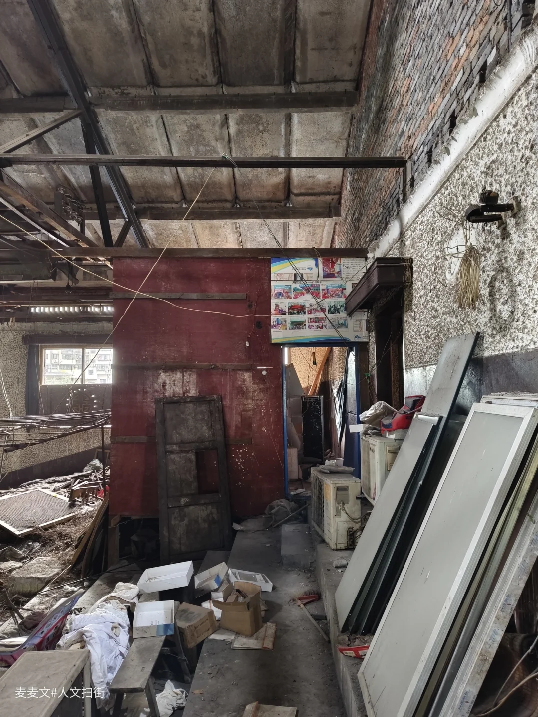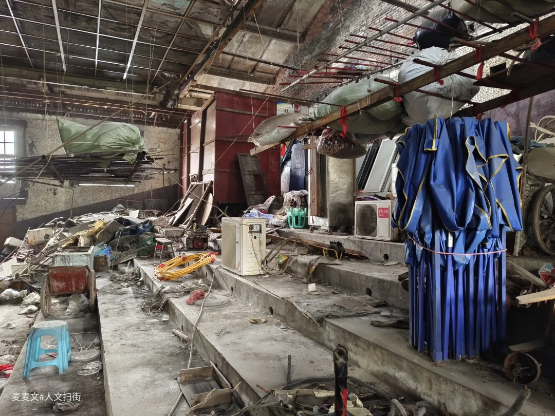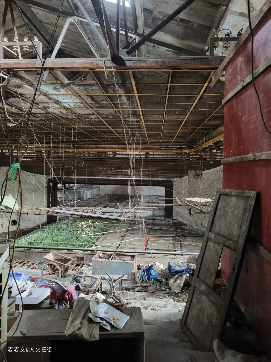 如今,它已然走过半个世纪的风雨。当我来到二楼,推开沉重的单号木门,特钢电影院的主体呈现在眼前。天花板只剩下木质骨架,阳光从缝隙中漏下来,照亮空气中飞舞的尘埃。当年可容纳几百人的看台堆满了杂物,座椅只剩下几个,放映室被改成了民房,墙上的电影海报早已褪色。当年悬挂银幕的铁架,如今空荡荡地悬在半空。
