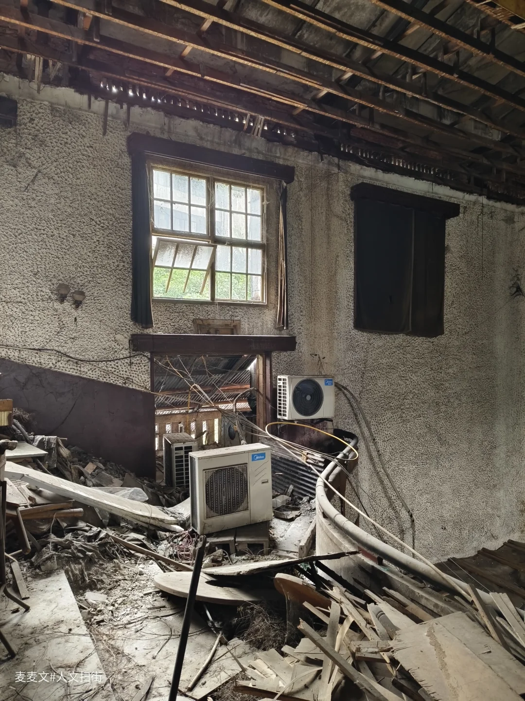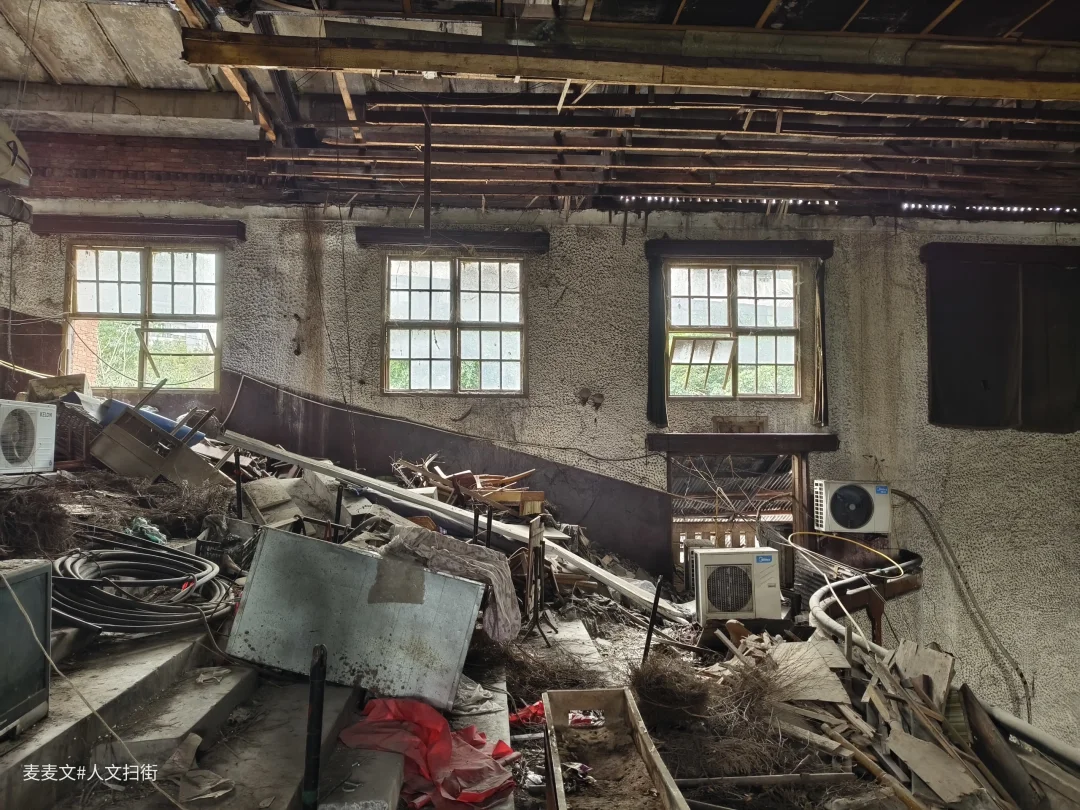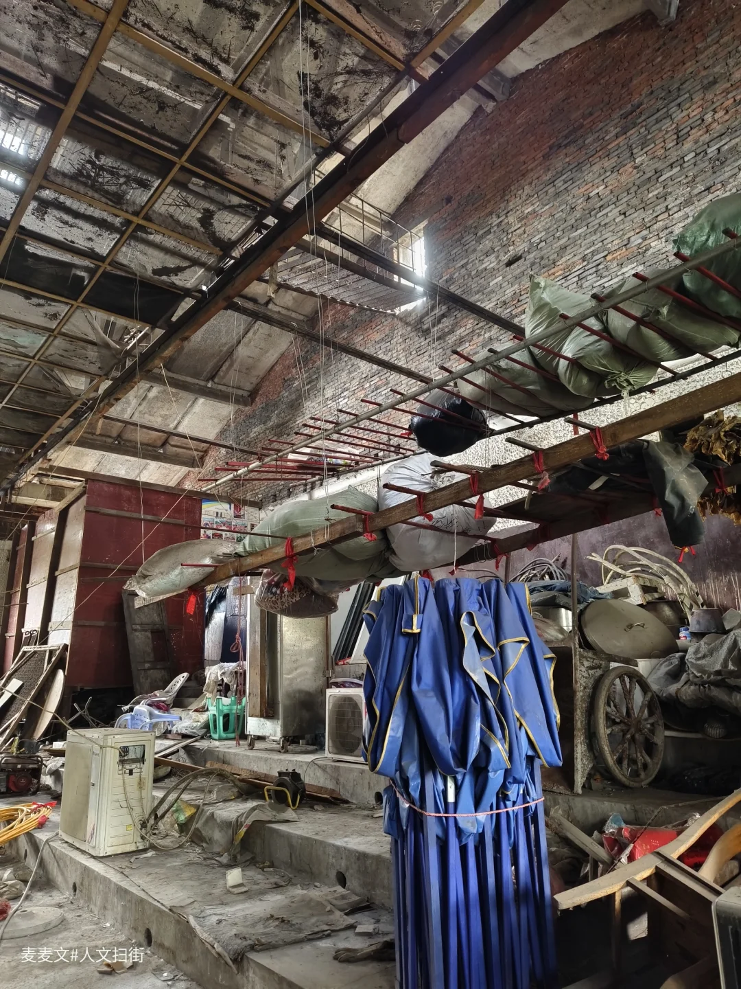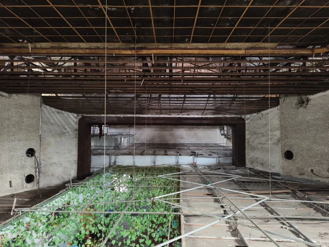 如今,它已然走过半个世纪的风雨。当我来到二楼,推开沉重的单号木门,特钢电影院的主体呈现在眼前。天花板只剩下木质骨架,阳光从缝隙中漏下来,照亮空气中飞舞的尘埃。当年可容纳几百人的看台堆满了杂物,座椅只剩下几个,放映室被改成了民房,墙上的电影海报早已褪色。当年悬挂银幕的铁架,如今空荡荡地悬在半空。