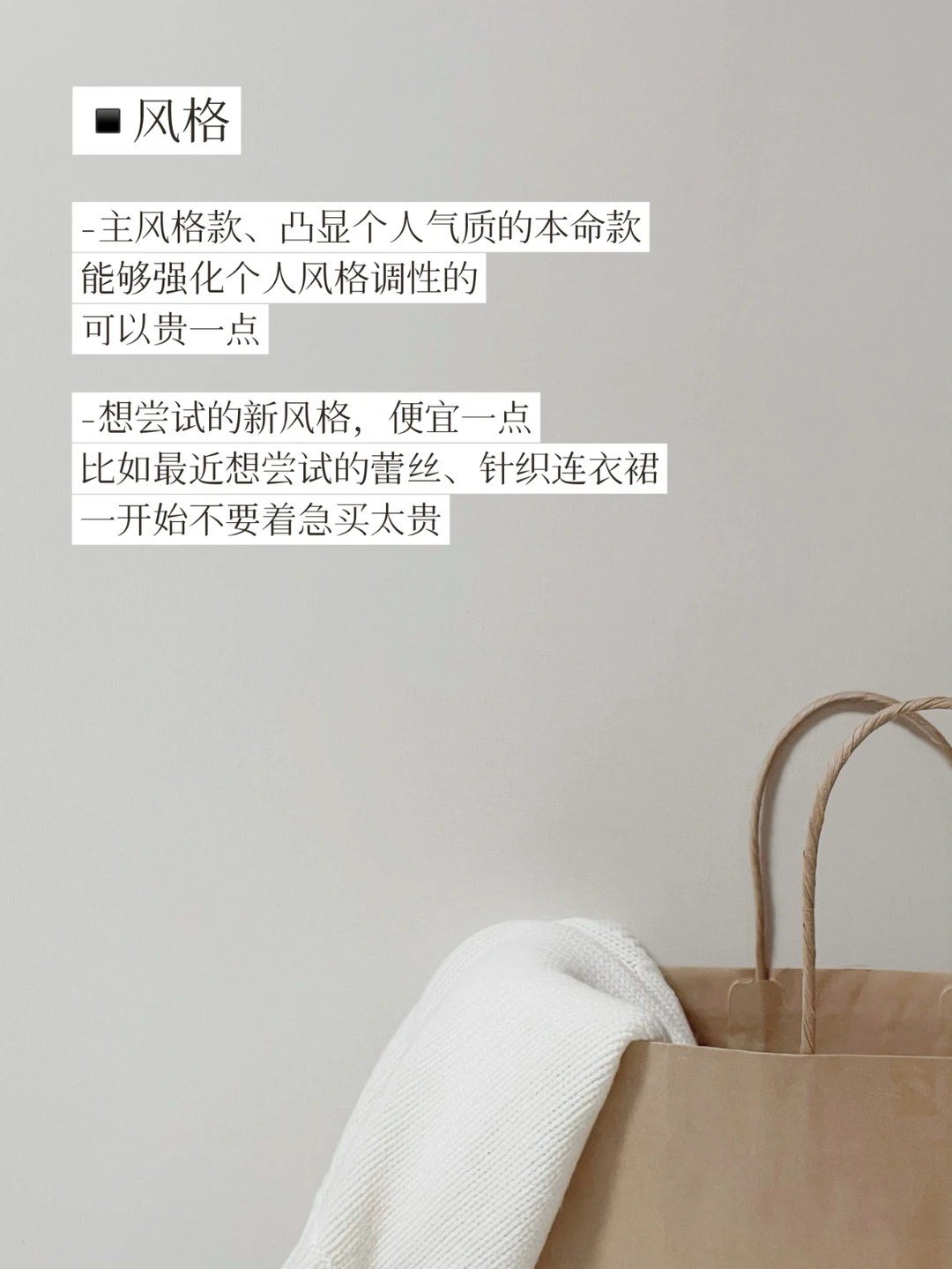-想尝试的新风格,便宜一点。比如最近想尝试的蕾丝、针织连衣裙,一开始不要着急买太贵