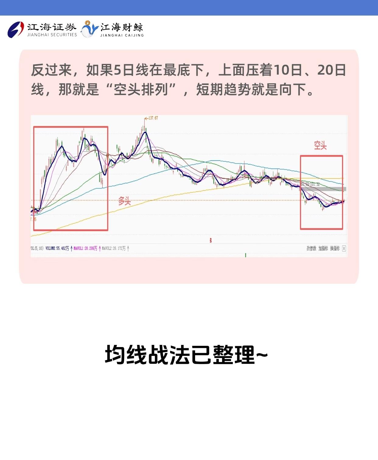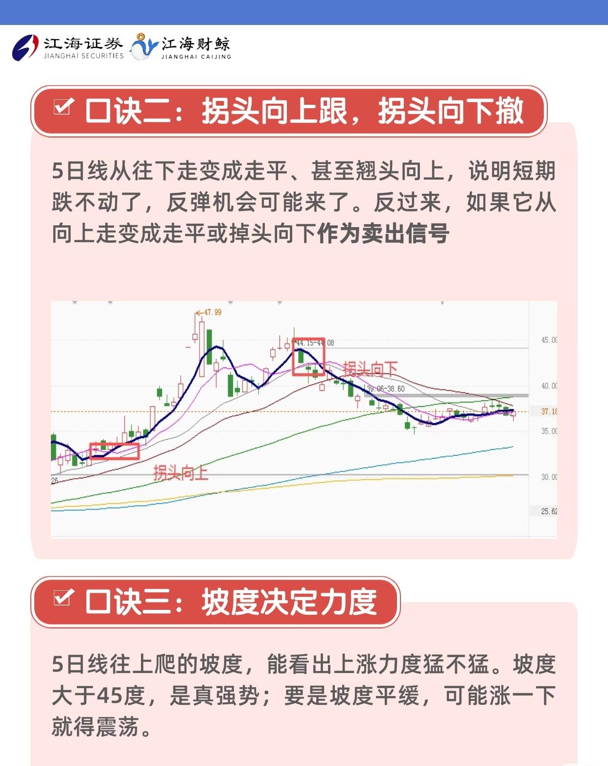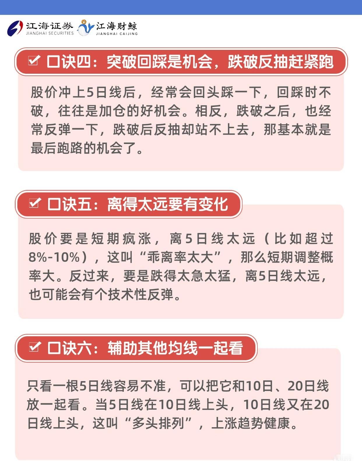 围绕“5日均线怎么用”展开,通过六句口诀及相关概念帮助投资者理解并运用均线判断短期趋势与买卖时机。 第一张图提出主题——掌握六句口诀即可用好5日均线,并详解口诀一:线上持股,线下观望。意思是股价稳于5日线上代表短期向上,可持股;若有效跌破(如跌破后三天无法回到线上)应卖出,借此可避免无谓亏损,并配走势图用红标“持有”“观望”示意。 第二张图讲解口诀二:拐头向上跟,拐头向下撤,即5日线由下跌转为走平或向上是反弹信号,应跟进;由上升转平或向下则是卖出信号。另有口诀三:坡度决定力度,指出5日线向上倾斜角度越大(如大于45度)代表上涨越强劲,角度平缓则易进入震荡。 第三张图继续介绍后续口诀:口诀四:突破回踩是机会,跌破反抽赶紧跑——股价上穿5日线后回踩不破可加仓,跌破后反抽无力站回则应离场;口诀五:离得太远要有变化——股价短期偏离5日线过远(乖离率大,如超8%)易出现调整或反弹;口诀六:辅助其他均线一起看——单看5日线易误判,应与10日、20日线结合,形成“多头排列”(短周期均线在上)表明趋势健康。 第四张图补充解释空头排列:当5日线位于最下方,被10日、20日线压制时,短期趋势向下,并配合K线图与均线标注“多头”“空头”区域,提示可通过调整参数、添加指标来优化分析。最后强调“均线战法已整理”,方便投资者系统学习运用。 整体来看,这套内容从单根5日均线的使用到多均线组合判断,涵盖了趋势识别、买卖信号、力度评估及风险控制要点,为短线交易提供了一套简明实用的技术分析框架。