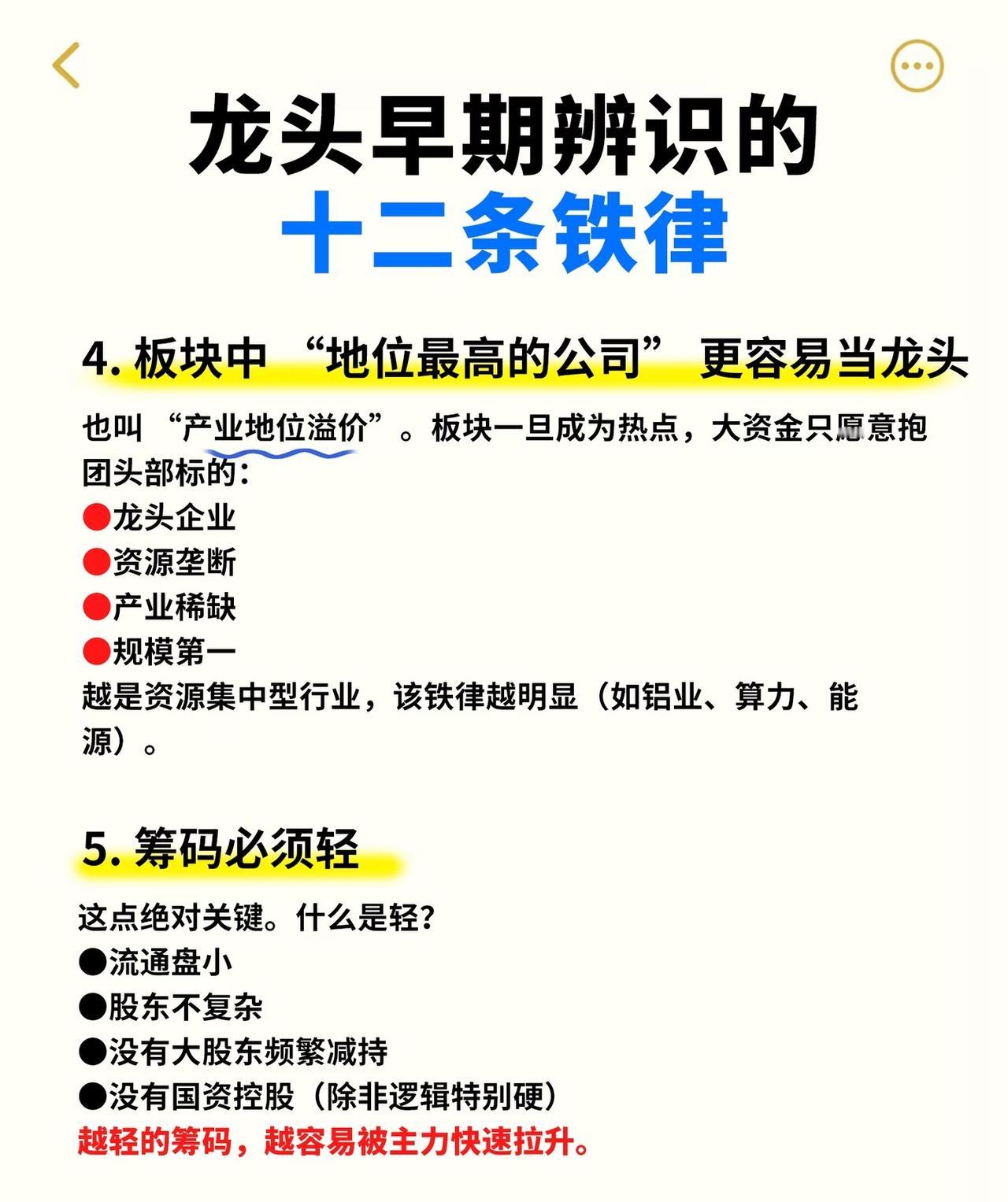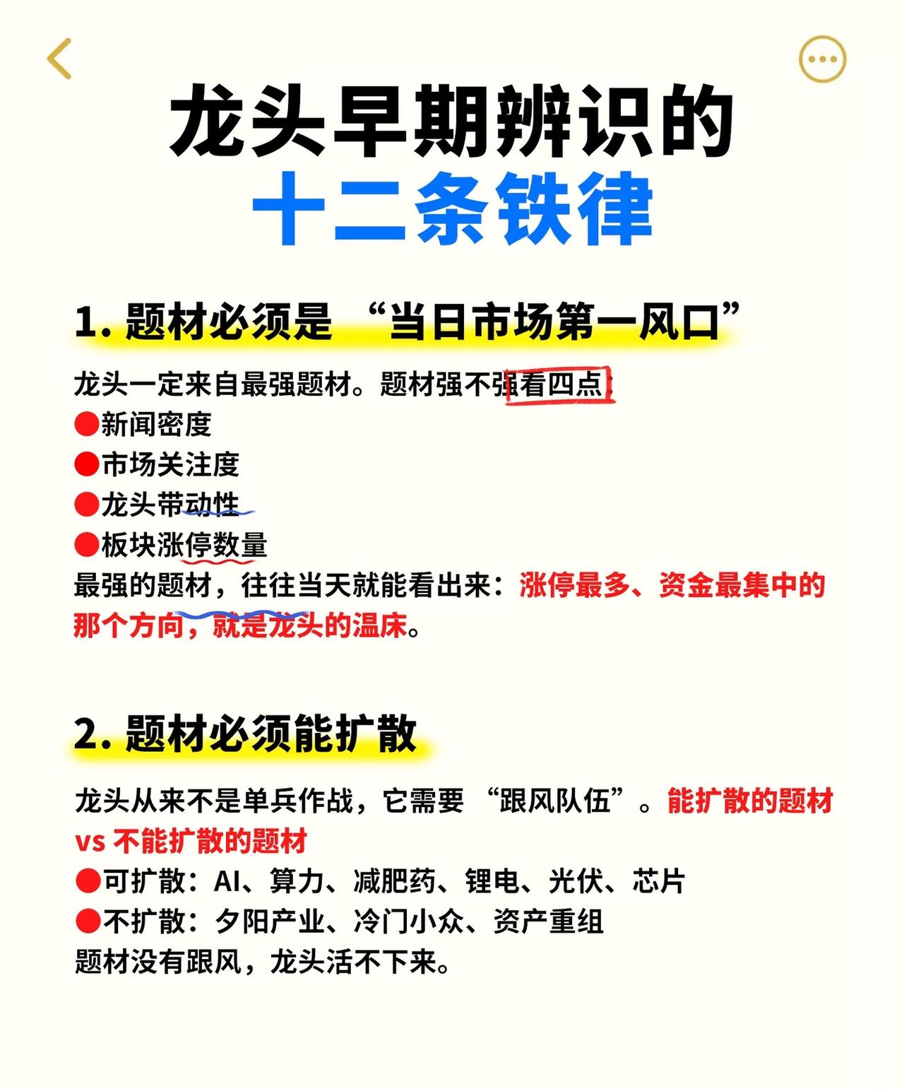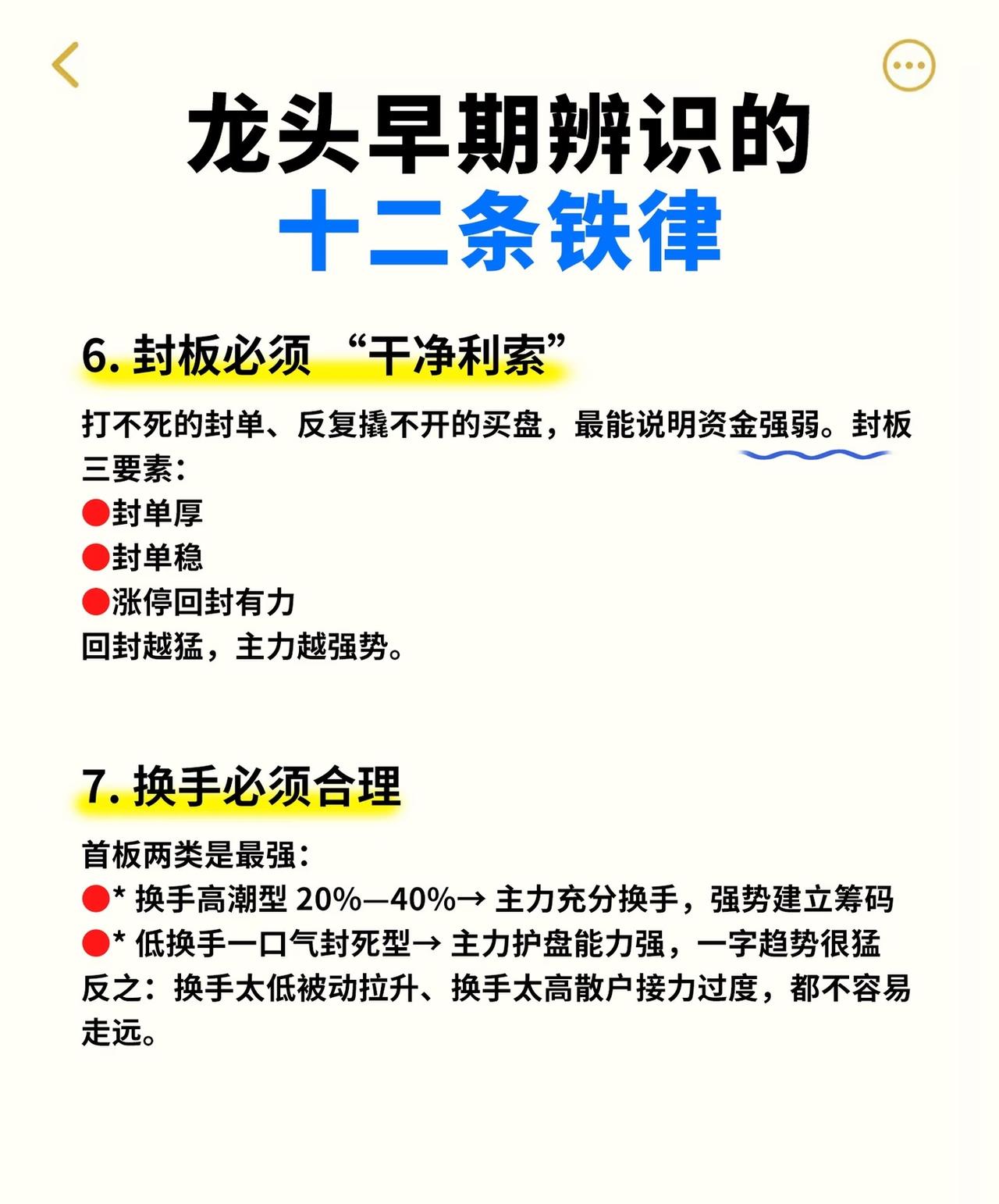 关于股票投资中“龙头早期辨识的十二条铁律”的内容可总结如下: 短线的核心在于龙头,抓住龙头能享受最高溢价、最稳情绪、最强连板、最大扩散效果及最安全抱团逻辑等优势。关键在于从众多股票中,在1板、2板阶段识别出真龙头,以下12条铁律可助力早期判断: 1. 题材必须是“当日市场第一风口”:龙头源于最强题材,题材强度看四点——新闻密度、市场关注度、龙头带动性、板块涨停数量;当天涨停最多、资金最集中的方向是龙头温床。 2. 题材必须能扩散:龙头需“跟风队伍”,可扩散题材如AI、算力、减肥药等,不可扩散如夕阳产业、冷门小众等,无跟风的题材难存活龙头。 3. 首板必须“最先涨停”或“最有辨识度”:关键看速度与辨识度,龙头至少具备其一——首板最先发起,或当天最强辨识度(名字、地位、行业唯一性),市场愿记住的更易成龙头。 4. 板块中“地位最高的公司”更容易当龙头(产业地位溢价):板块成热点时,大资金倾向抱团头部标的(龙头企业、资源垄断、产业稀缺、规模第一),资源集中型行业(如铝业、算力、能源)此规律更明显。 5. 筹码必须轻:流通盘小、股东不复杂、无大股东频繁减持、非国资控股(除非逻辑极硬)的轻筹码,易被主力快速拉升。 6. 封板必须“干净利索”:强劲买盘(封单)体现资金实力,封板三要素为封单厚、封单稳、涨停回封有力,回封越猛主力越强。 7. 换手必须合理:首板两类最强——换手高潮型(20%,主力充分换手建筹码)、低换手一口气封死型(主力护盘强,一字趋势猛);反之,换手太低被动拉升、太高散户接力过度均难走远。 8. K线必须“舒服”:需满足无剧烈上蹿下跳、无长上影线、无过度震荡、最高点收盘、盘中强势整固;避免短线诱多诱空,龙头K线应稳、顺、强。 9. 分时图要体现“主力色彩”:主力存在感强的特征有直线拉升、回踩就拉、分时流畅、突然大买单拉板、情绪关键时刻护盘;反之小碎单涨停、三上三下、放量冲不动是散户拉的,不成龙头。 10. 必须具备“叙事能力”(讲故事能力):题材非最关键,重点在能否讲出让市场买单的故事(如板块唯一、核心资源、市场占有率第一、行业爆发期、新政策直接利好),越能讲故事越易成龙头。 11. 必须有“市场记忆点”:记忆点包括名字响亮、曾经的牛股、曾经的板块龙头、市值结构好、市场易记住,可大幅提升资金抱团意愿。 12. 必须能带动板块产生溢价:真龙头涨停后板块会跟随上涨;假龙头仅自身涨停,板块无反应、跟风不起、扩散力弱。 终极总结:真龙头是综合条件最优的(题材、地位、封板、分时、辨识度、资金抱团等均最强),由资金“选出来”而非“涨出来”。能在1板、2板识别真龙,可提升短线胜率,使收益曲线从波动转为向上跃迁。