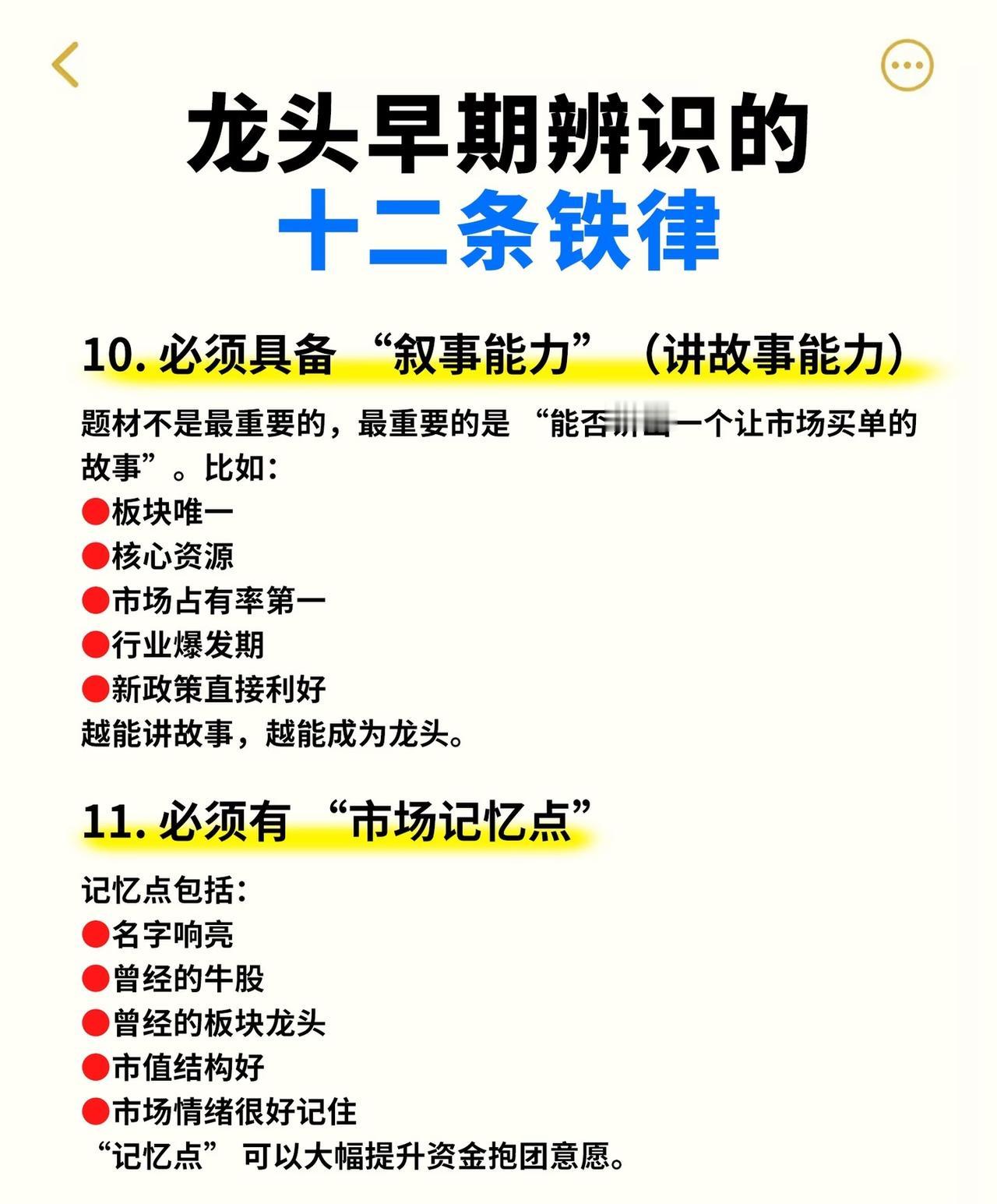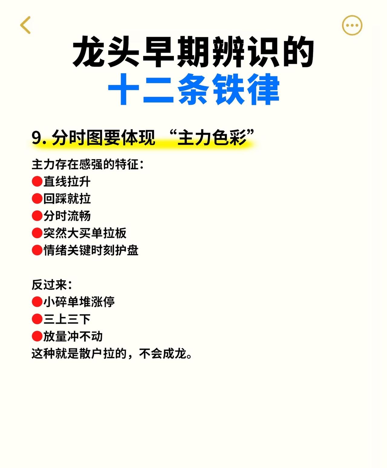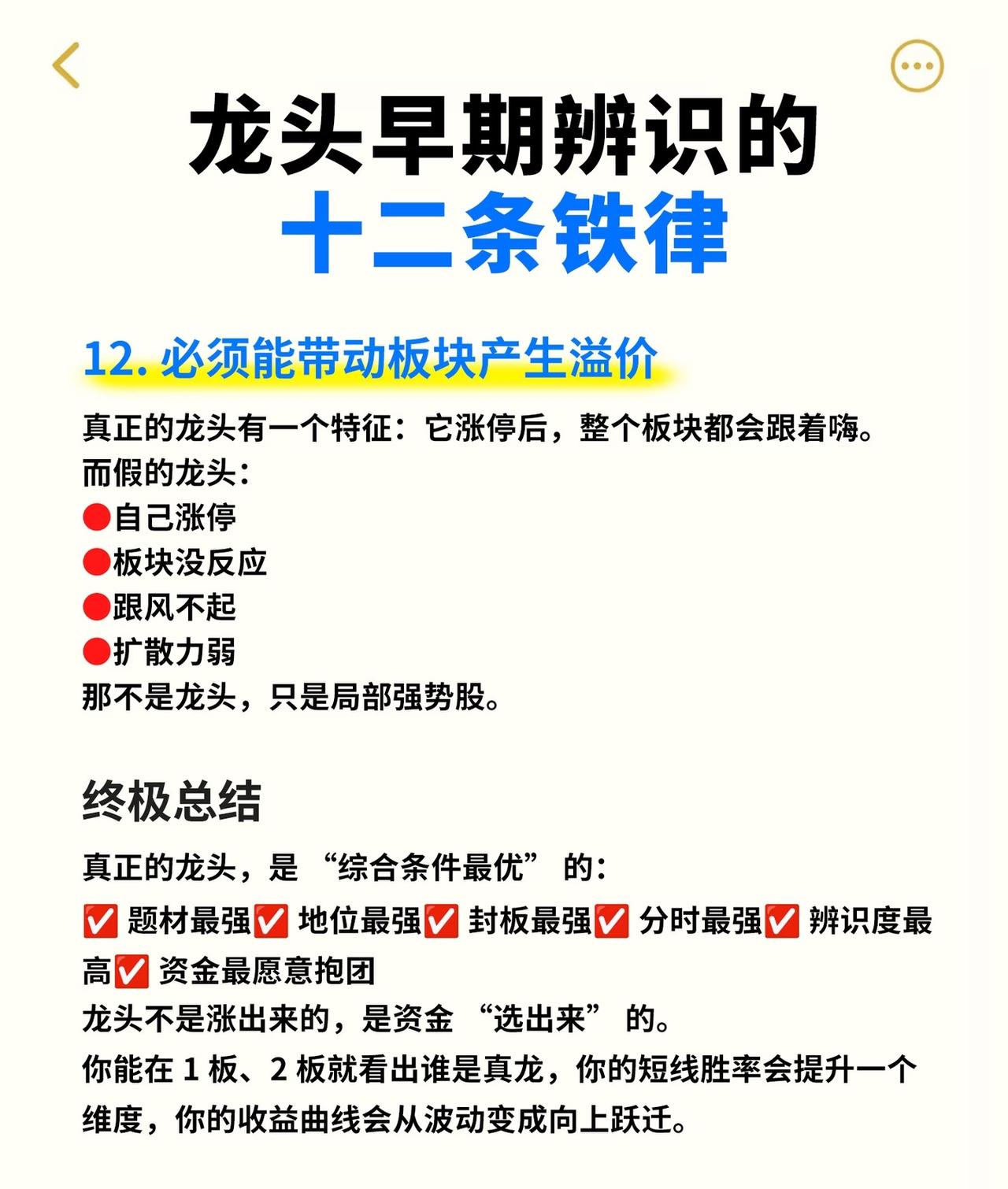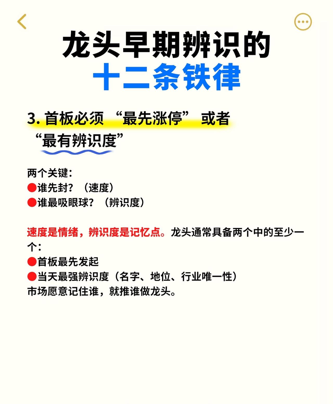 关于股票投资中“龙头早期辨识的十二条铁律”的内容可总结如下: 短线的核心在于龙头,抓住龙头能享受最高溢价、最稳情绪、最强连板、最大扩散效果及最安全抱团逻辑等优势。关键在于从众多股票中,在1板、2板阶段识别出真龙头,以下12条铁律可助力早期判断: 1. 题材必须是“当日市场第一风口”:龙头源于最强题材,题材强度看四点——新闻密度、市场关注度、龙头带动性、板块涨停数量;当天涨停最多、资金最集中的方向是龙头温床。 2. 题材必须能扩散:龙头需“跟风队伍”,可扩散题材如AI、算力、减肥药等,不可扩散如夕阳产业、冷门小众等,无跟风的题材难存活龙头。 3. 首板必须“最先涨停”或“最有辨识度”:关键看速度与辨识度,龙头至少具备其一——首板最先发起,或当天最强辨识度(名字、地位、行业唯一性),市场愿记住的更易成龙头。 4. 板块中“地位最高的公司”更容易当龙头(产业地位溢价):板块成热点时,大资金倾向抱团头部标的(龙头企业、资源垄断、产业稀缺、规模第一),资源集中型行业(如铝业、算力、能源)此规律更明显。 5. 筹码必须轻:流通盘小、股东不复杂、无大股东频繁减持、非国资控股(除非逻辑极硬)的轻筹码,易被主力快速拉升。 6. 封板必须“干净利索”:强劲买盘(封单)体现资金实力,封板三要素为封单厚、封单稳、涨停回封有力,回封越猛主力越强。 7. 换手必须合理:首板两类最强——换手高潮型(20%,主力充分换手建筹码)、低换手一口气封死型(主力护盘强,一字趋势猛);反之,换手太低被动拉升、太高散户接力过度均难走远。 8. K线必须“舒服”:需满足无剧烈上蹿下跳、无长上影线、无过度震荡、最高点收盘、盘中强势整固;避免短线诱多诱空,龙头K线应稳、顺、强。 9. 分时图要体现“主力色彩”:主力存在感强的特征有直线拉升、回踩就拉、分时流畅、突然大买单拉板、情绪关键时刻护盘;反之小碎单涨停、三上三下、放量冲不动是散户拉的,不成龙头。 10. 必须具备“叙事能力”(讲故事能力):题材非最关键,重点在能否讲出让市场买单的故事(如板块唯一、核心资源、市场占有率第一、行业爆发期、新政策直接利好),越能讲故事越易成龙头。 11. 必须有“市场记忆点”:记忆点包括名字响亮、曾经的牛股、曾经的板块龙头、市值结构好、市场易记住,可大幅提升资金抱团意愿。 12. 必须能带动板块产生溢价:真龙头涨停后板块会跟随上涨;假龙头仅自身涨停,板块无反应、跟风不起、扩散力弱。 终极总结:真龙头是综合条件最优的(题材、地位、封板、分时、辨识度、资金抱团等均最强),由资金“选出来”而非“涨出来”。能在1板、2板识别真龙,可提升短线胜率,使收益曲线从波动转为向上跃迁。