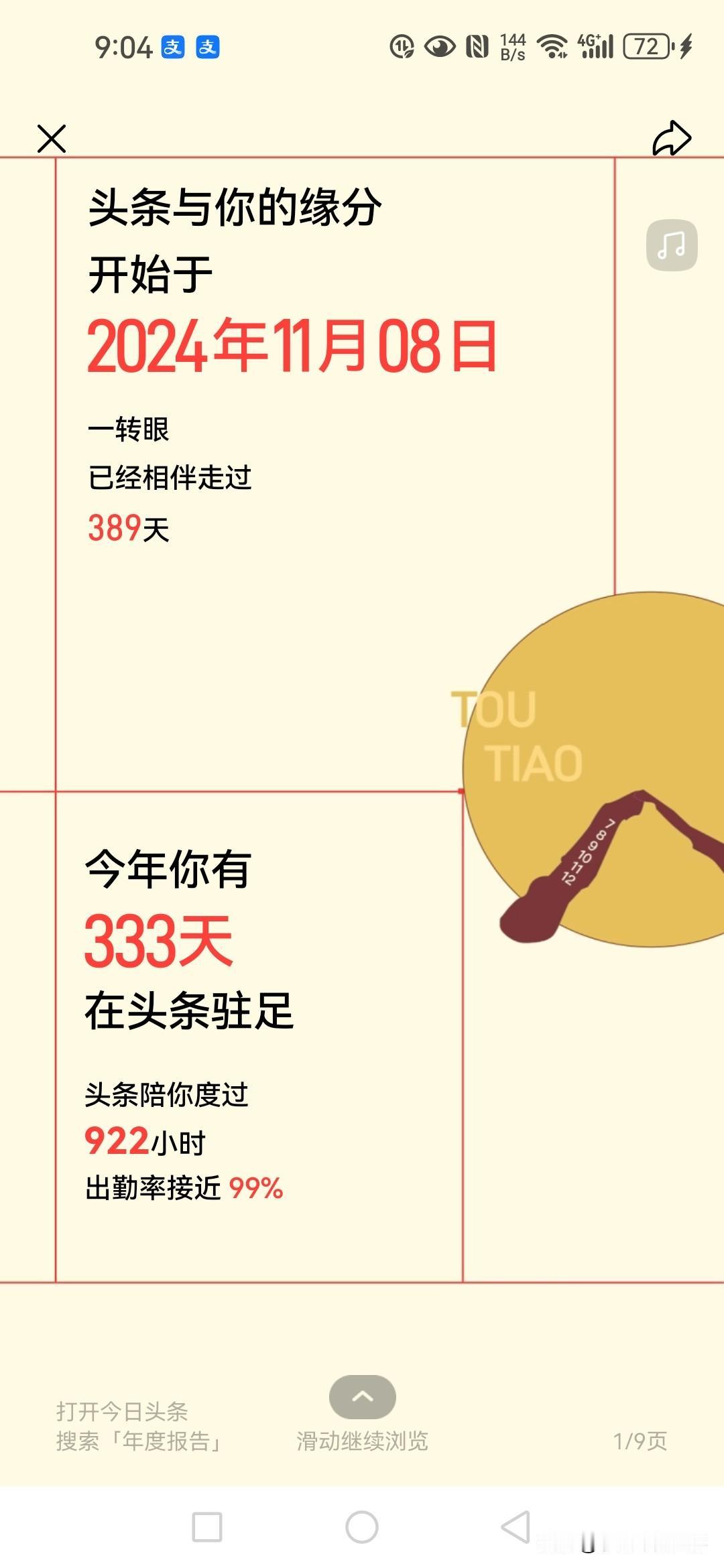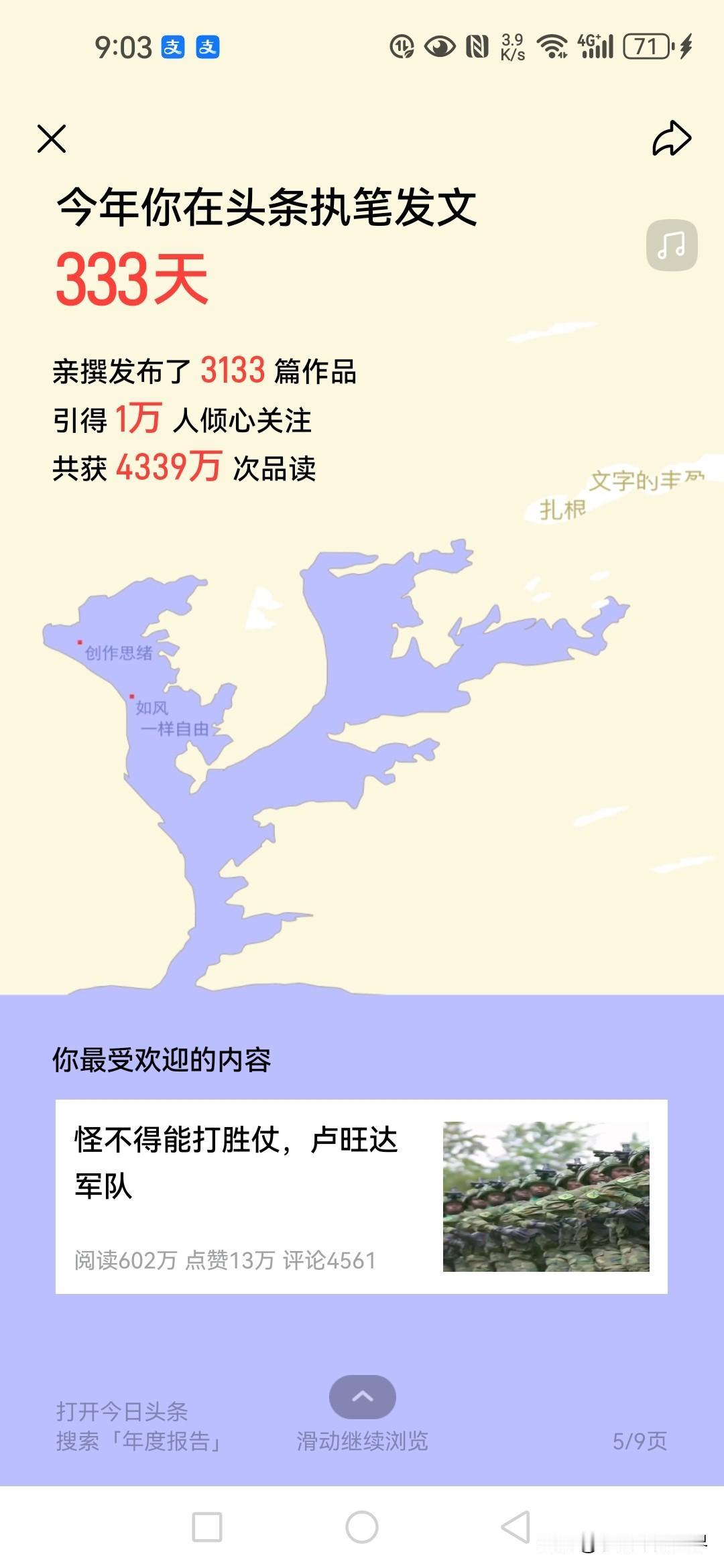 入驻头条一年,发文3133篇,阅读量4339万次,单篇阅读最高602万,点赞13万,阅读时长每天约3小时。