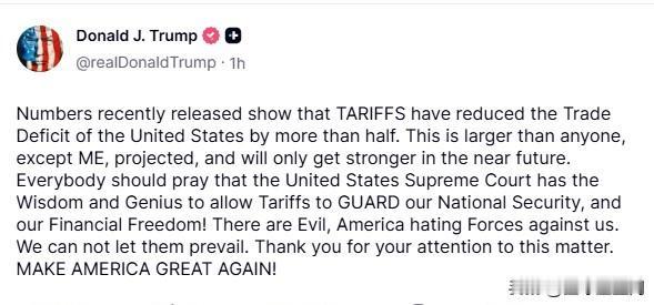 【黄金时代】川普宣布,特朗普关税已经让美国贸易逆差降低一半以上 川普: 最近公布的数据显示,关税已使美国的贸易逆差减少了一半以上。这一降幅超过了除我之外任何人的预期,而且在不久的将来只会更大。每个人都应该祈祷美国最高法院拥有足够的智慧和远见,允许关税继续守护我们的国家安全和金融自由!邪恶的、仇恨美国的势力正在与我们对抗。我们绝不能让他们得逞。感谢您对此事的关注。让美国再次伟大!