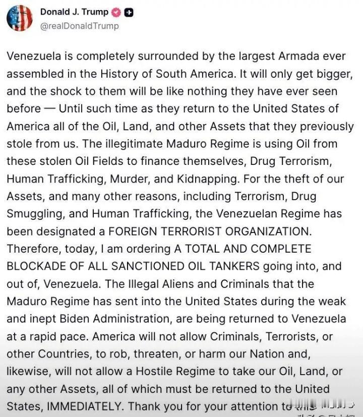 特朗普认为,委内瑞拉的石油是属于美国的,如此,他就也可以有理由下令全面封锁所有进出委内瑞拉的受制裁油轮。并且,已经下令。国际油价为此拉升,也不奇怪! 另外,他又发文认定委内瑞拉现政府是“外国恐怖组织”。直接认定一个国家的合法政府为“外国恐怖组织”,这样的做法,也是美国创新吧,如此,连拿个试管装洗衣服说是“大规模杀伤性武器”也省了…… 话说,一战爆发于欧洲,二战爆发于亚洲,三战,会否爆发于拉美呢?美国为何要介入委内瑞拉事务