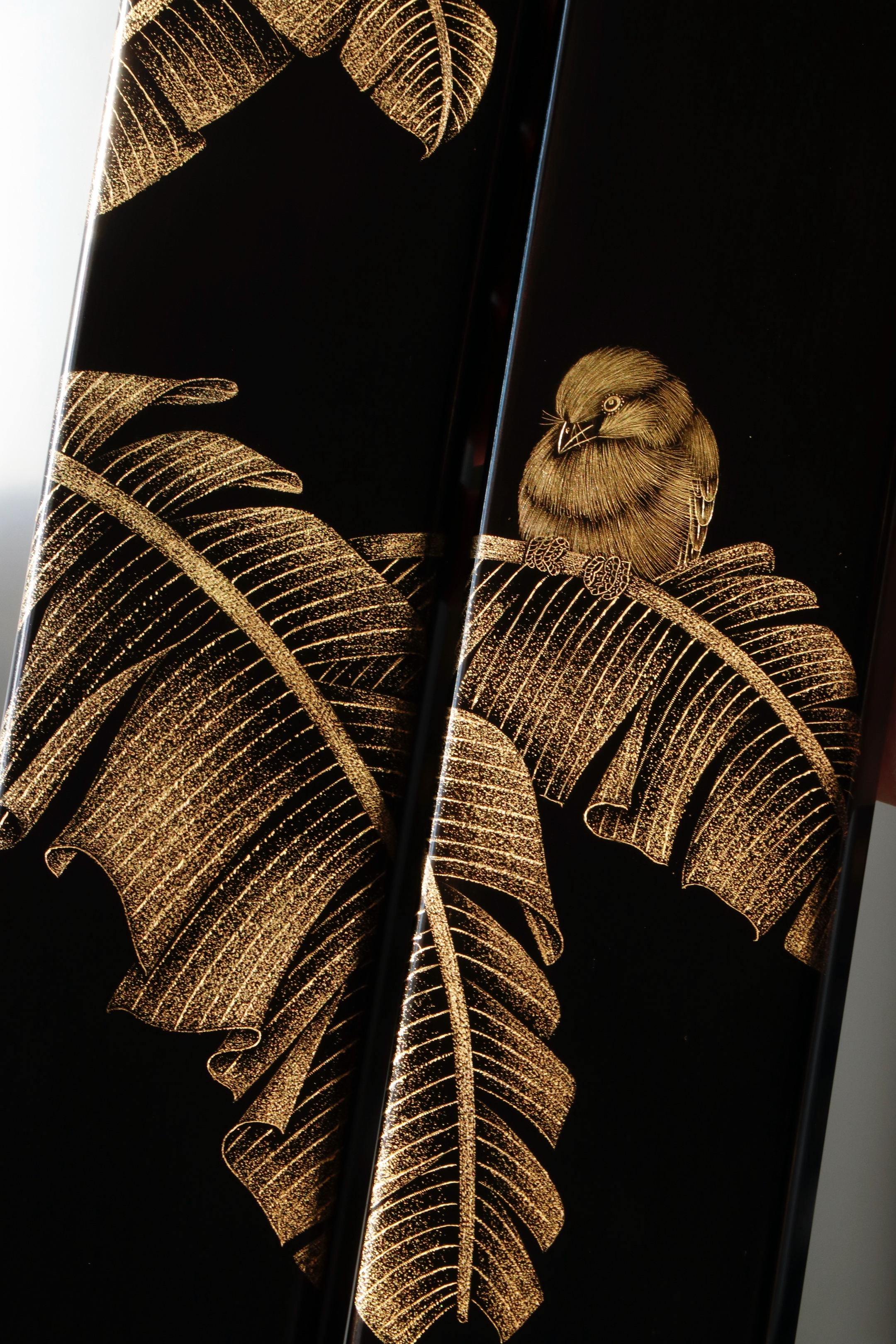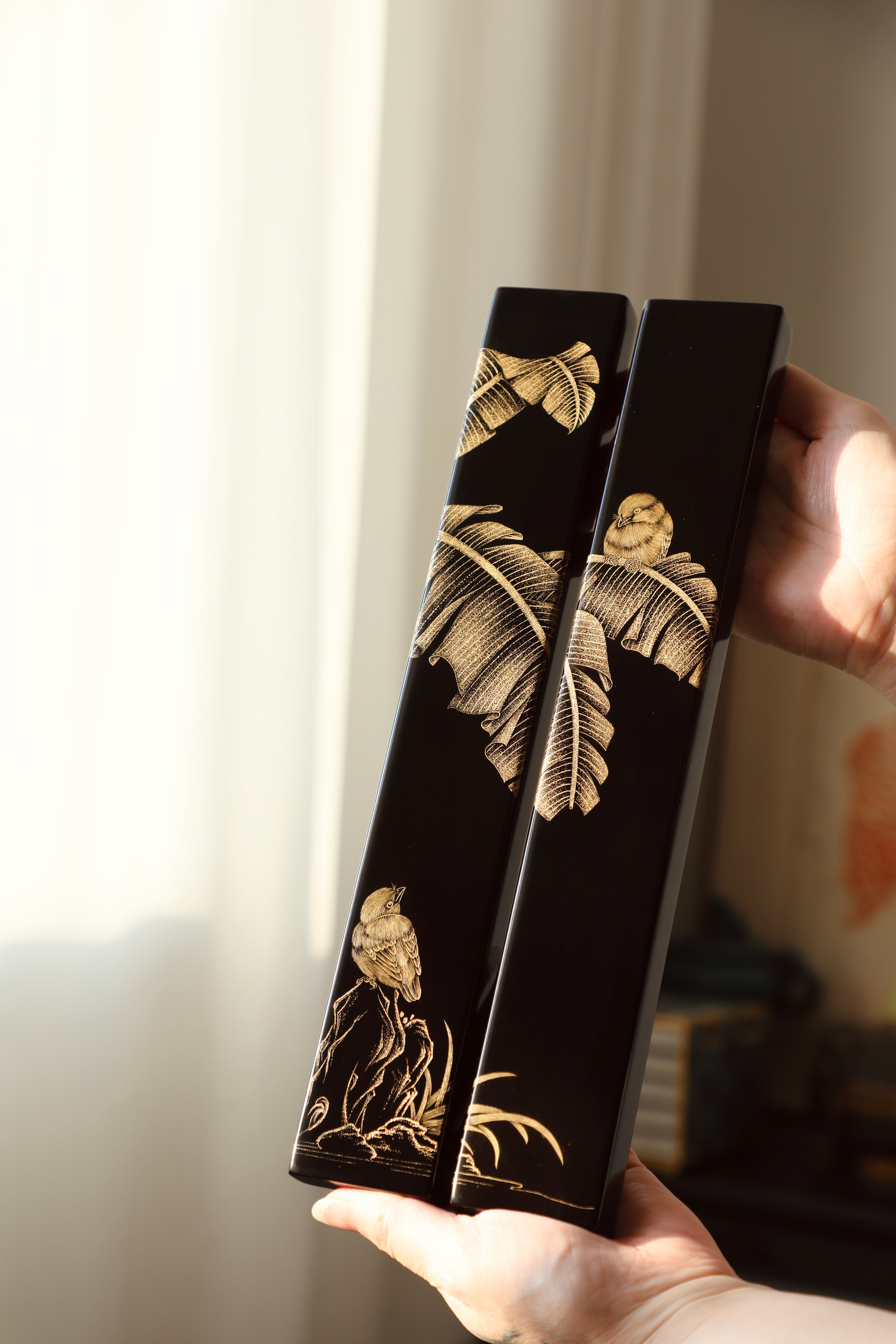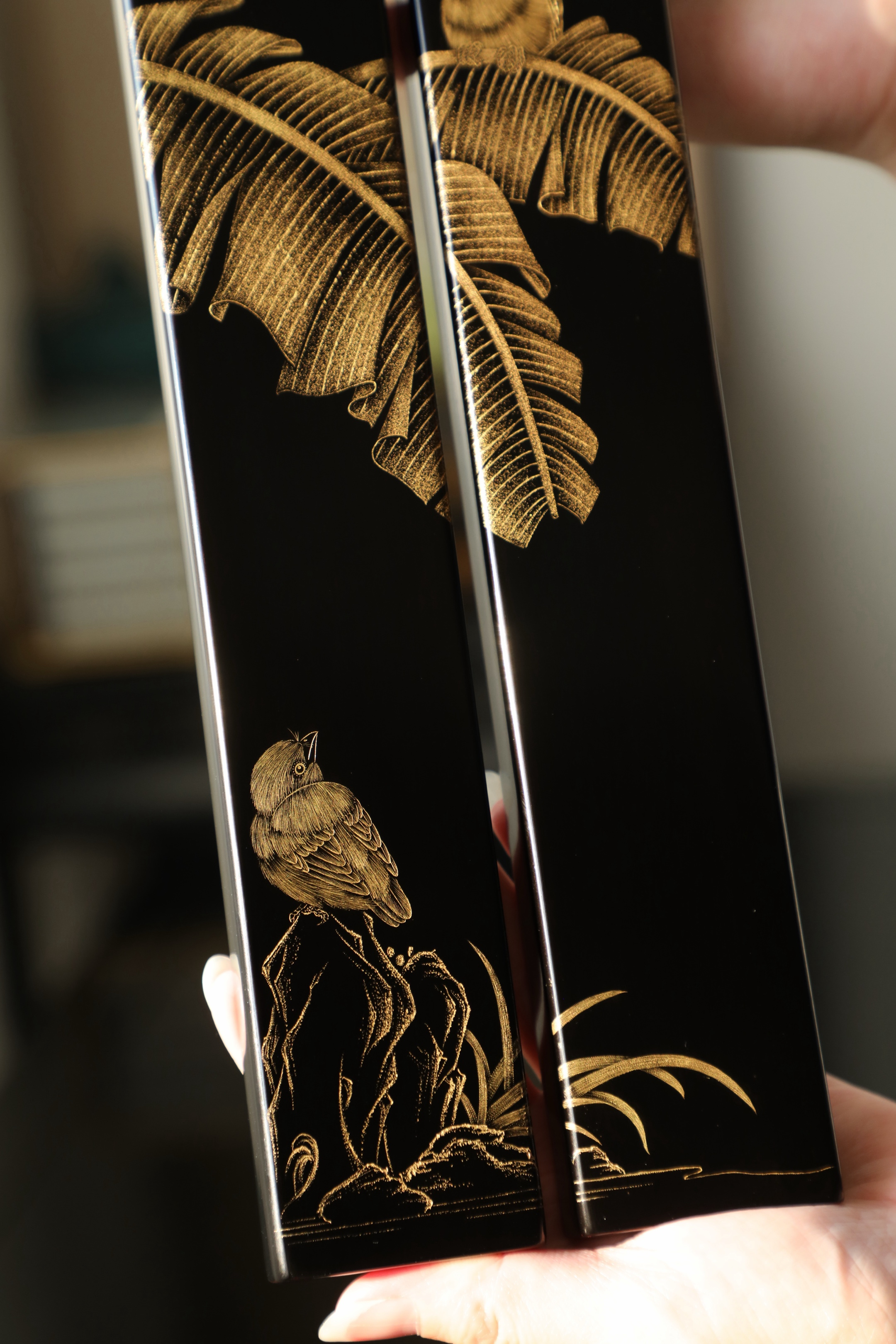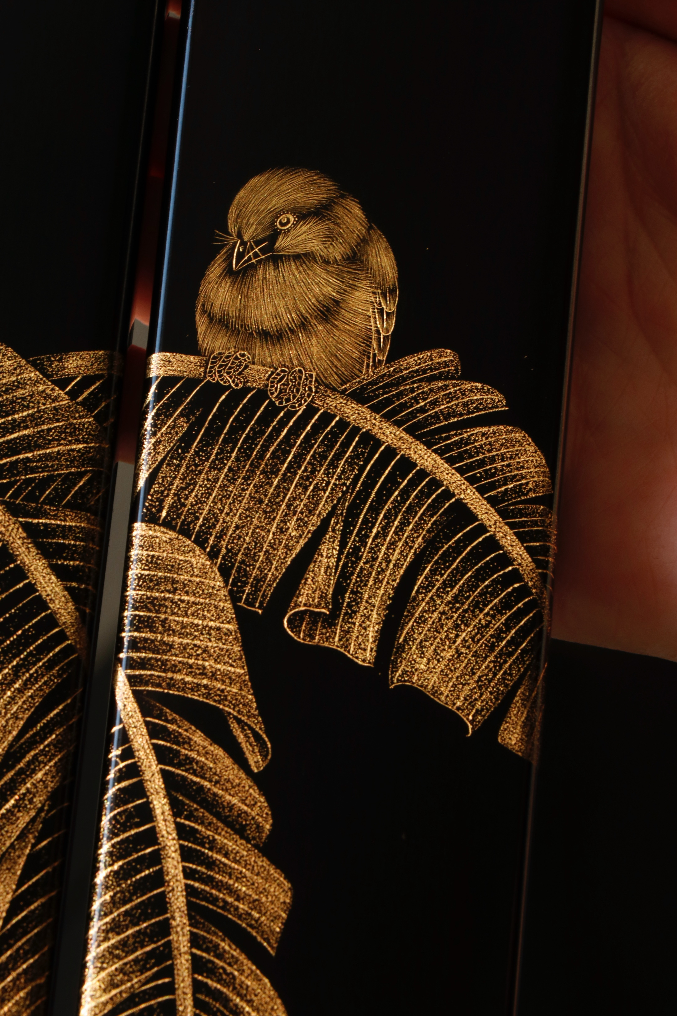 大红酸枝戗金 | 蕉雀图 镇尺精选老料制作,戗金绘就蕉叶舒展,线条柔婉逸丽,双鹊雀顾盼回首,构图别具一格,具有鲜丽清逸之气,堪称文房妙物30.5*4.7*2cm 重550克