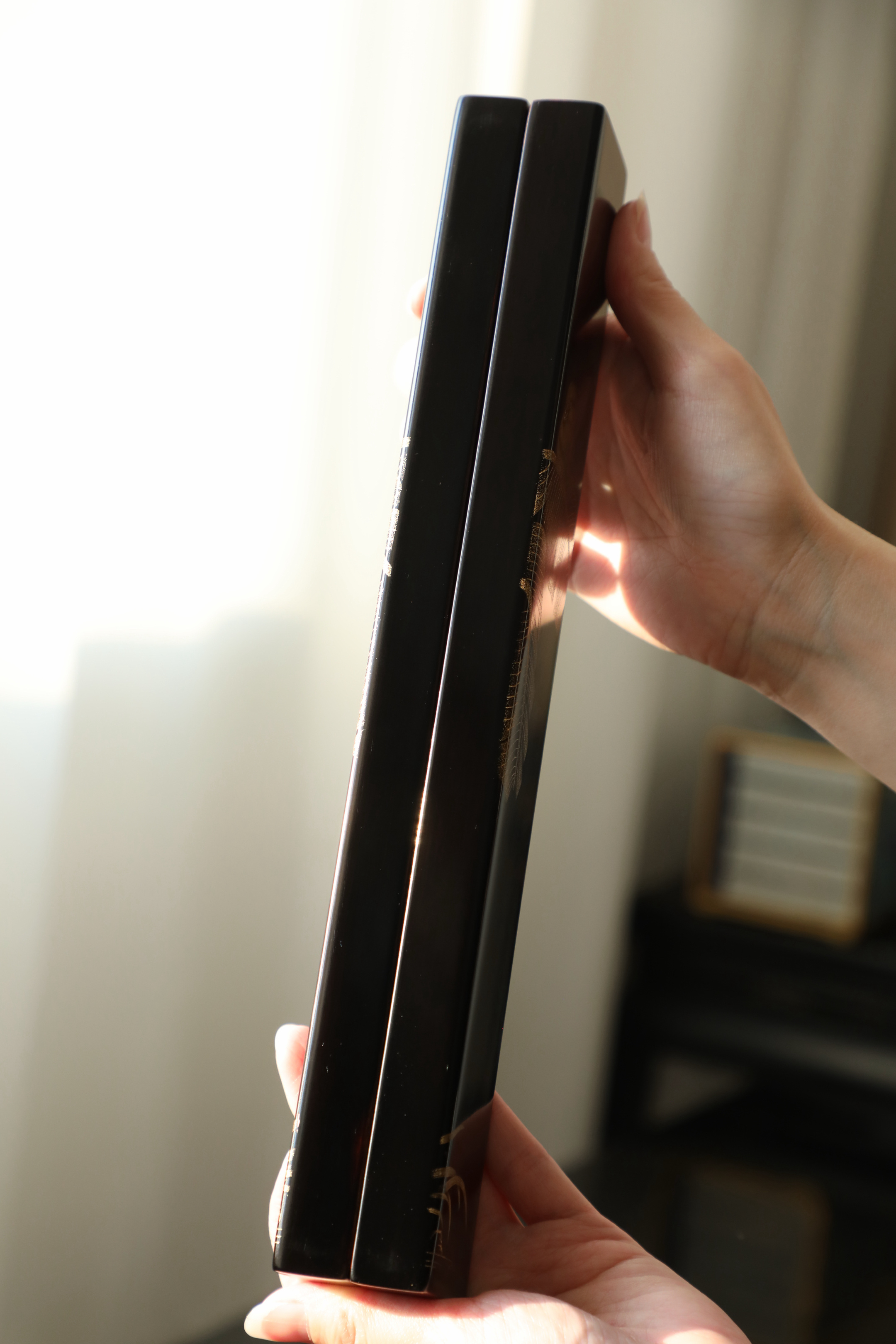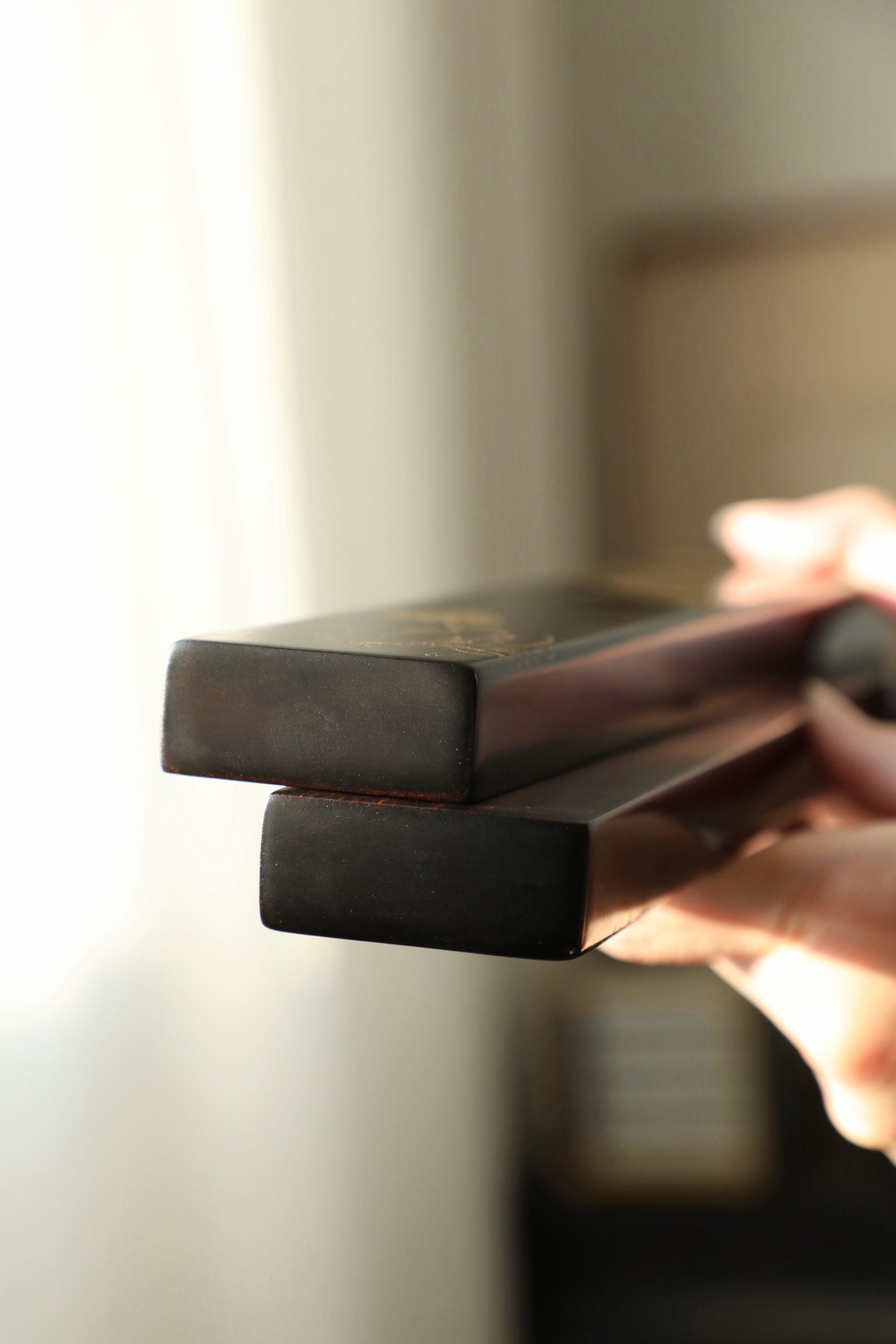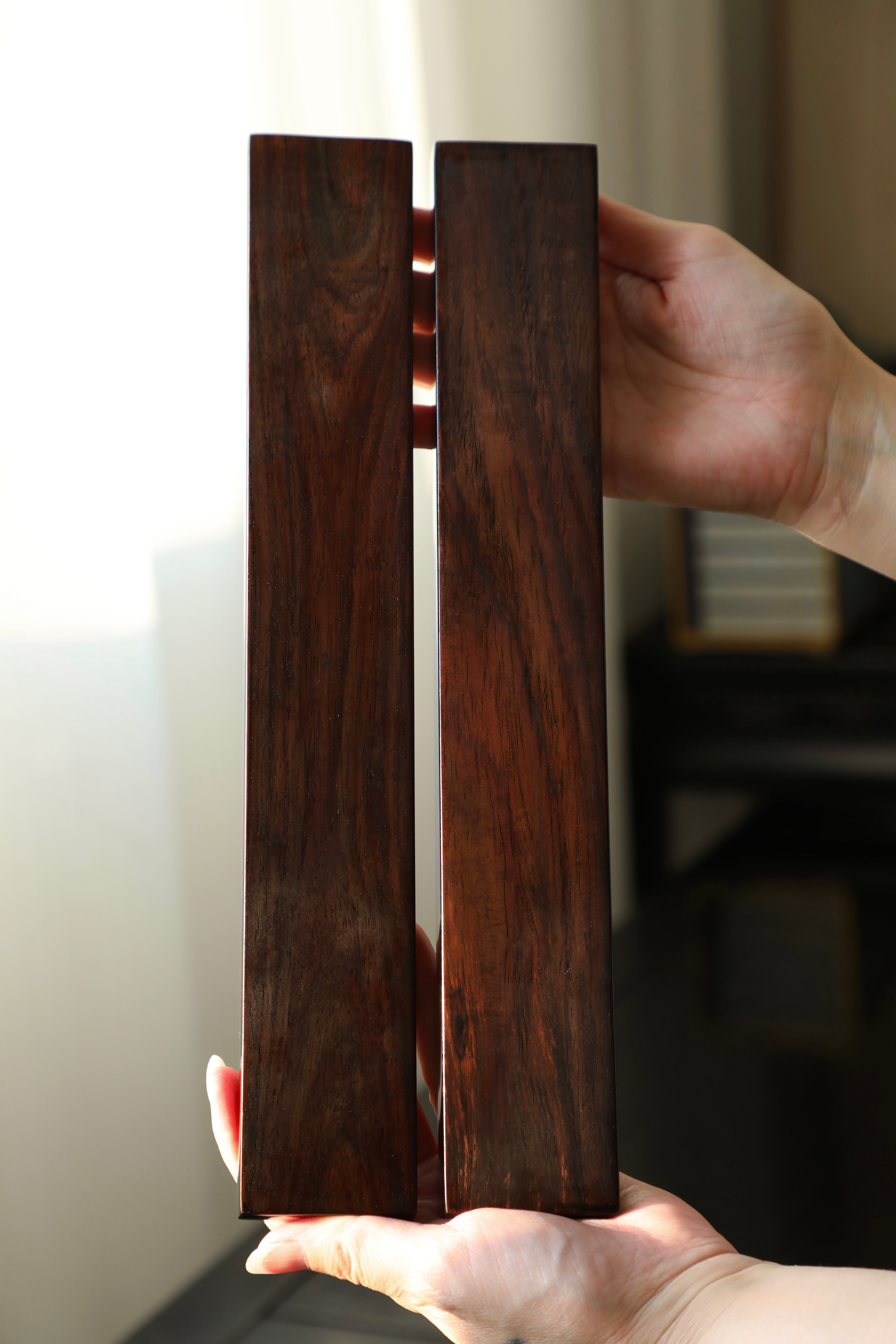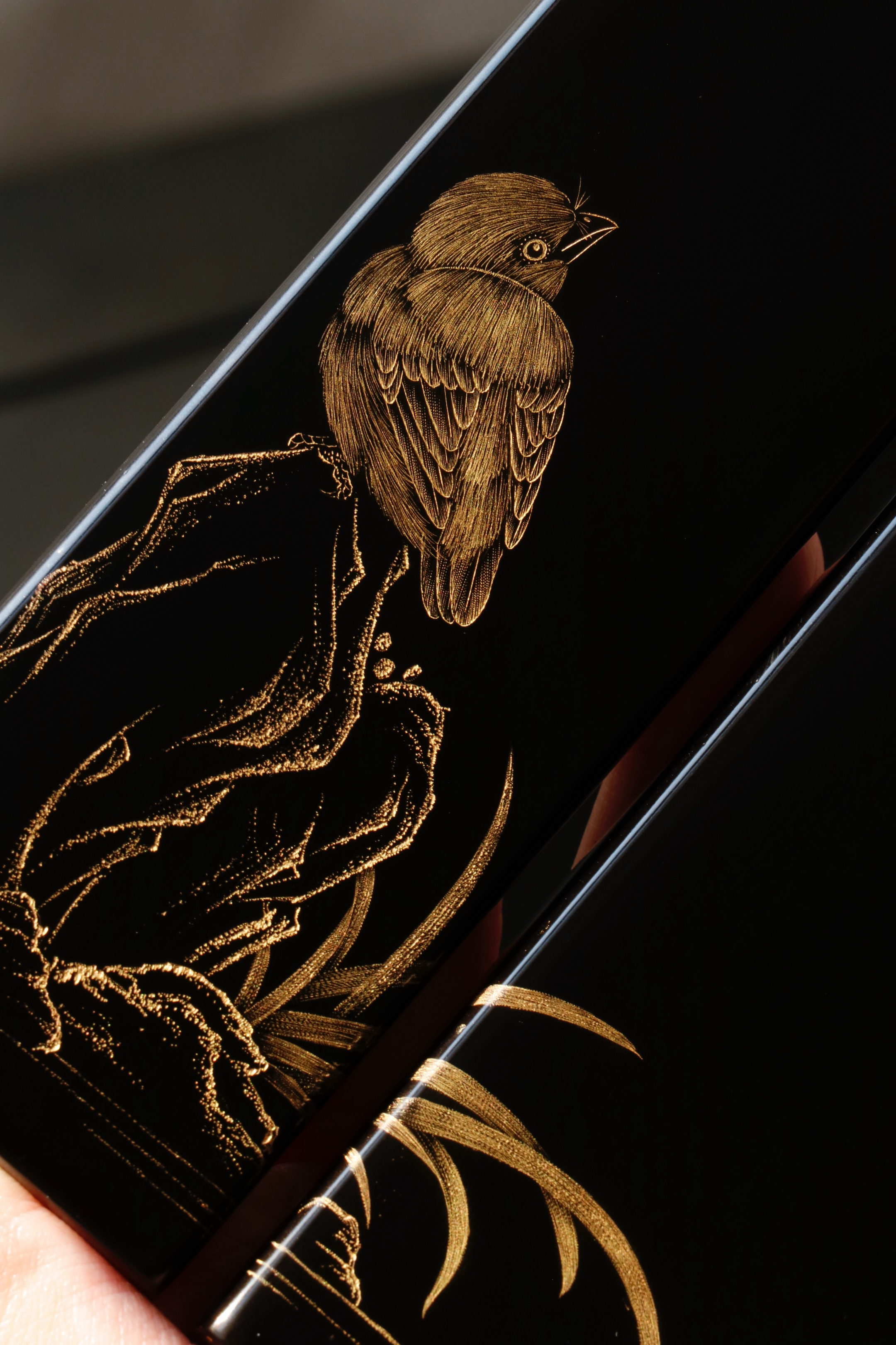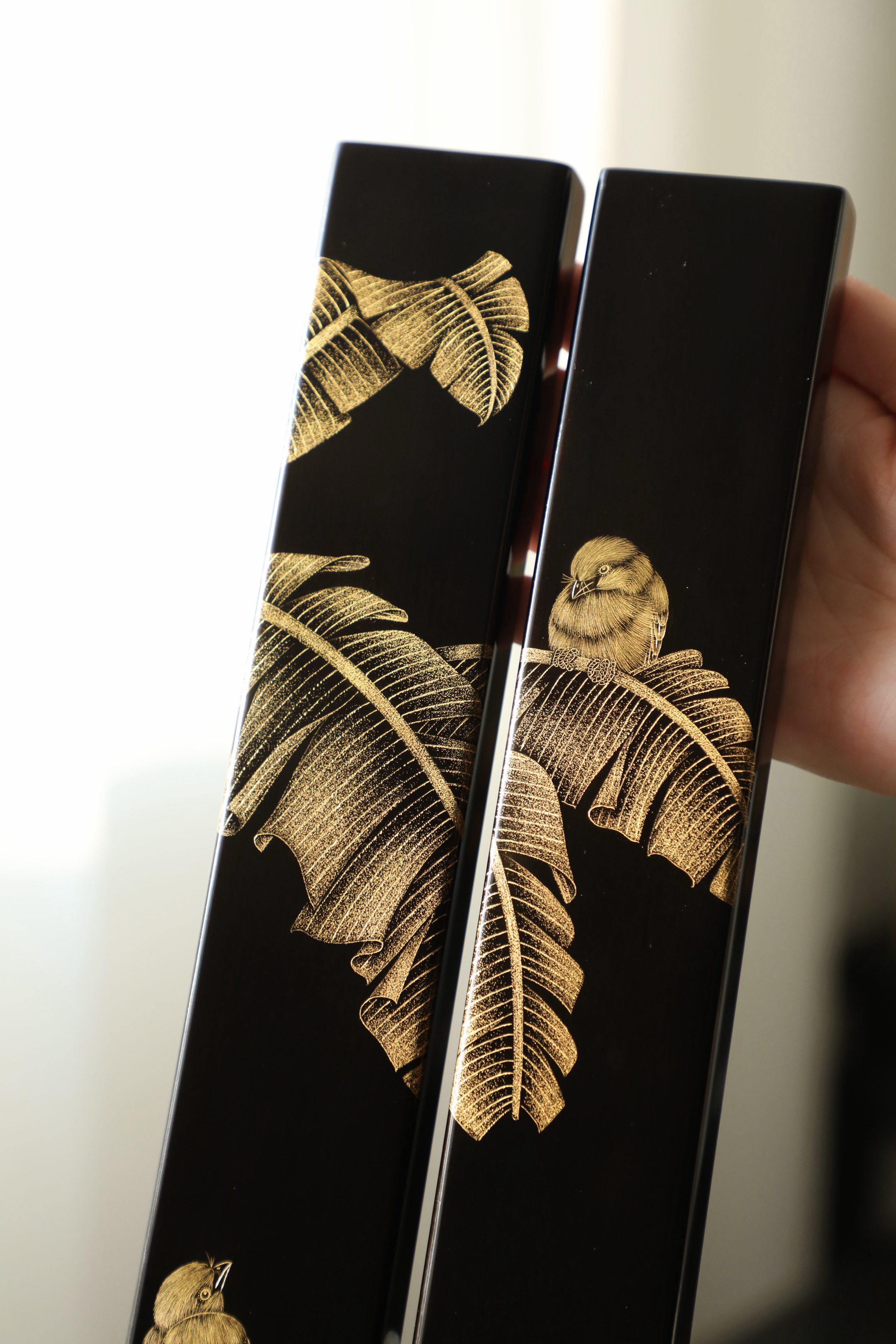大红酸枝戗金 | 蕉雀图 镇尺精选老料制作,戗金绘就蕉叶舒展,线条柔婉逸丽,双鹊雀顾盼回首,构图别具一格,具有鲜丽清逸之气,堪称文房妙物30.5*4.7*2cm 重550克