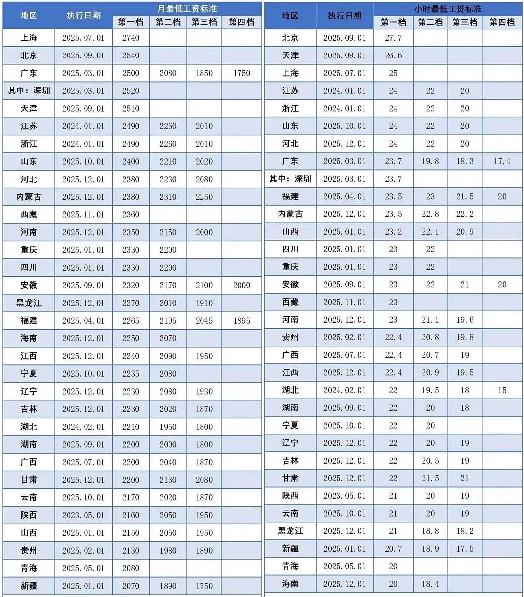 各省规定的最低工资和最低时薪