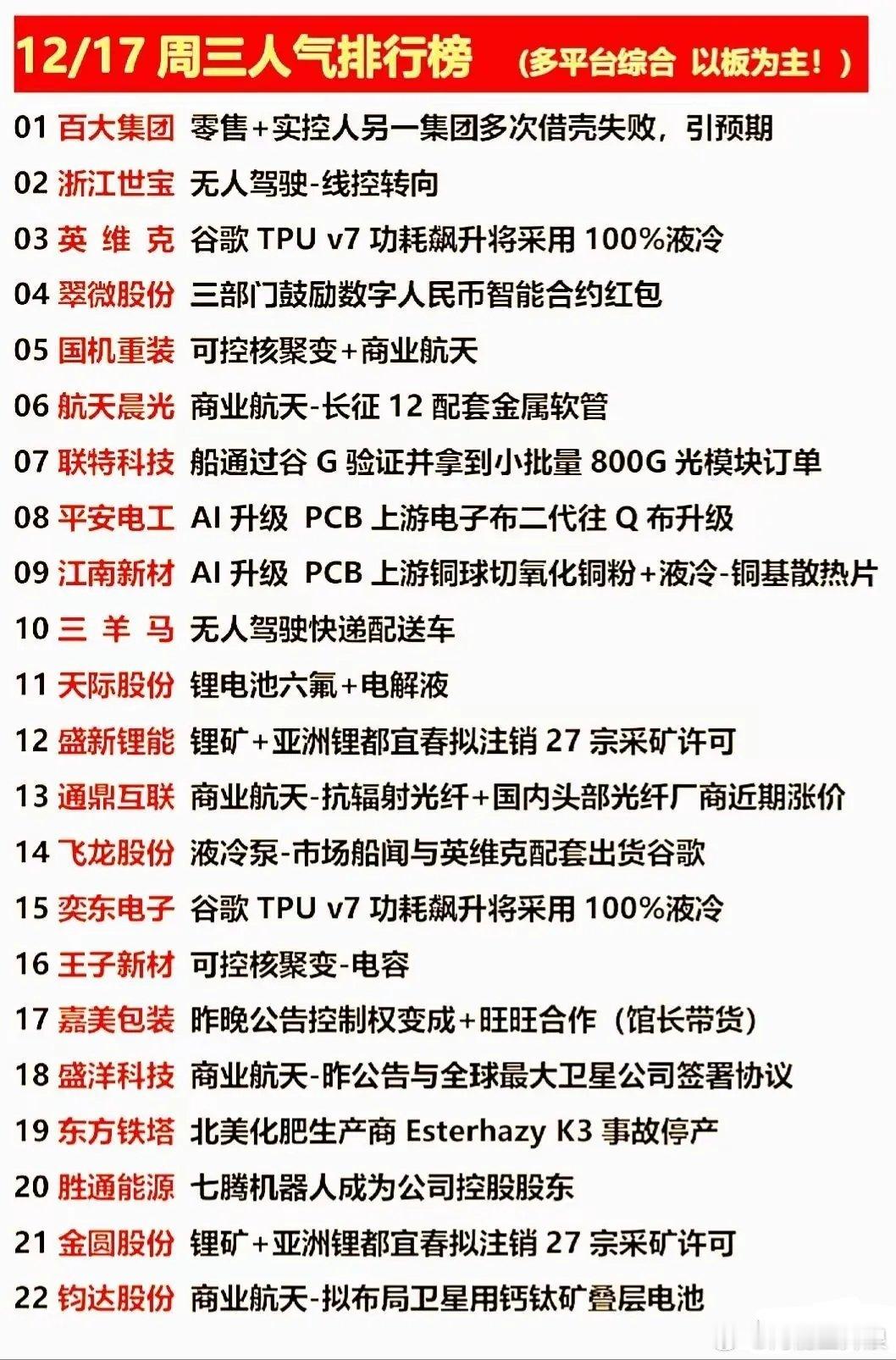 12/17周三人气排行榜梳理本次梳理涵盖零售、无人驾驶、算力硬件、数字人民币、可控核聚变、商业航天、锂电等多元赛道,个股催化逻辑以实控人预期、技术升级、订单落地、政策利好、产业事件为主。算力液冷、商业航天、锂电资源、无人驾驶成为核心热点方向,反映市场围绕产业趋势与突发事件进行标的筛选,事件驱动型标的获得较高关注度。个股梳理分析百大集团:主营零售业务,核心催化来自实控人另一集团多次借壳失败引发的借壳预期,市场对其资本运作可能性产生想象,成为零售板块人气标的,借壳预期成为股价核心驱动点。浙江世宝:聚焦无人驾驶领域的线控转向技术,是无人驾驶底盘核心部件供应商,线控转向作为无人驾驶关键技术,行业发展提速下公司业务迎来发展机遇,获市场重点关注。英维克:因谷歌TPU v7功耗飙升将采用100%液冷技术,公司是液冷散热核心企业,产品适配谷歌算力硬件需求,液冷技术的规模化应用预期推动其成为算力板块人气标的。翠微股份:受益于三部门鼓励数字人民币智能合约红包的政策利好,公司布局第三方支付与数字人民币业务,政策推动下数字人民币应用场景扩容,公司业务迎来发展红利。国机重装:布局可控核聚变与商业航天两大前沿赛道,可控核聚变技术研发与商业航天装备配套业务兼具技术壁垒与成长空间,双赛道布局使其获得市场高关注度。航天晨光:聚焦商业航天领域,为长征12火箭配套金属软管,是航天装备核心配套企业,长征系列火箭的研发与发射推进,带动公司配套产品需求,成为商业航天人气标的。联特科技:光模块业务取得突破,通过谷歌验证并拿到小批量800G光模块订单,800G光模块是算力网络核心部件,订单落地验证公司技术实力,获市场资金青睐。平安电工:受益于AI升级趋势,其PCB上游电子布二代向Q布升级,电子布是PCB核心原材料,技术升级契合AI硬件对高端材料的需求,成为PCB上游人气标的。江南新材:布局AI升级相关的PCB上游铜球、氧化铜粉业务,同时涉及液冷铜基散热片,业务覆盖AI硬件原材料与算力液冷配套,多赛道布局使其获得市场关注。三羊马:聚焦无人驾驶快递配送车领域,是物流与无人驾驶结合的标的,无人驾驶在物流配送场景的商业化落地提速,公司业务契合行业发展趋势,成为人气标的。天际股份:主营锂电池六氟磷酸锂与电解液产品,是锂电池电解液核心原材料供应商,新能源电池产业的高景气度带动其产品需求,成为锂电板块人气标的。盛新锂能:拥有锂矿资源,且受亚洲锂都宜春拟注销27宗采矿许可的事件影响,锂矿供给端收缩预期推升锂资源价值,公司锂矿业务受益于行业供需格局变化。通鼎互联:布局商业航天抗辐射光纤业务,同时国内头部光纤厂商近期涨价,公司光纤业务既受益于商业航天的技术需求,又承接光纤行业涨价红利,双重利好推升人气。飞龙股份:主营液冷泵产品,市场传闻其与英维克配套出货给谷歌,液冷泵是算力液冷系统核心部件,与谷歌算力硬件的配套预期,使其成为算力液冷板块人气标的。奕东电子:因谷歌TPU v7功耗飙升将采用100%液冷技术,公司液冷相关产品适配谷歌算力硬件需求,算力液冷的技术升级与规模化应用,推动公司业务获得市场关注。王子新材:布局可控核聚变领域的电容产品,电容是可控核聚变设备的核心元器件,可控核聚变技术研发推进下,公司核心产品需求有望提升,获市场重点关注。嘉美包装:发布公告披露控制权变更,且与旺旺达成合作并开启馆长带货模式,控制权变更带来资本运作预期,与旺旺的合作则有望推动业绩改善,双重利好推升人气。盛洋科技:公告与全球最大卫星公司签署合作协议,布局商业航天卫星通信相关业务,合作协议落地验证公司在商业航天领域的业务拓展能力,成为板块人气标的。东方铁塔:受益于北美化肥生产商Esterhazy K3事故停产的事件,化肥行业供给端收缩推升产品价格,公司布局化肥业务,行业价格上涨有望带动其业绩改善。胜通能源:公告七腾机器人成为公司控股股东,切入机器人赛道,机器人产业是高端制造核心方向,控股股东变更带来业务转型预期,获市场资金关注。金圆股份:拥有锂矿资源,受亚洲锂都宜春拟注销27宗采矿许可影响,锂矿供给收缩预期提升锂资源价值,公司锂矿开发业务的盈利潜力被市场看好。总结今日人气榜呈现热点分散但主线清晰的特征,算力液冷、商业航天、锂电资源、无人驾驶成为核心主线,个股驱动以事件、订单、政策、产业动态为主。市场更青睐有明确催化的细分赛道标的,技术升级与产业事件带来的业绩预期差,是资金布局的核心逻辑。