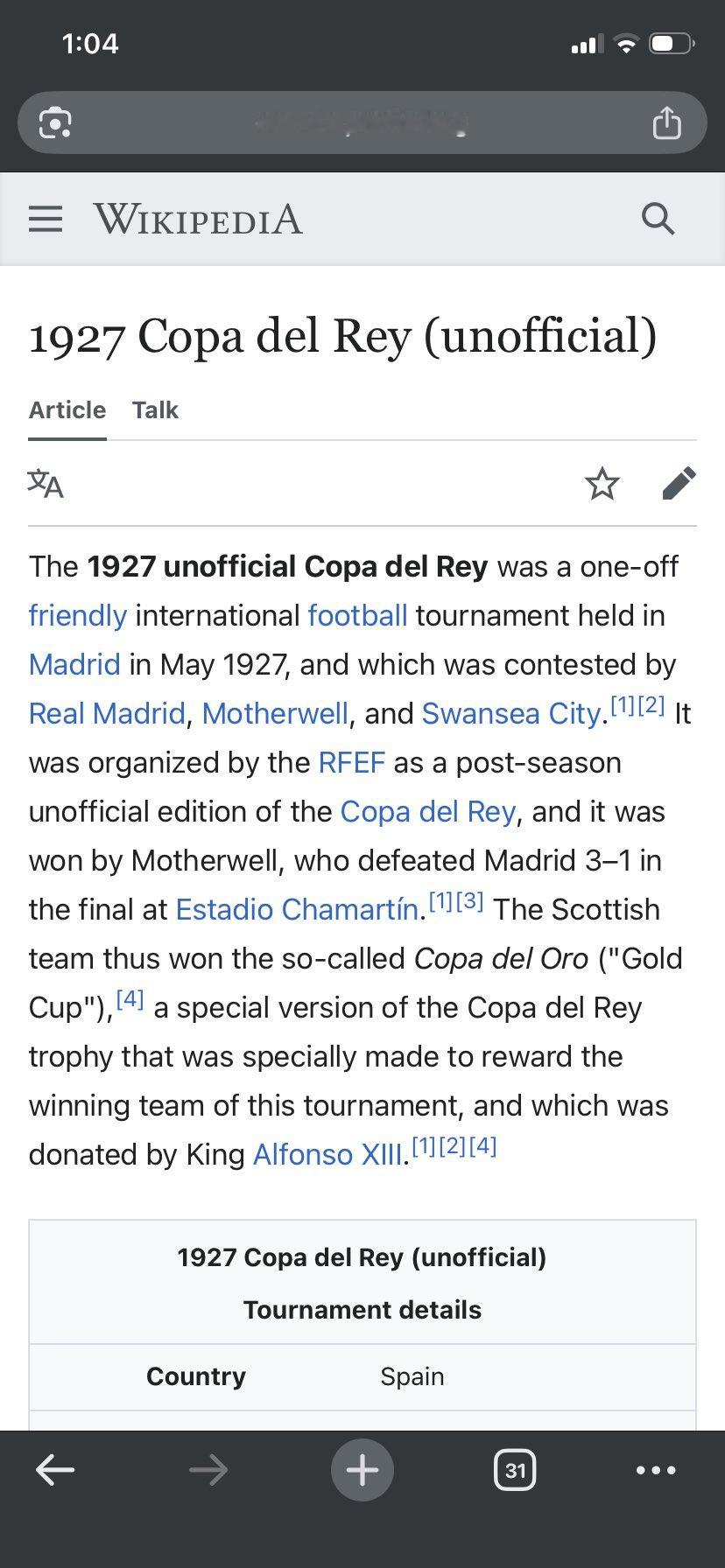 苏格兰俱乐部马瑟韦尔足球俱乐部赢得了1927年西班牙国王杯冠军。他们受邀参加了这项赛事,并在决赛中击败了皇家马德里。
