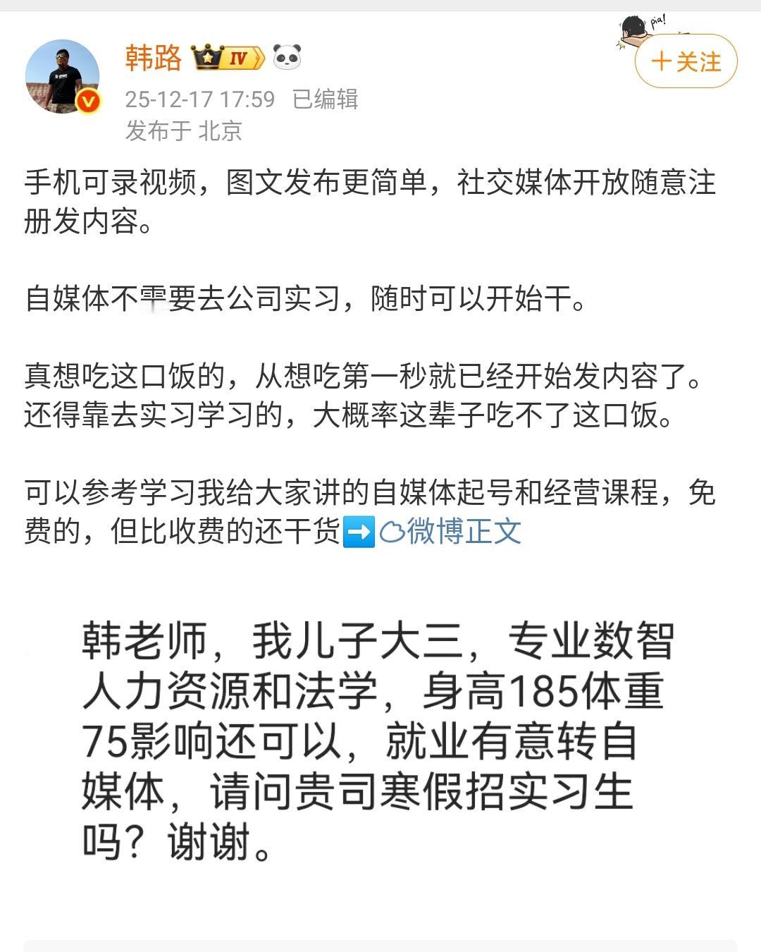 韩路说做自媒体,从想吃第一秒就已经开始发内容了!还得靠去实习学习的,大概率这辈子吃不了这口饭! 说的对,你都不发内容,你怎么会对自媒体这个东西感兴趣呢? 自媒体这个东西说白了,就是自己的见解和内容有人看,自己就能得到相关的收益,只要内容大家喜欢看就可以了,就是这么简单 。