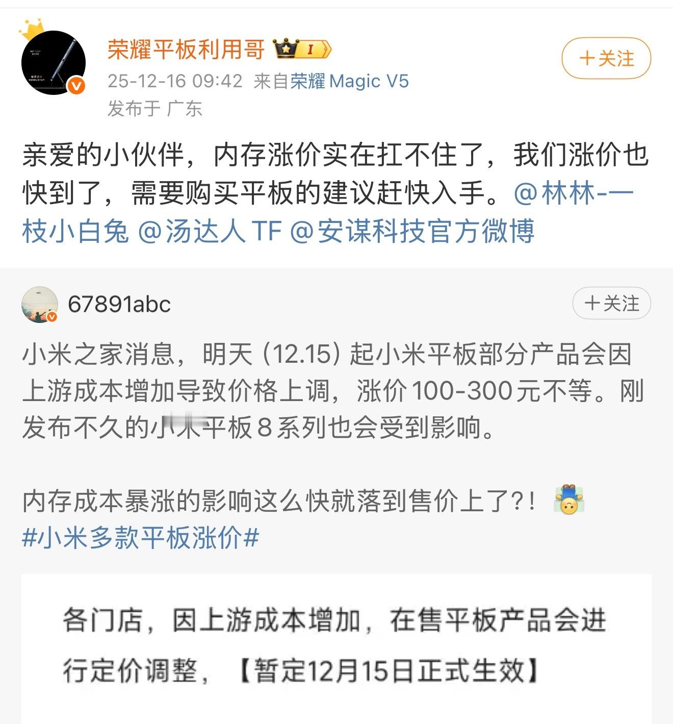 这波等等党输了,内存还在持续涨价,继小米平板涨价之后,也表示,后续荣耀平板也会涨价,内存涨价压力太大了。买平板今年其实是个不错机会,特别是像荣耀MagicPad 3 Pro这种高性能旗舰平板,最强第五代骁龙8至尊版处理器,目前独一份。