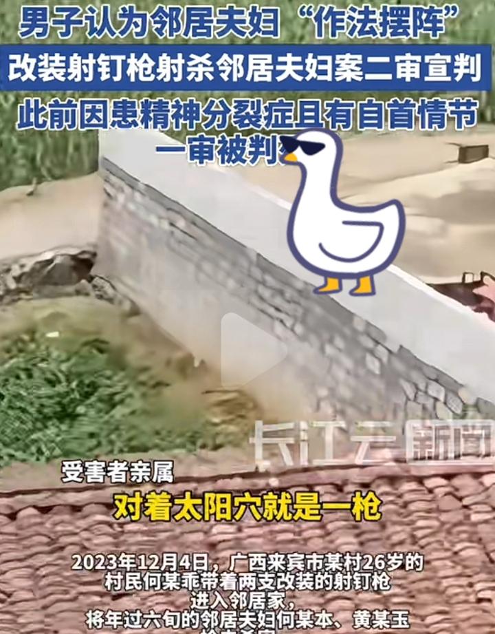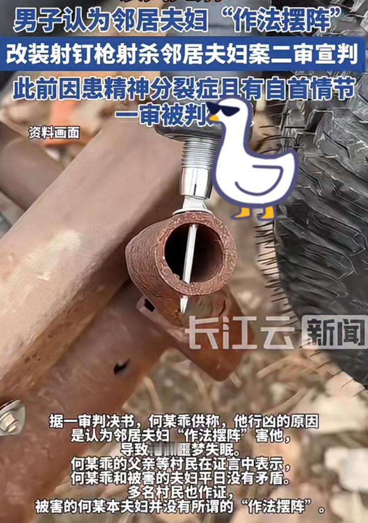 26岁男子何某乖因怀疑邻居做法摆阵,导致他无法安心入睡且连续多日做噩梦,于是非法改装射钉枪悄悄潜入该邻居家,据家属女儿介绍他对着自己的双亲太阳穴射击,随后立刻离开,当时的日期是2023年12月4日,其邻居夫妇已经年过六旬,据村民事后介绍,那邻居夫妇根本没做过,什么所谓的做法摆阵一切都是何某乖自己臆想的,后来因为其主动自首且患有精神类疾病一审判决缓刑一年后执行,家属不服提出二审,在2025年12月17日二审宣判,此人并不符合所谓的精神类疾病赦免资格,遂该为立即执行不得缓刑。 能改装射钉枪的26岁年轻人应该是智商超群才对,很多人根本就不会用射钉枪更别说改装了,射钉枪的原理必须顶住坚硬的物体后,才有发射的力量,以前在一家做栈板的工厂见过一次,那个款式像机枪一样看上去很威猛的,一枚钉子在它的座力下,瞬间可以穿透5厘米的木板而且可以连续作业,就像真的在射击一样刺激,不过工厂规定只能在工作时间.工作区域才可以使用该工具,不得擅自带出车间,如果违反规定立即开除,一点挽救的机会都没有,目的就是想很好的管控一些危险类工具,最为一家小型企业还是担当了应该有的社会责任,其实对每个人而言,当你明白责任的意义时或许才能真正的成长,不要故步自封狭隘的处理问题,像企业一样严格约束私人情绪臆想,让一切在安定祥和中稳固发展,对于自己的情绪化通过心理医生进行良好的疏导,以前我也狭隘的激进过一次,就是喜欢了一个女孩,别人介绍的还没有见过,电话两个月后她忽然说要不就这样结束了吧!祝你愉快,我一时如风中风铃一样脚底踏空手足无措,只能在网吧酒精中度日,还时不时的给她打电话,每次都是无人接听,只到有一天在网上遇到了一位女心理专家,我跟她说了我的情况,她略微沉思了一会说:你这属于轻微的自我臆想,你们都没有见过哪来的深厚感情,你不停的打电话是跟自己过不去,而不是和那个女生过不去,试着一天不打两天不打三天不打,坚持一个礼拜你会发现就算是她打给你也不想接了,按照她说的我坚持了七天,果然如此,有些事还得需要文化啊!不是说她们多么的厉害,而是把问题掰开了揉碎了,做出一个对自己最有利的选择,任何时候都要有爱自己的想法,而不是伤害自己的想法,所以当你痛苦的时候不妨换个对方的角度看问题,那么很多棘手的事情就能很快迎刃而解,不在纠结所谓的得失,而是继续前行寻找属于自己的光芒。