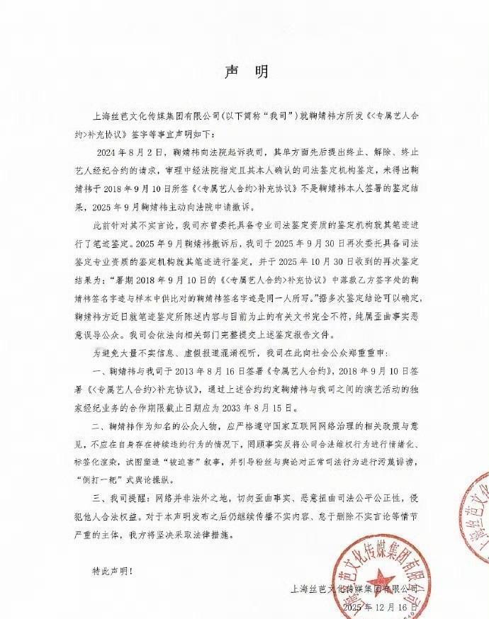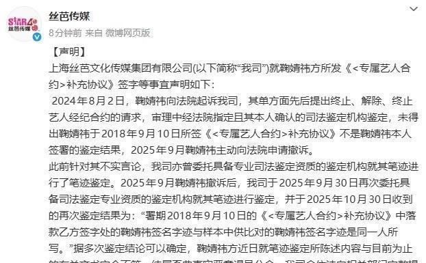她把“伪造签名”四个字甩到所有人脸上。 八个月后,公司釜底抽薪。 今天,丝芭传媒晒出了一份2018年9月10日的笔迹鉴定报告。 白纸黑字,司法鉴定结论就一句话:合约上的签名,就是鞠婧祎本人写的。 你记得这场拉扯持续了数月。 她质疑,公司沉默。 直到这份报告把皮球踢了回来。 专业机构的鉴定,比的是笔画的起落、运笔的力度、连笔的习惯——这些细节骗不了机器,也骗不了法律。 一场罗生门,眼看就要落幕。 公司用一纸报告封住了所有质疑的嘴。 而那个曾经最坚定的说法,此刻显得摇摇欲坠。 偶像和公司对峙,最后受伤的总是看戏的人。 信任一旦撕开,再完美的鉴定报告,也粘不回最初的样子。 这不是一场关于笔迹的鉴定,而是一场关于信任的拷问。