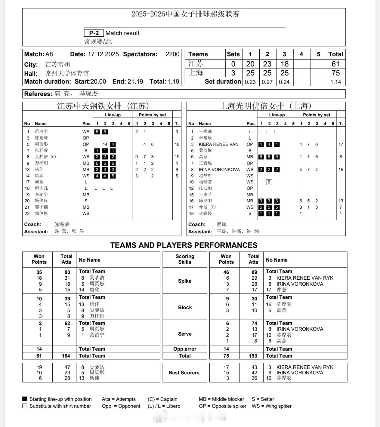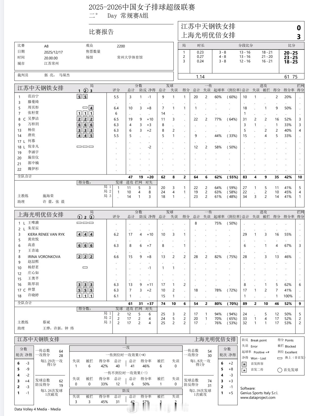 【技术统计】江苏女排0比3上海女排(20-25 23-25 18-25),陈厚羽3局6拦排超联赛2025-2026中国排球超级联赛