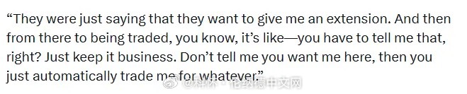 鲍威尔在节目中表示自己对于被快船交易感到“震惊”:“他们刚才还在说想跟我续约。然后就把我交易走了,这就像——你们得先跟我说清楚,对吧?应该公事公办吧。别跟我说想让我留在这,然后又莫名其妙把我交易走。”快船